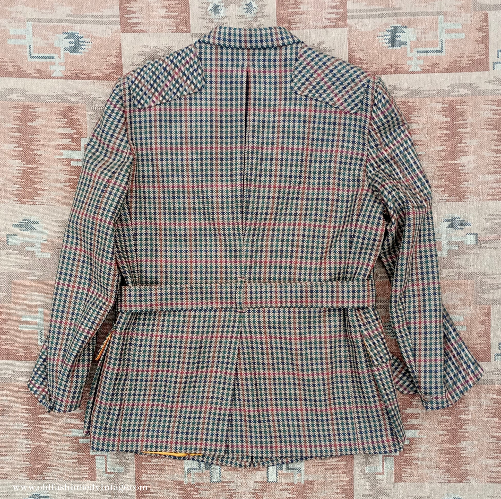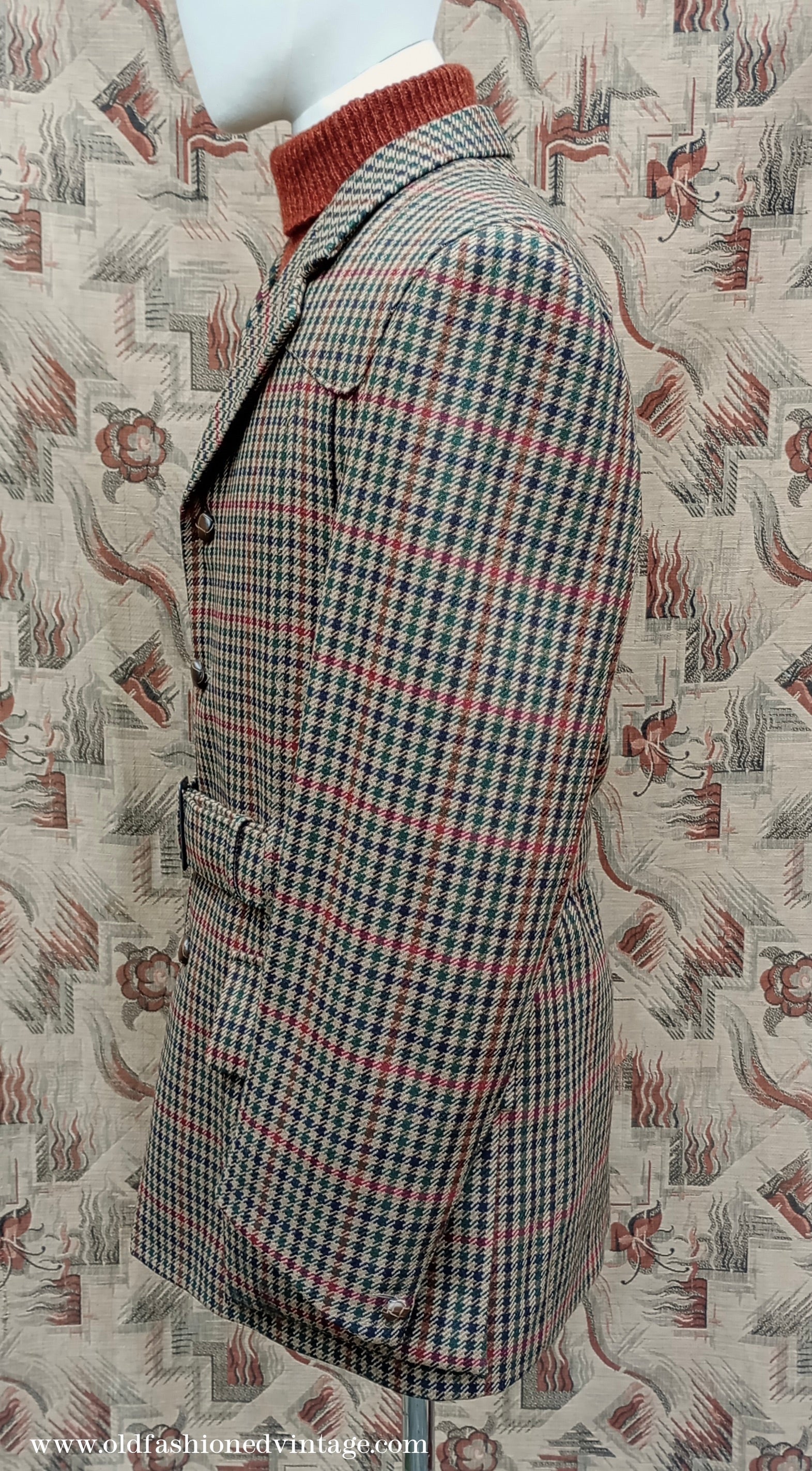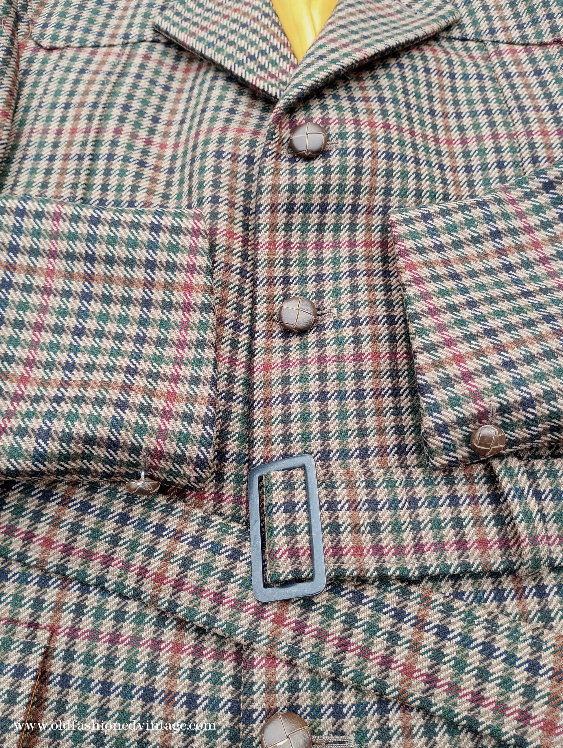 A very nice Norfolk type tweed country jacket, made by "John Brocklehurst" from pure wool Scottish cloth in a checked weave in shades of brown, sand, green, red & rust. Cut in a traditional style, single-breasted 4 button fastening, with lightly padded shoulders, notch lapels, double shoulder panels, strapping down the front, lower bellows pockets with flaps, rear centre inverted pleat & vent, full belt with metal buckle; fitted with leather 'football' buttons & fully lined in gold satiny fabric, 2 inside chest & one large poacher pockets.
