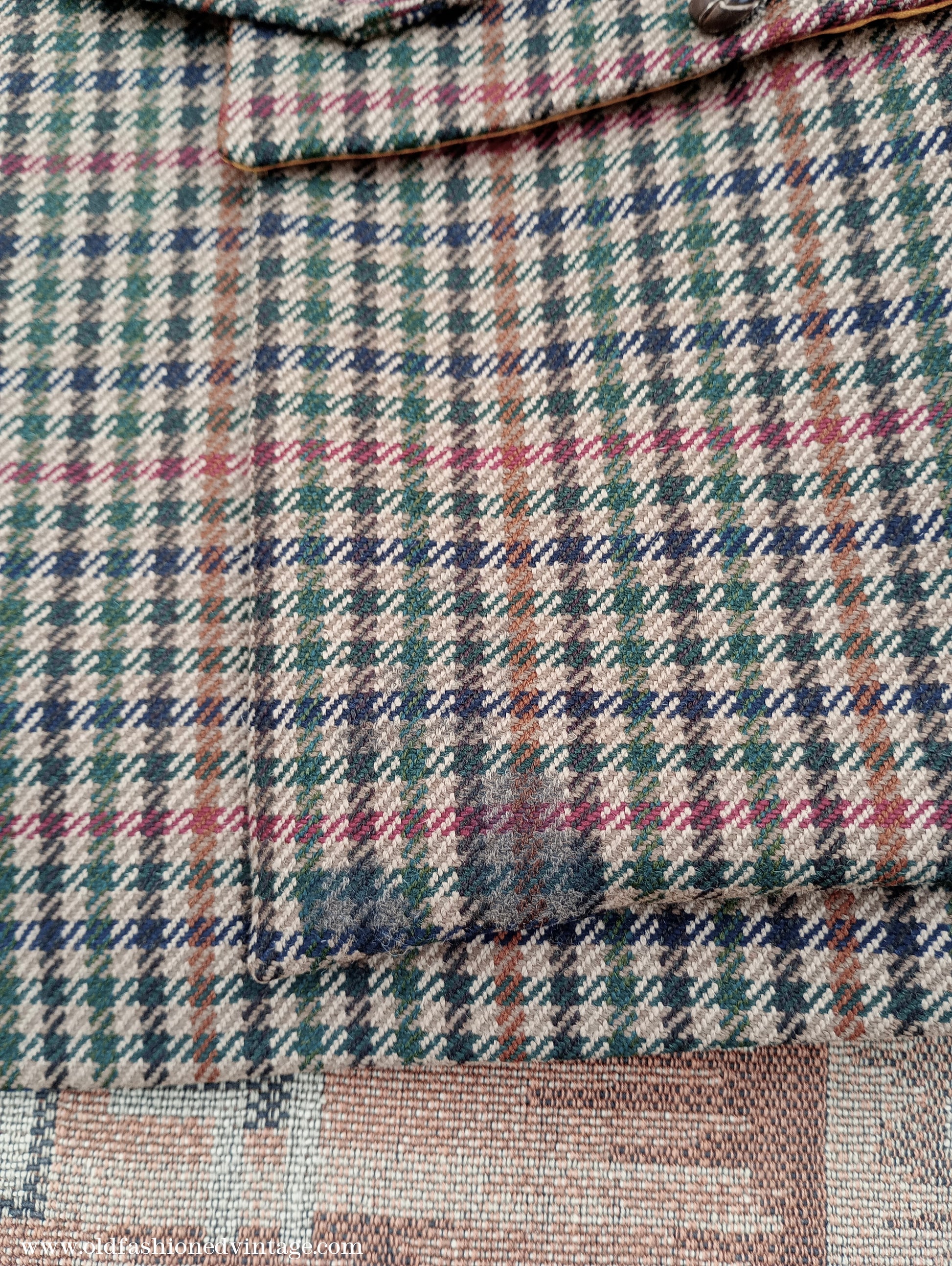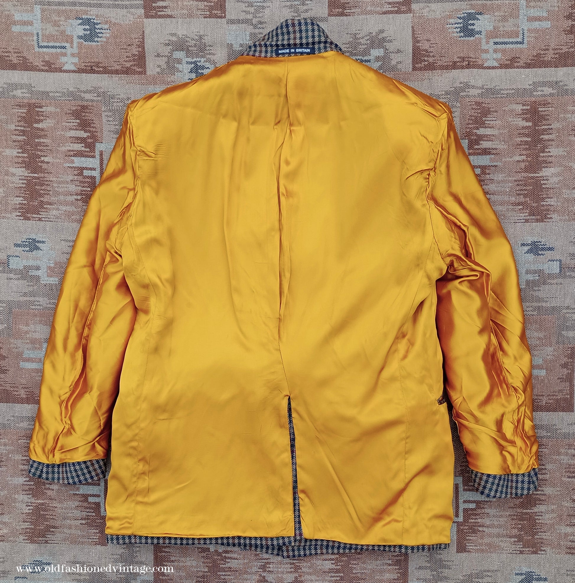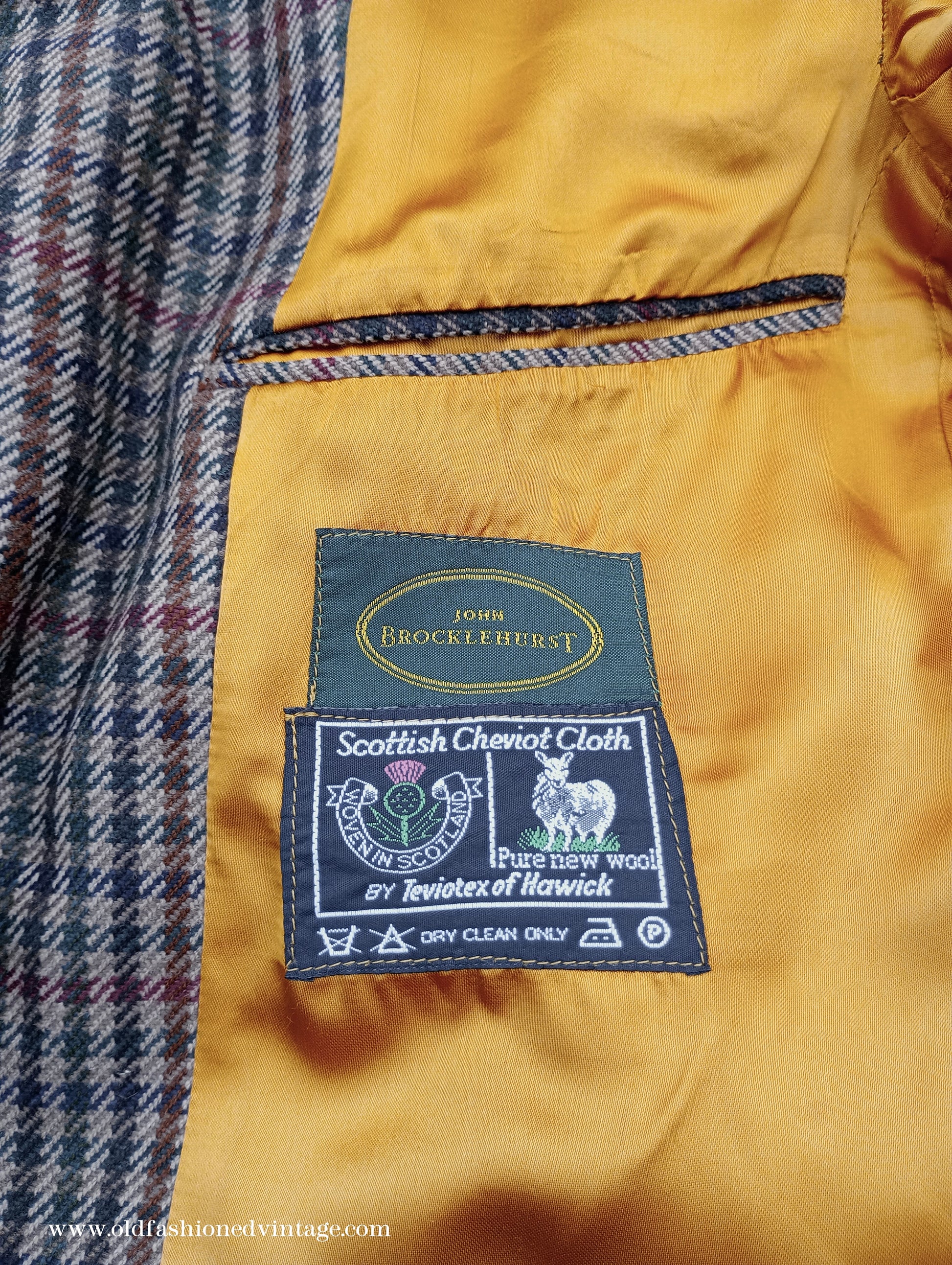 A very nice Norfolk type tweed country jacket, made by "John Brocklehurst" from pure wool Scottish cloth in a checked weave in shades of brown, sand, green, red & rust. Cut in a traditional style, single-breasted 4 button fastening, with lightly padded shoulders, notch lapels, double shoulder panels, strapping down the front, lower bellows pockets with flaps, rear centre inverted pleat & vent, full belt with metal buckle; fitted with leather 'football' buttons & fully lined in gold satiny fabric, 2 inside chest & one large poacher pockets.