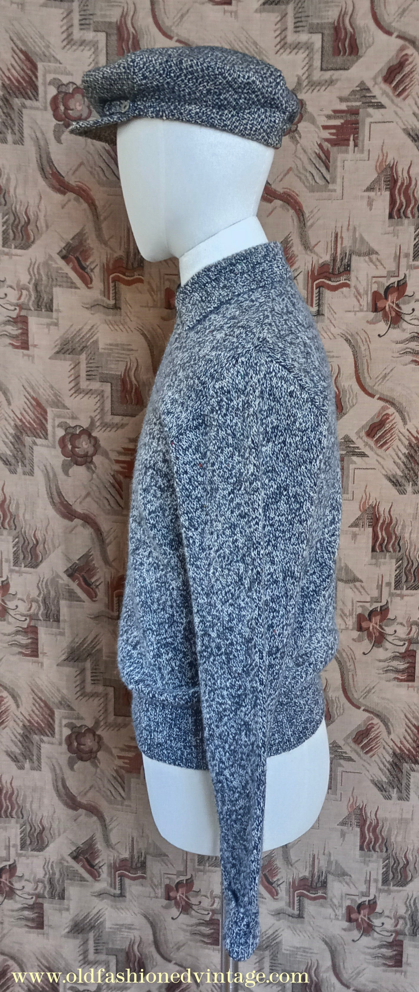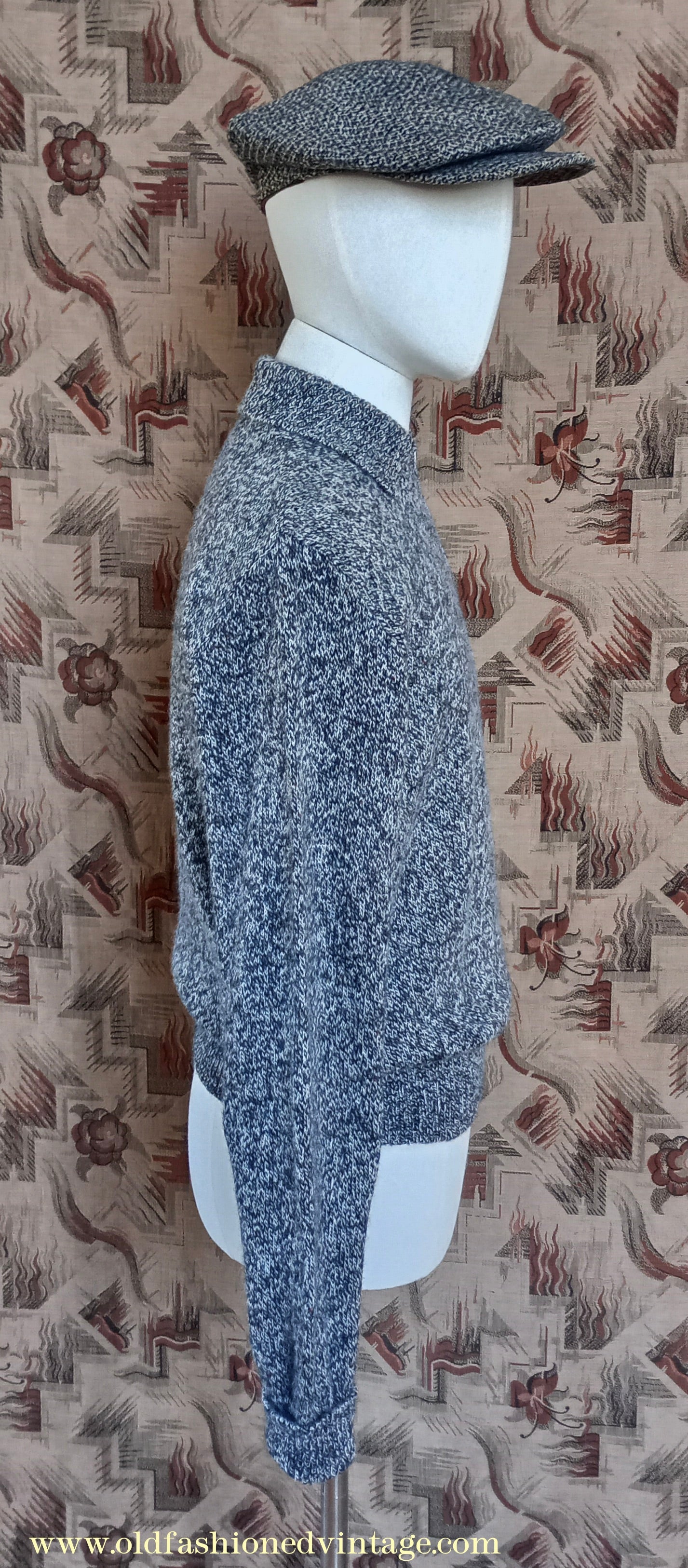 The ‘Old Fashioned Garments’ zip neck jumper is a vintage reproduction adapted from a 1940s Bestway ‘Man’s Lumber Jacket’ pattern, individually hand made by Rosie on a knitting machine using discontinued or end of line pure British wool 4-ply yarns which have been carefully chosen for their traditional appearance; thus each one is either unique or a very limited edition. This style of pullover was very popular from the 1930s to the 1950s, but originals are extremely difficult to find today, especially in wearable condition.