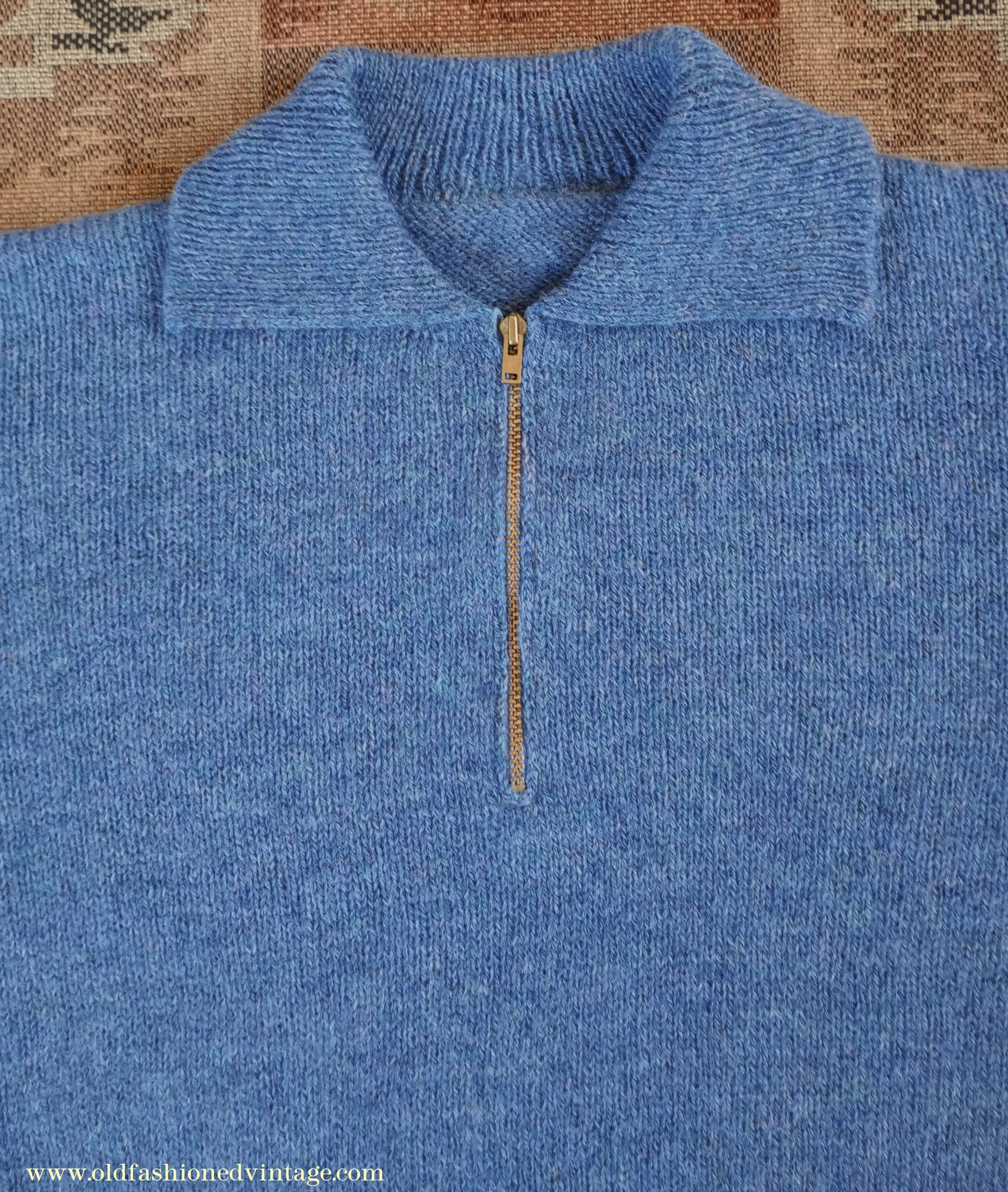 This example is in a marled Lovat blue colour; it is fitted with a new old stock 6" brass 'Lightning' zip. There is no more of this yarn, so it is a one-off.