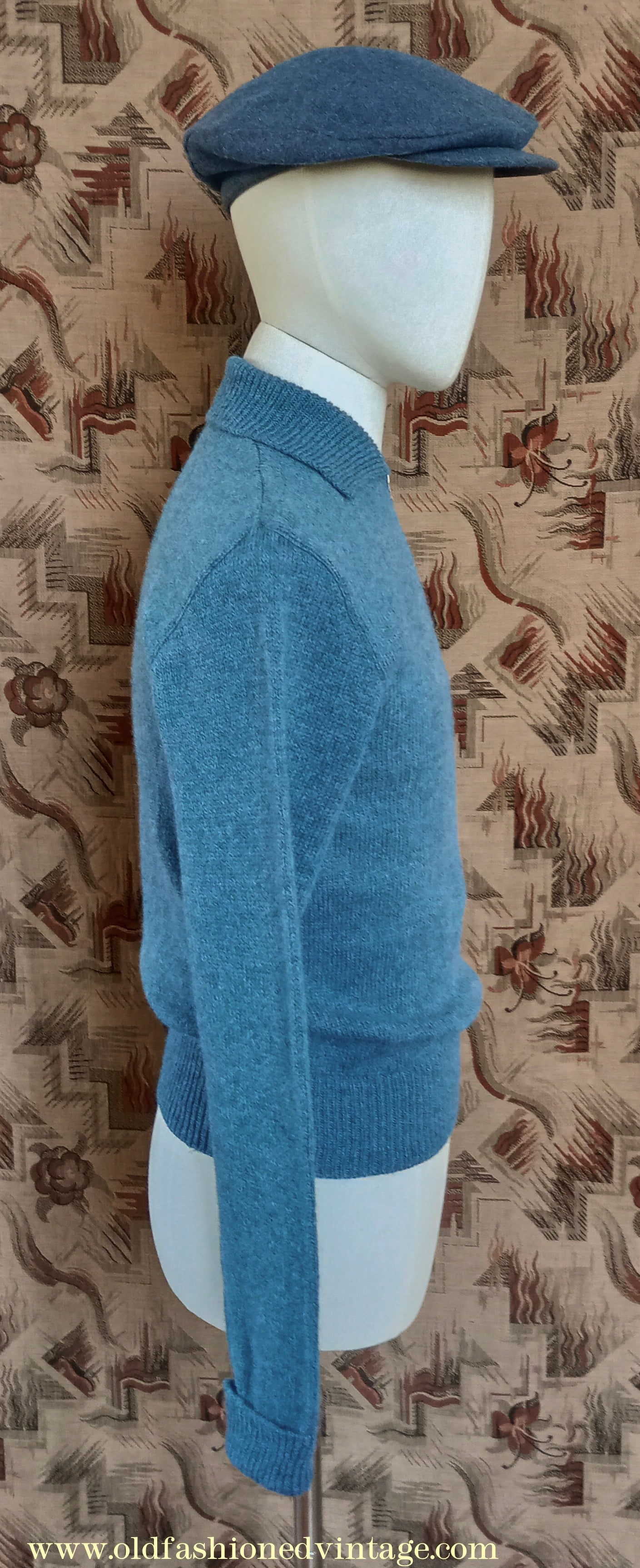 The ‘Old Fashioned Garments’ zip neck jumper is a vintage reproduction adapted from a 1940s Bestway ‘Man’s Lumber Jacket’ pattern. Each piece is individually hand made by Rosie on a manually operated knitting machine (sometimes referred to as ‘hand frame knitting’) using discontinued or end of line British wool medium-weight 4-ply yarns which have been carefully chosen for their traditional appearance; thus each one is either unique or a very limited edition. This style of pullover was very popular from the 1930s to the 1950s, but originals are extremely difficult to find today, especially in wearable condition.