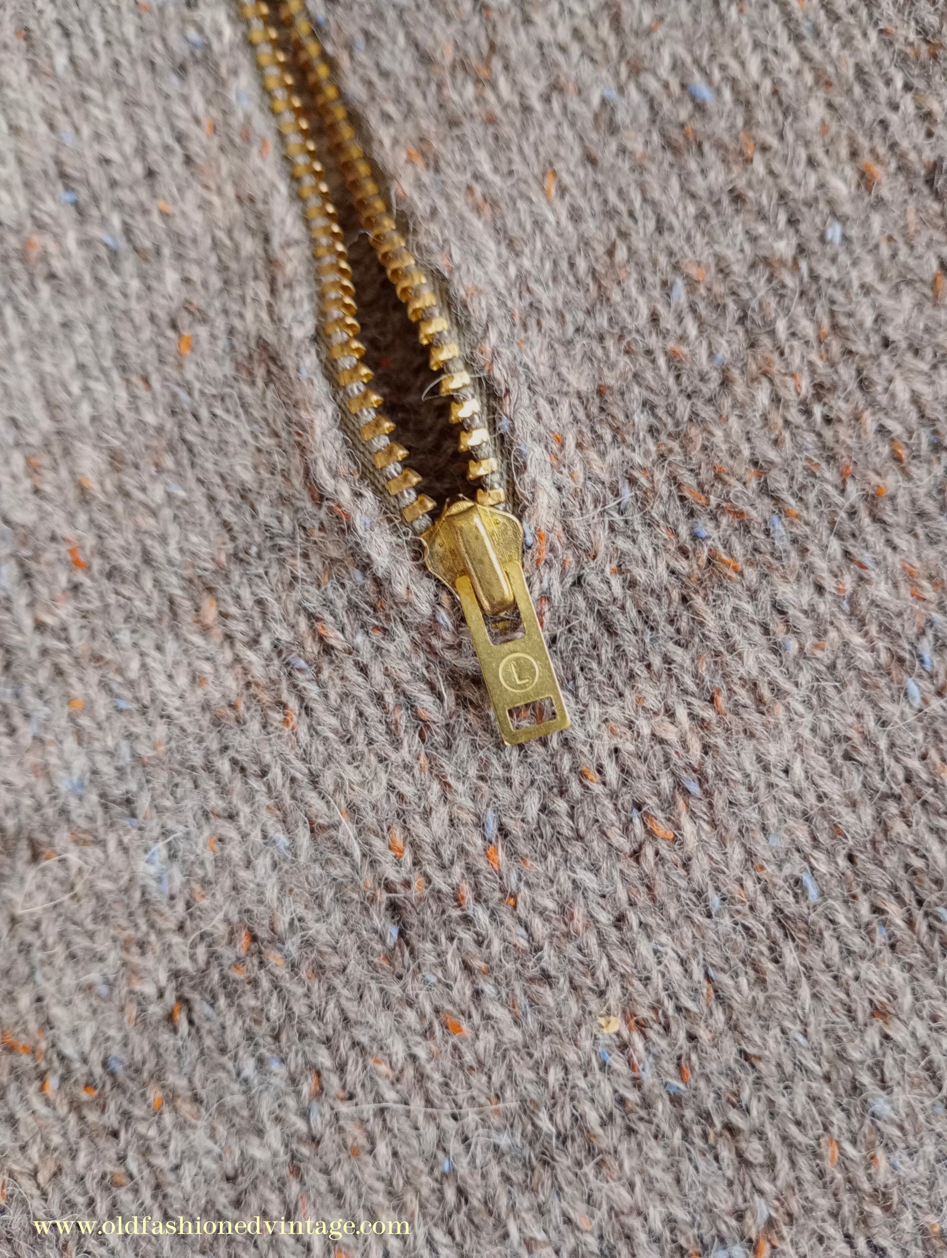 This one is in a marled taupe colour with scattered pale blue & orange flecks; it is fitted with a new old stock 6" brass 'Lightning' zip.
