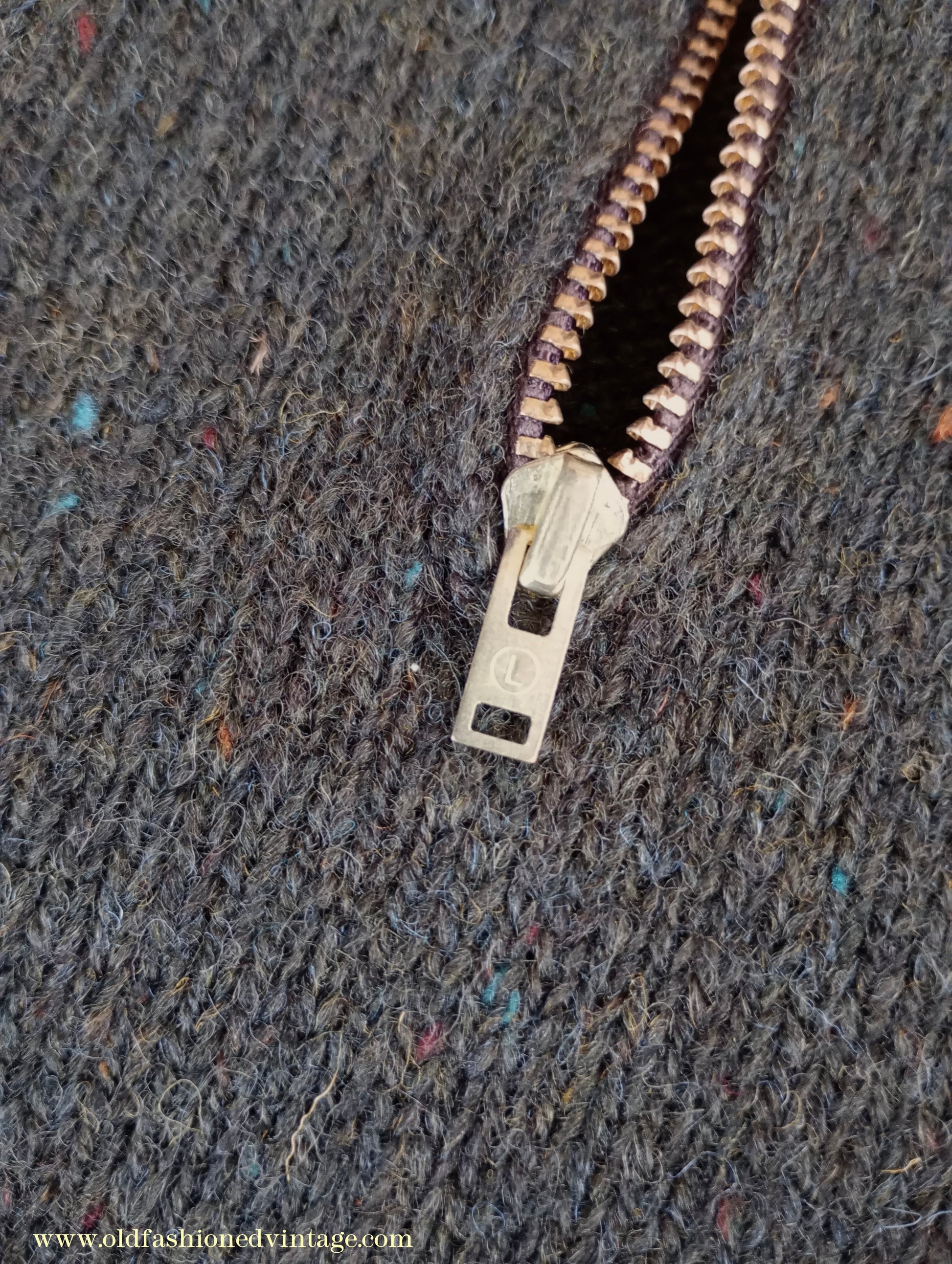 This one is in a marled loden green colour with scattered blue, rust & burnt orange flecks; it is fitted with a new old stock 6" brass 'Lightning' zip.
