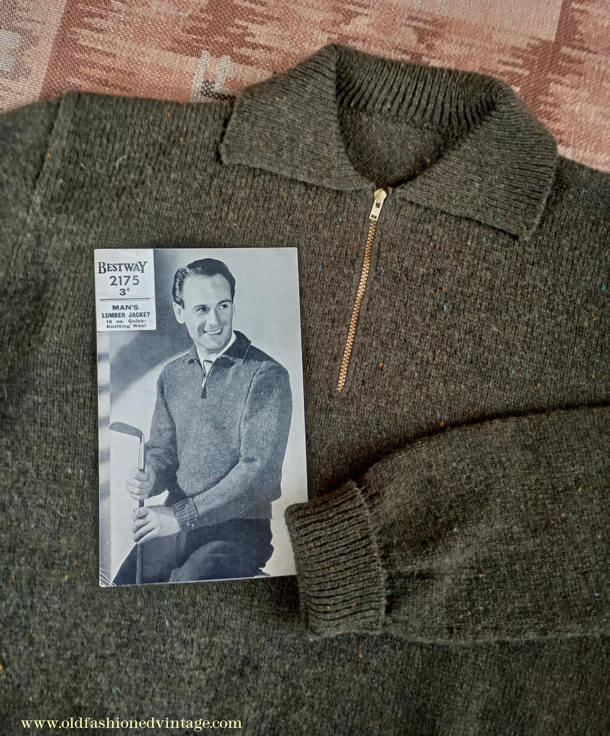 The ‘Old Fashioned Garments’ zip neck jumper is a vintage reproduction adapted from a 1940s Bestway ‘Man’s Lumber Jacket’ pattern. Each piece is individually hand made by Rosie on a manually operated knitting machine (sometimes referred to as ‘hand frame knitting’) using discontinued or end of line British wool 4-ply yarns which have been carefully chosen for their traditional appearance; thus each one is either unique or a very limited edition. This style of pullover was very popular from the 1930s to the 1950s, but originals are extremely difficult to find today, especially in wearable condition.