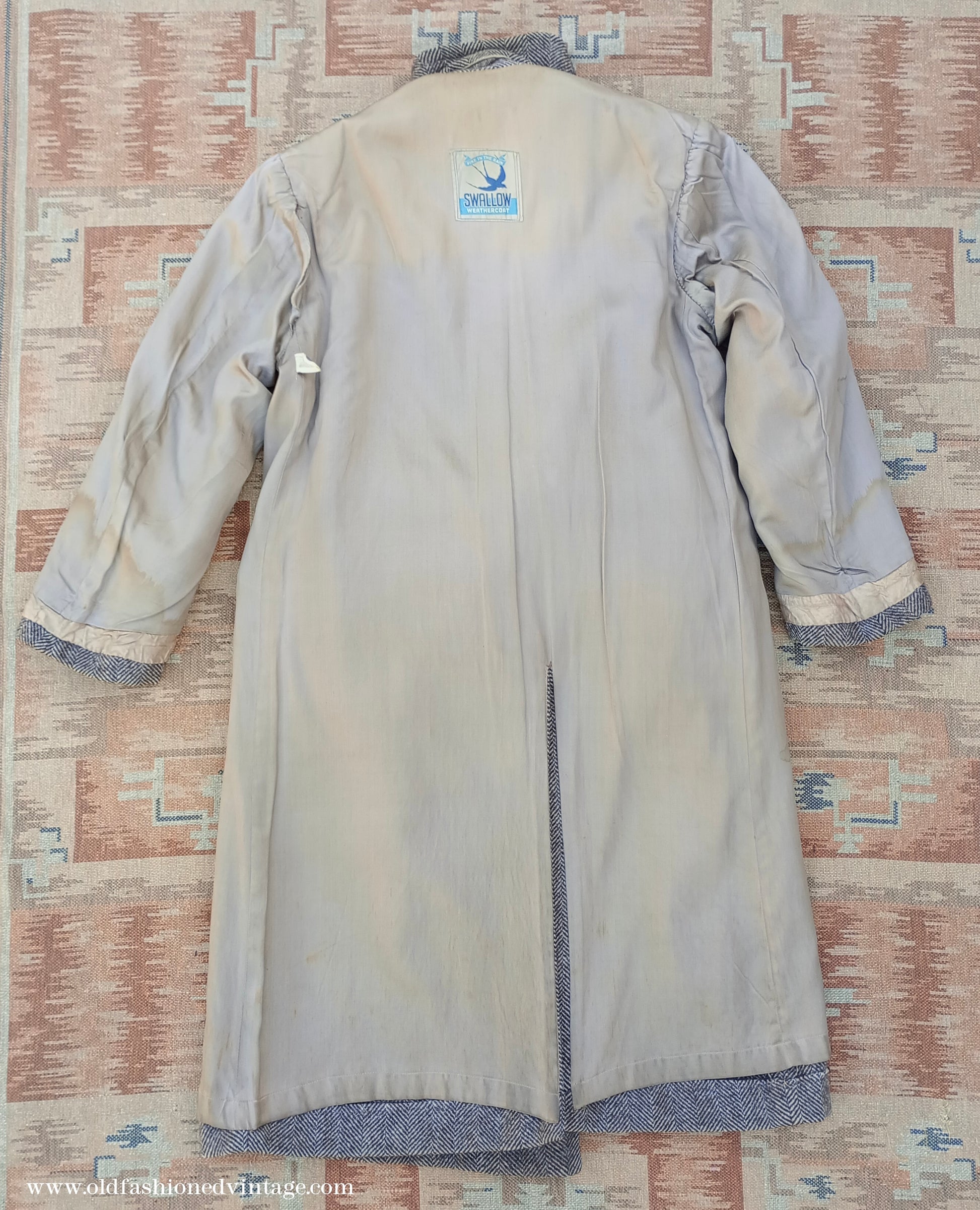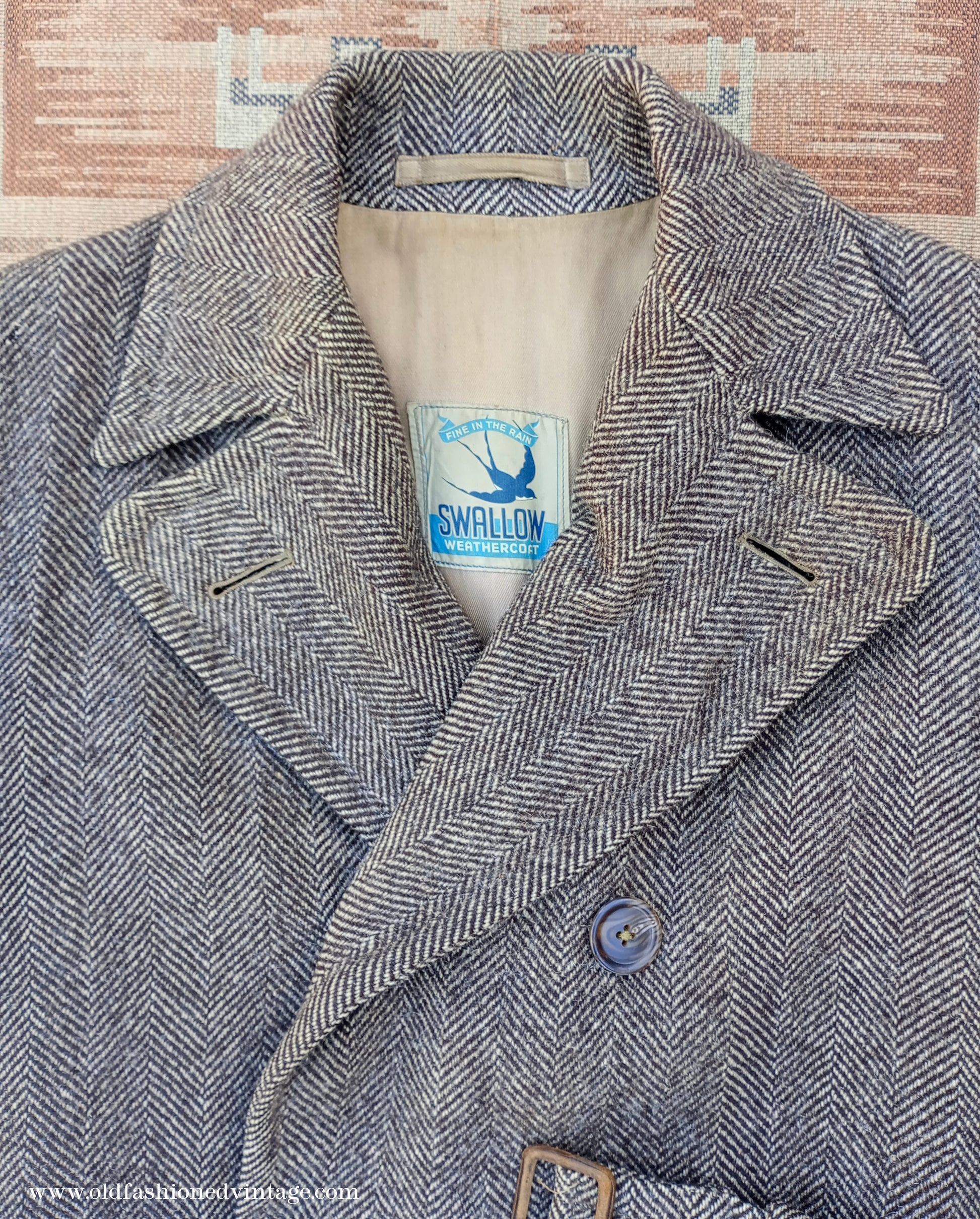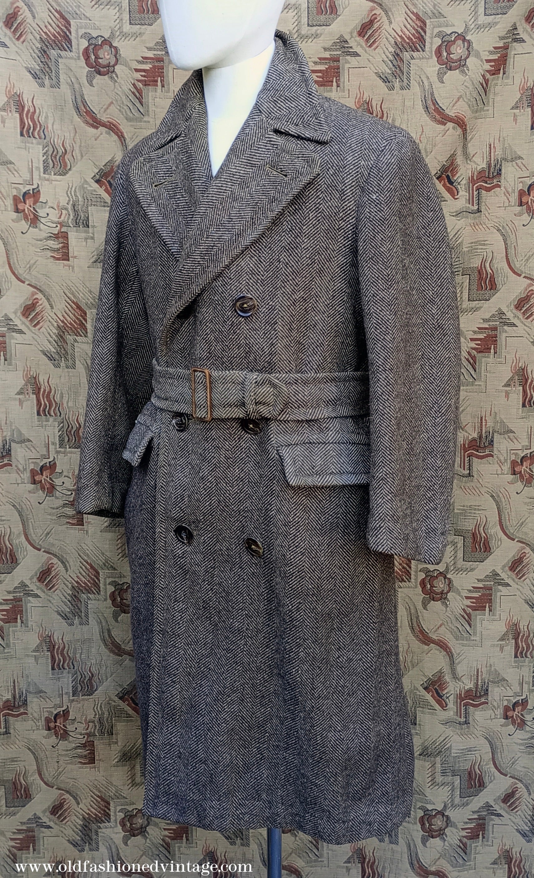 A vintage 1940s CC41 Utility Scheme labelled overcoat, made by 'Swallow' from a thick tweed wool herringbone weave cloth in variegated dark brown & natural beige. Cut in a classic double-breasted style with broad peaked lapels, 6 x 3 horn effect button fastening, medium-padded shoulders, 2 flapped lower pockets, & matching belt with leather covered buckle. Fully lined with gold-beige rayon twill fabric, with an inside breast & inside ticket pocket. Has a lovely graphic label of the type more usually fitted to raincoats by this maker; presumably austerity prevented printing a specific one.