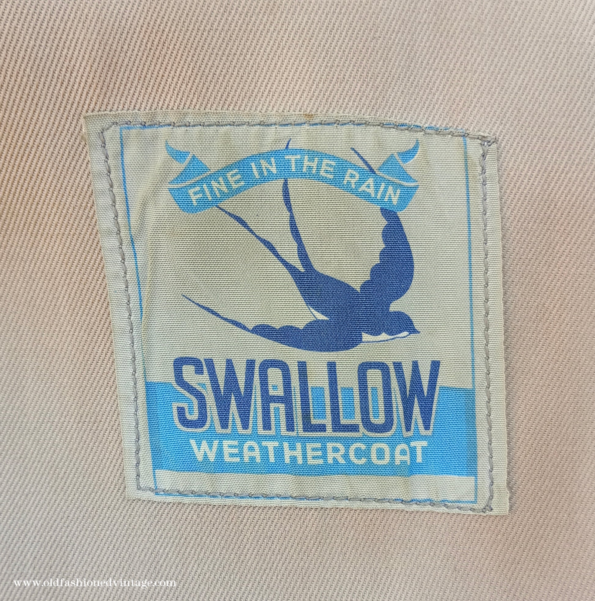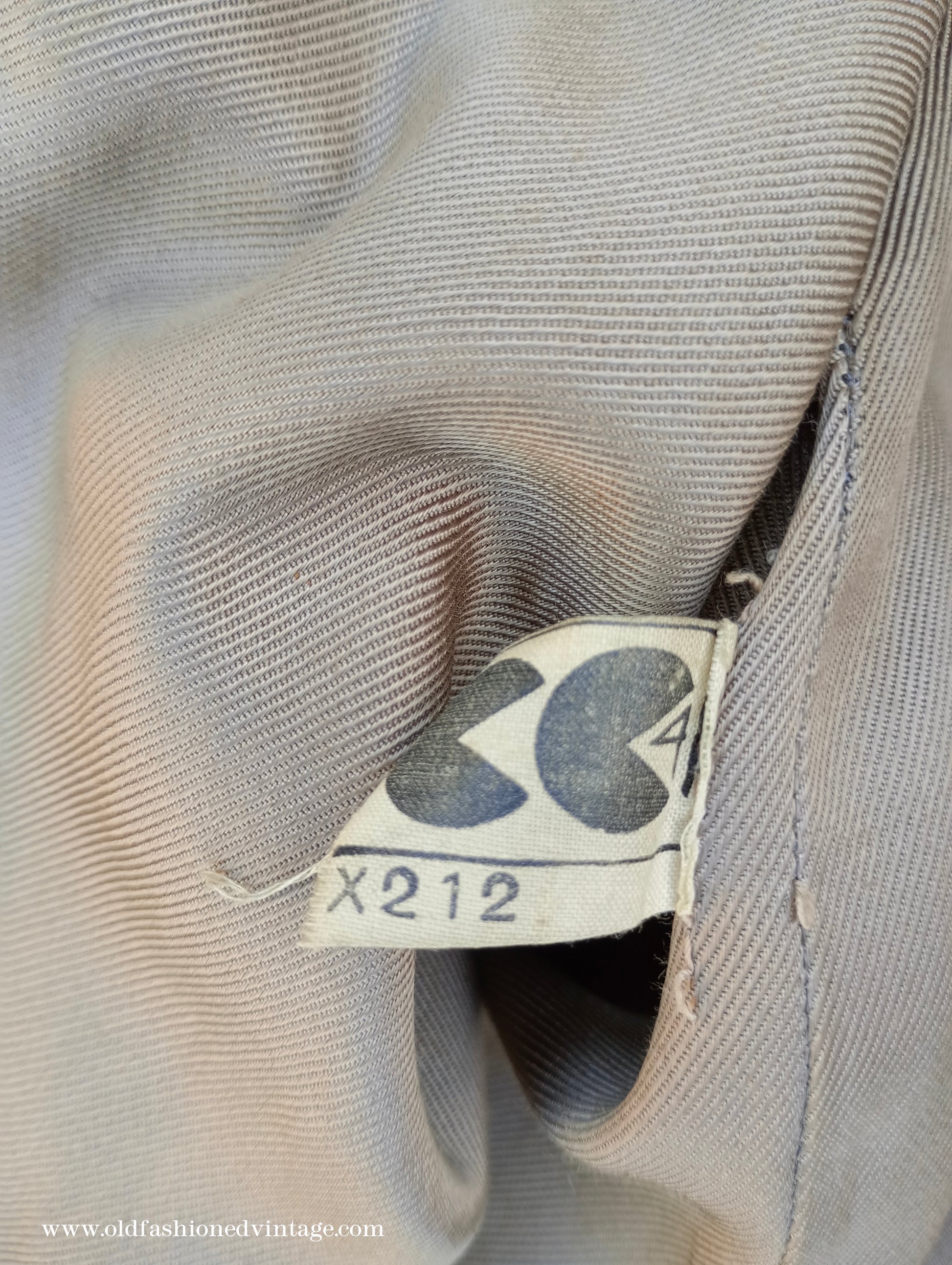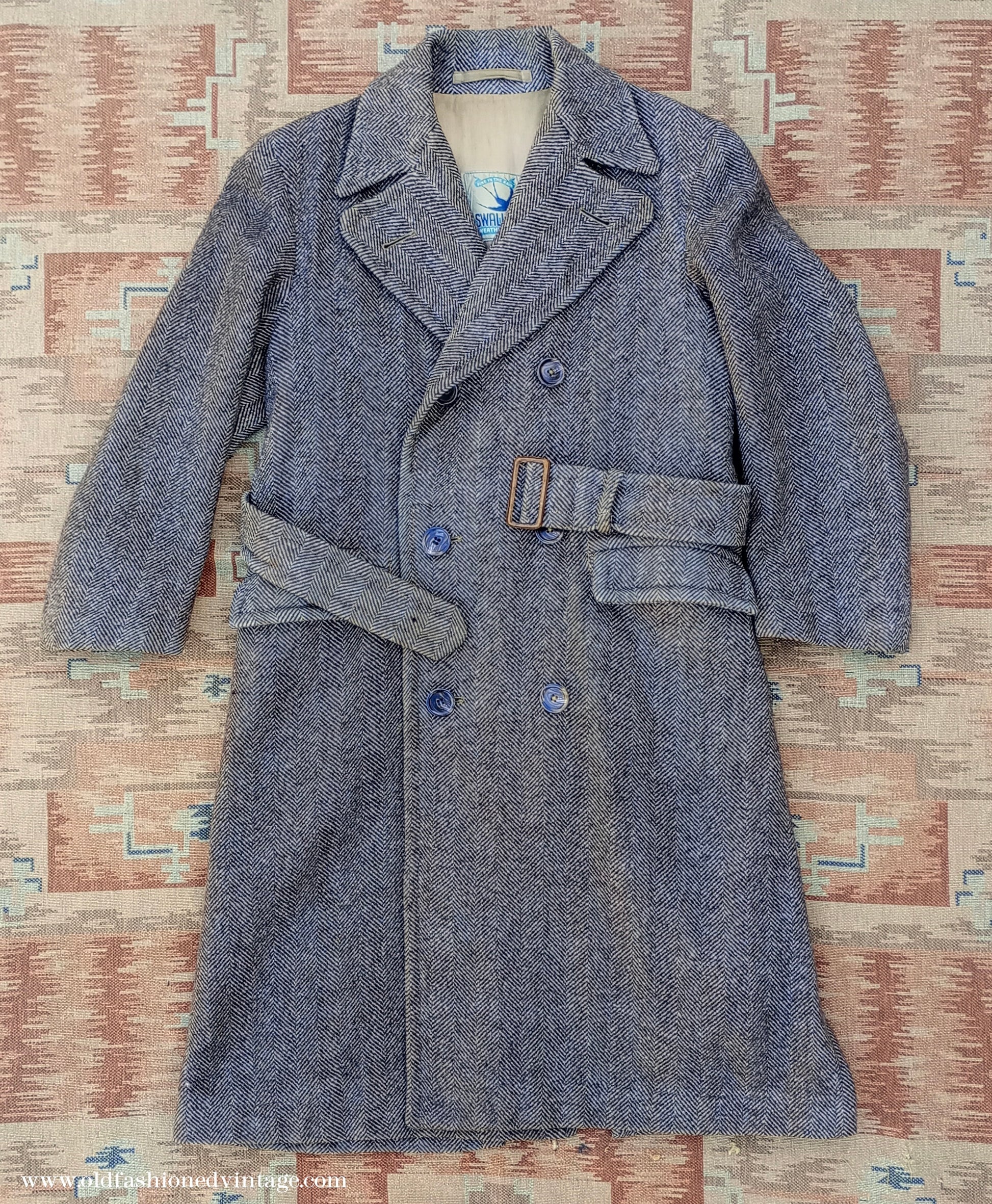 A vintage 1940s CC41 Utility Scheme labelled overcoat, made by 'Swallow' from a thick tweed wool herringbone weave cloth in variegated dark brown & natural beige. Cut in a classic double-breasted style with broad peaked lapels, 6 x 3 horn effect button fastening, medium-padded shoulders, 2 flapped lower pockets, & matching belt with leather covered buckle. Fully lined with gold-beige rayon twill fabric, with an inside breast & inside ticket pocket. Has a lovely graphic label of the type more usually fitted to raincoats by this maker; presumably austerity prevented printing a specific one.