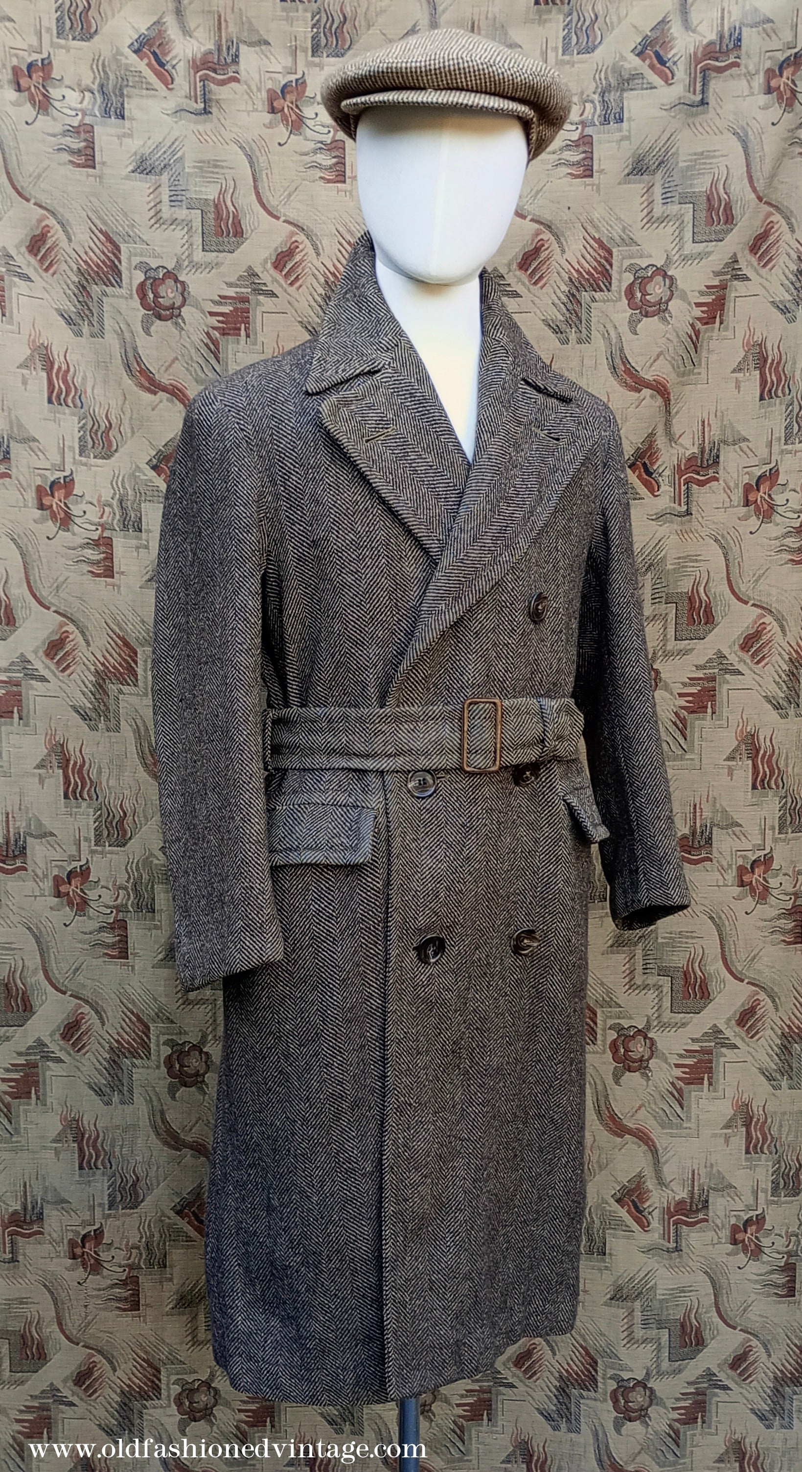 Vintage 1940s CC41 Double Breasted Overcoat Brown Herringbone Wool Tweed DB Belted UK S