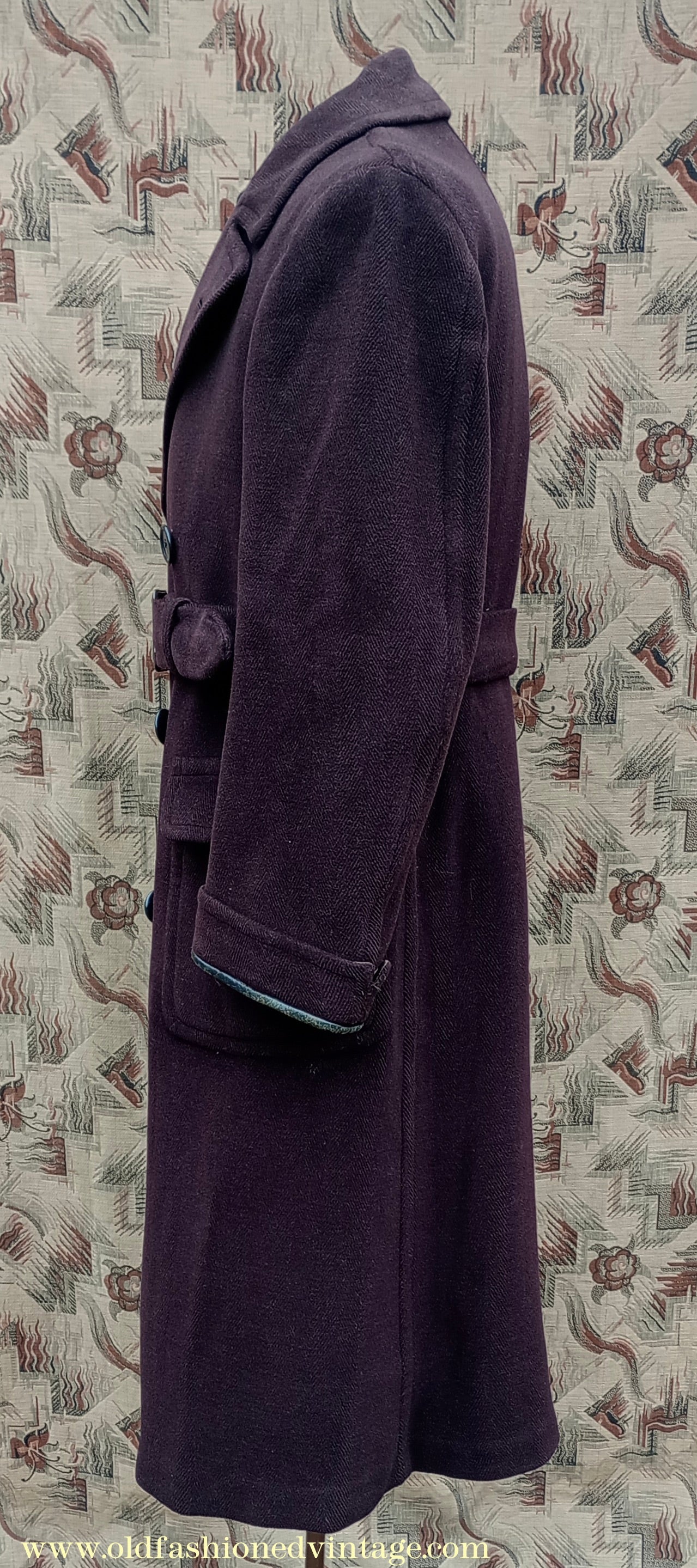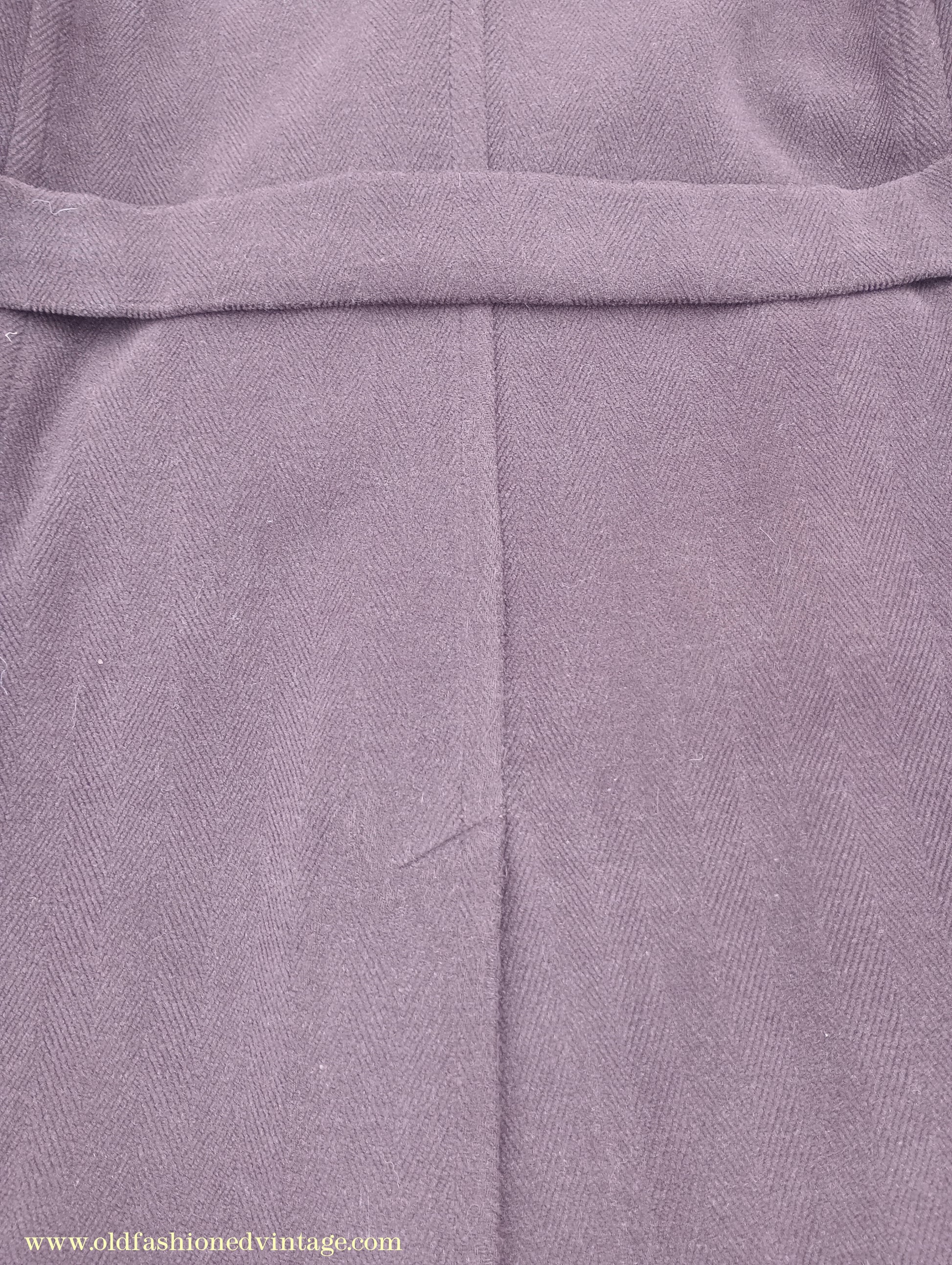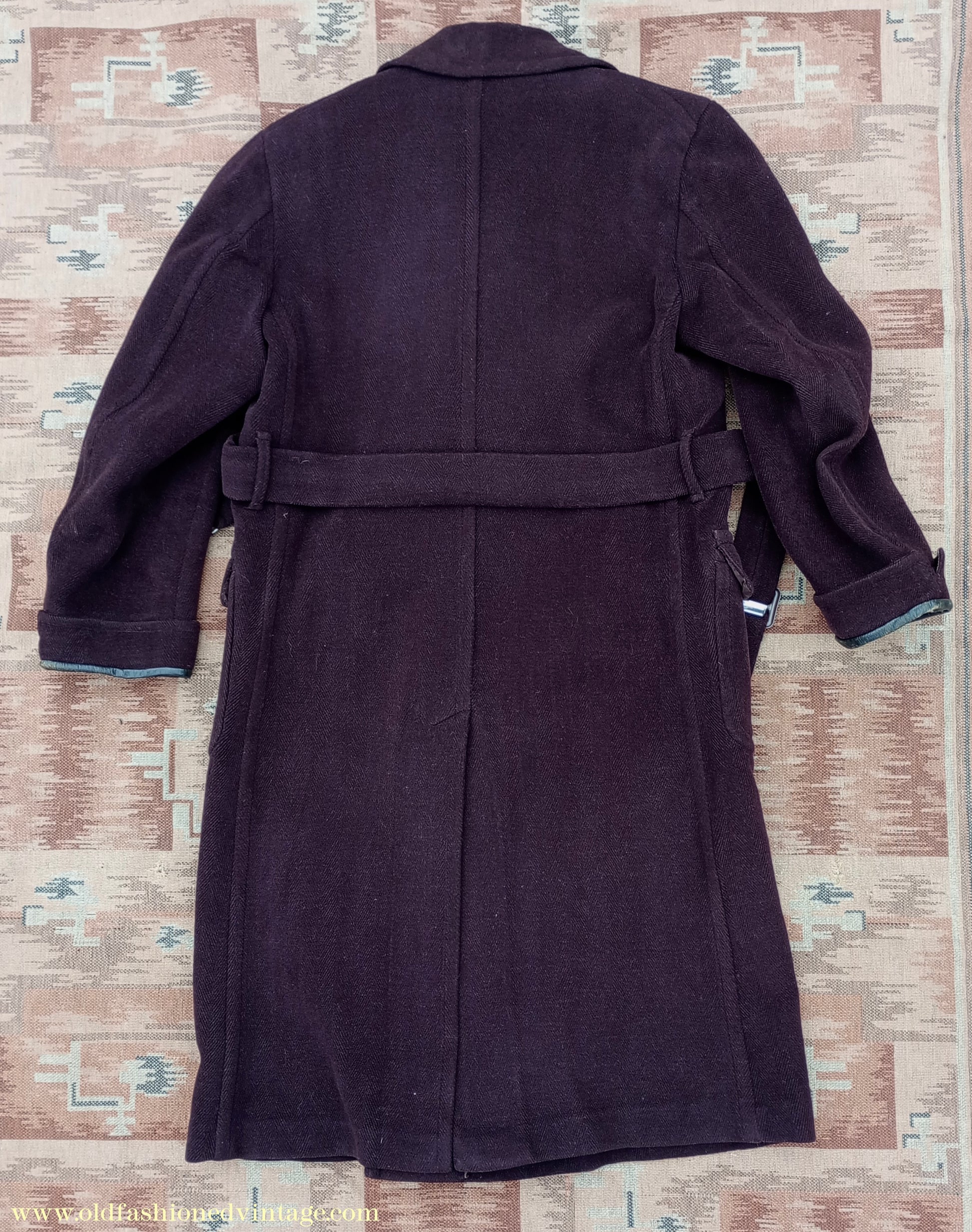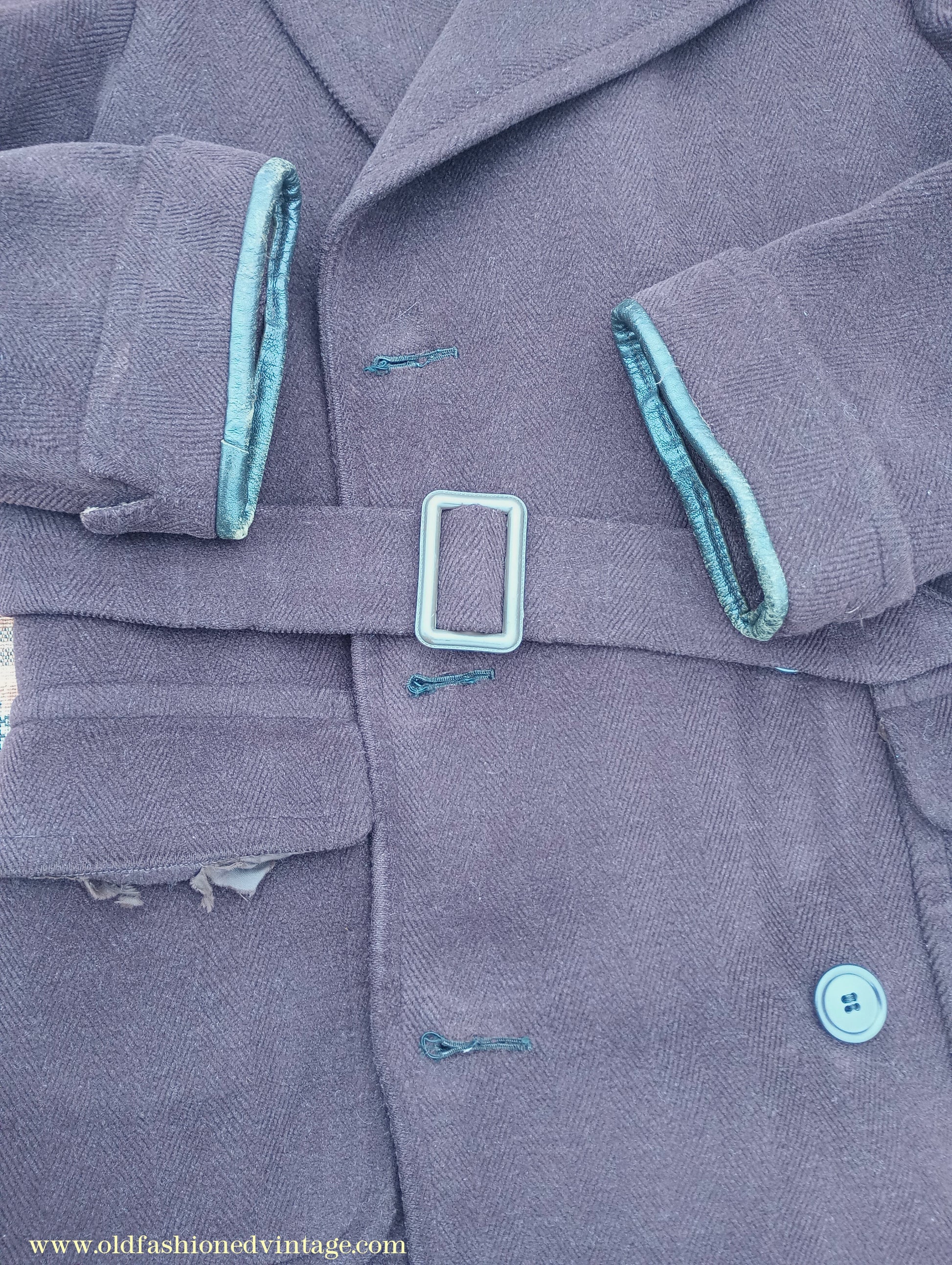 A time-worn, somewhat shabby but characterful vintage 1940s overcoat, made by 'Varsity' from a thick slightly fleecy wool cloth in a textured herringbone weave in dark chocolate brown. It is double-breasted with broad lapels, has medium-padded shoulders with rear-sloping seams, narrow gauntlet cuffs with added leather trim, 2 flapped lower patch pockets, & matching belt with patented 'Jifix' hook buckle. Part lined with brown rayon fabric, with an inside breast pocket.