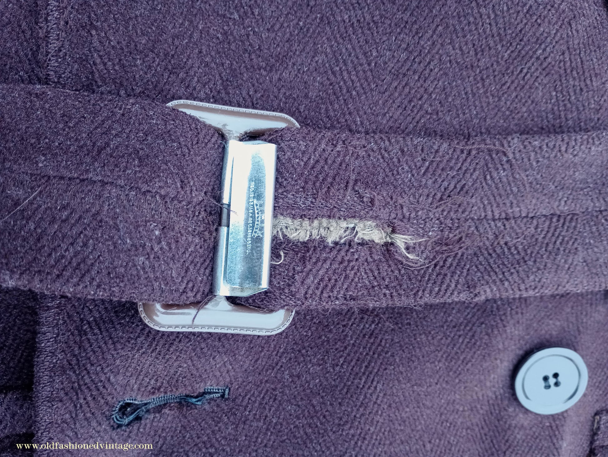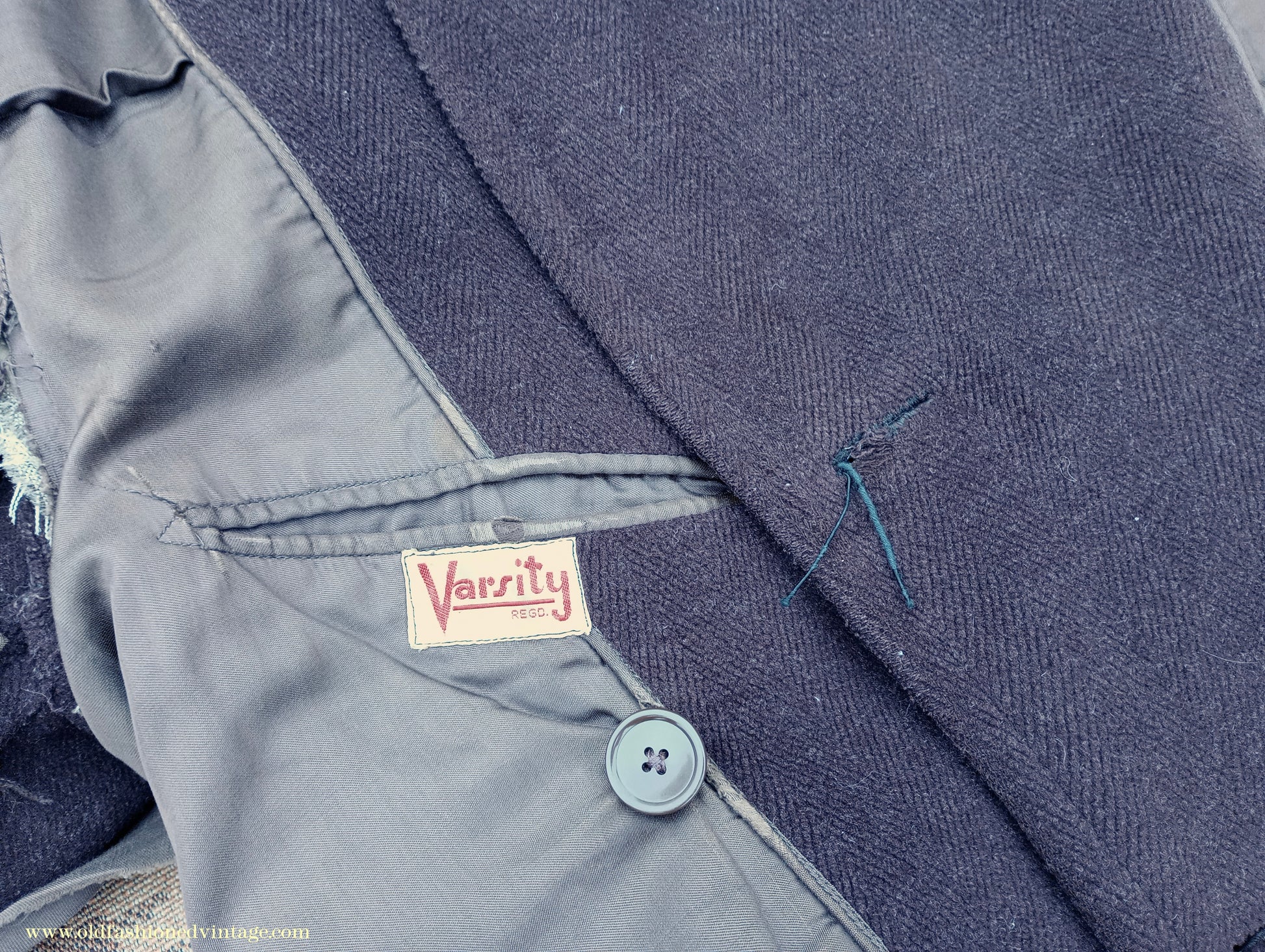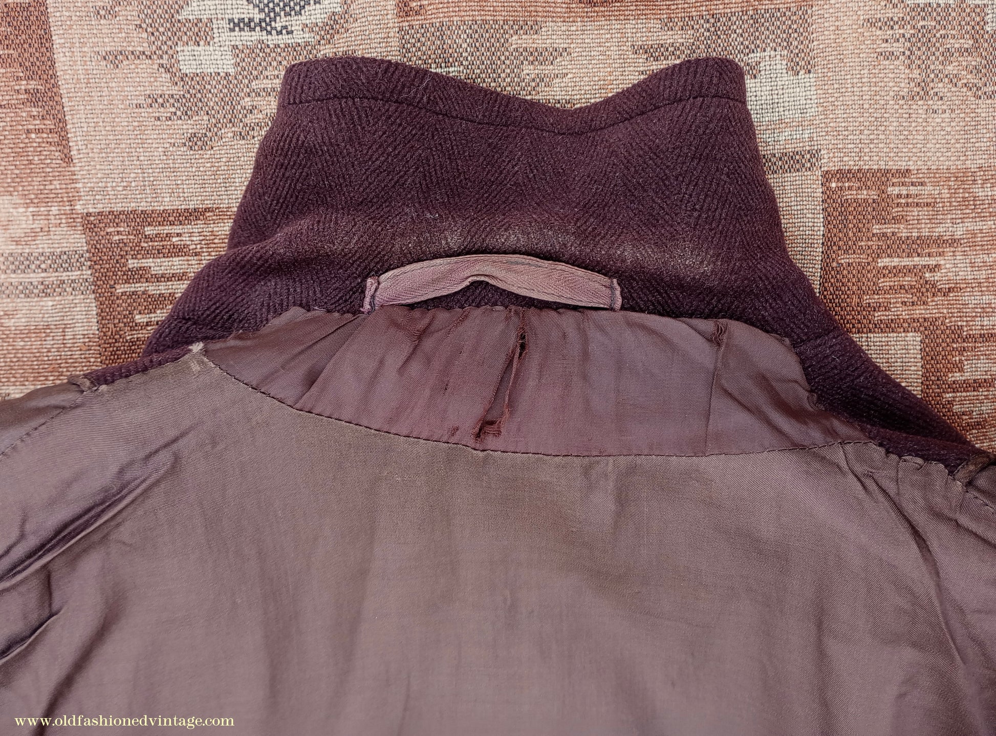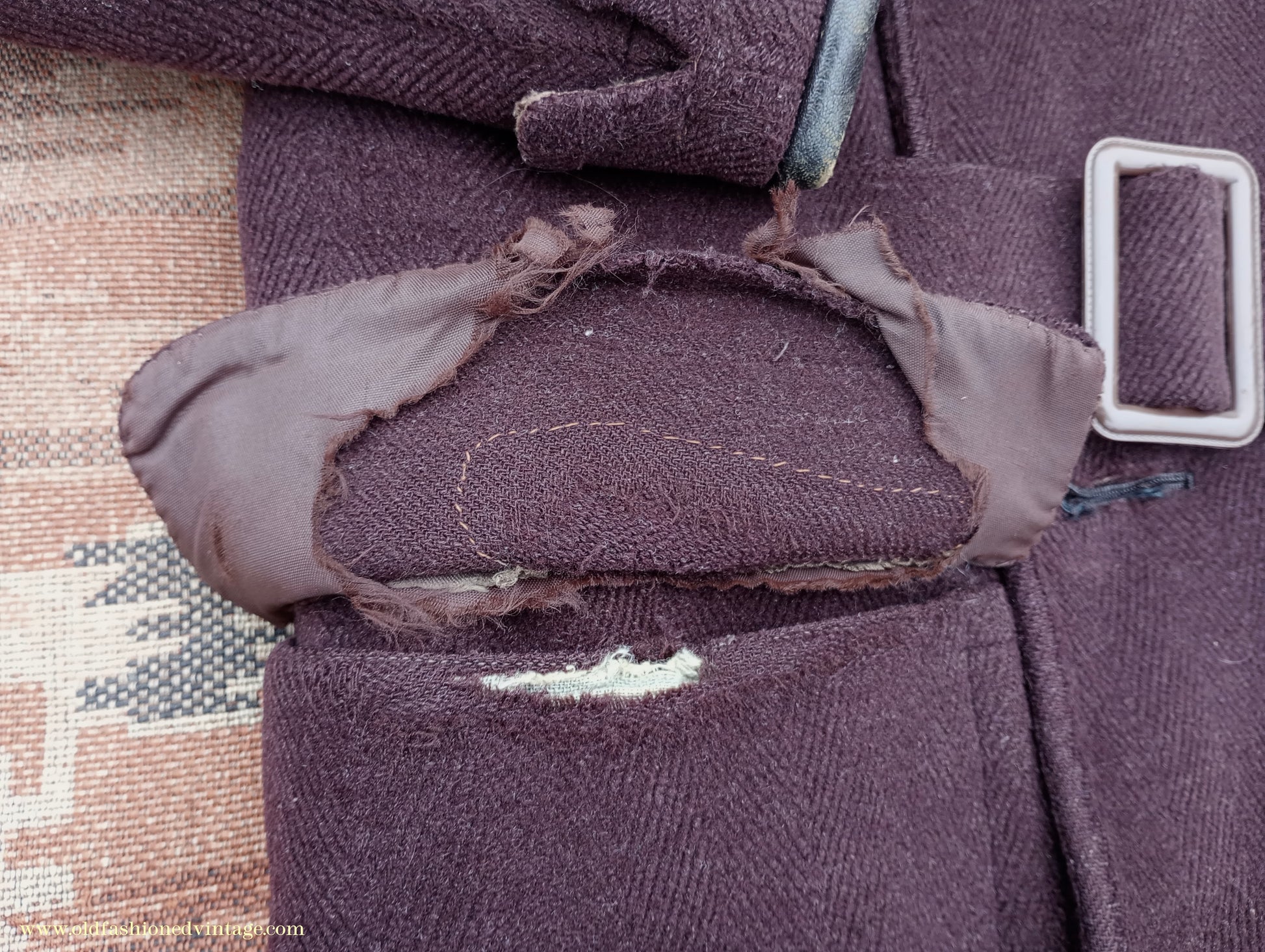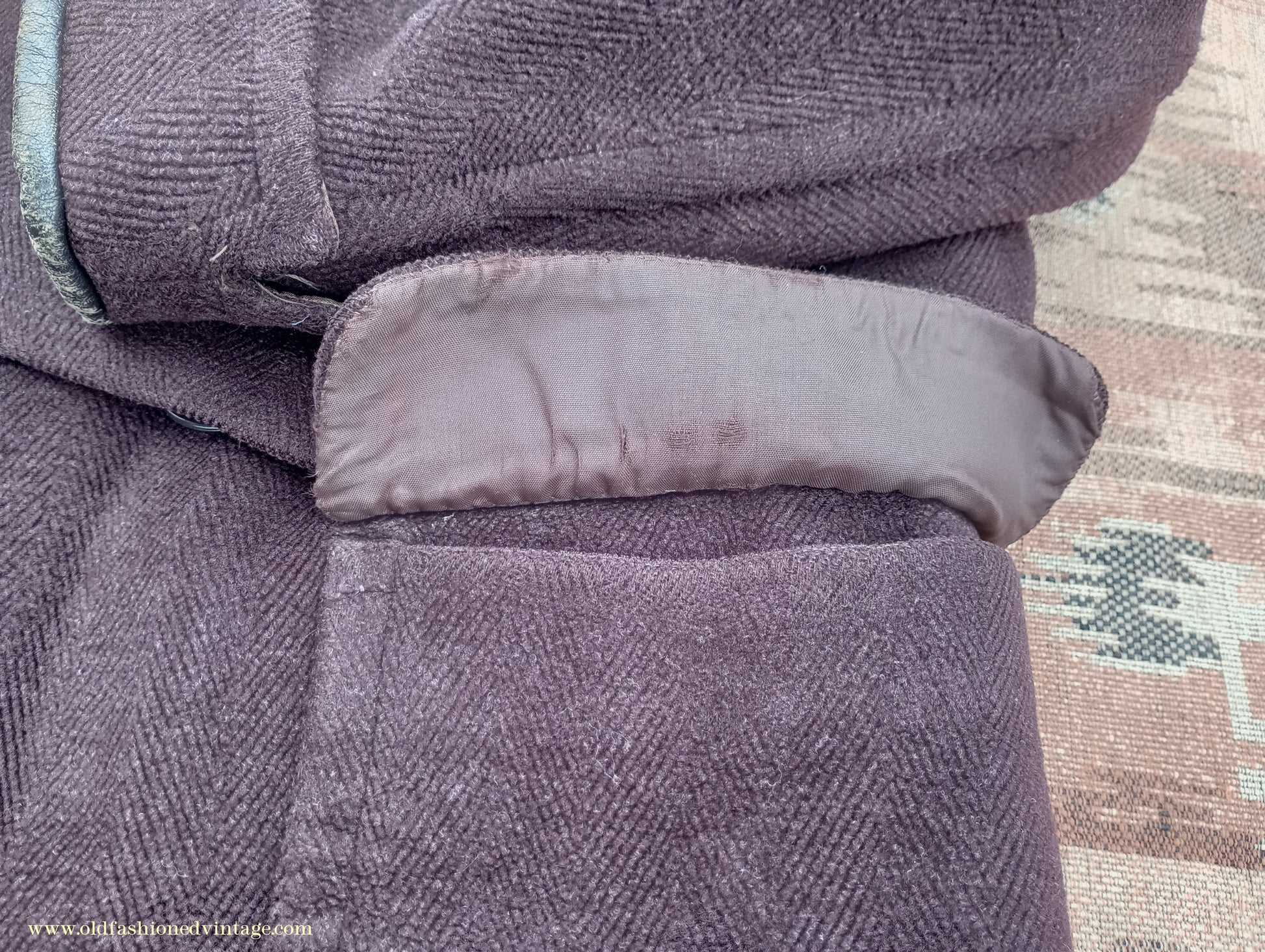 A time-worn, somewhat shabby but characterful vintage 1940s overcoat, made by 'Varsity' from a thick slightly fleecy wool cloth in a textured herringbone weave in dark chocolate brown. It is double-breasted with broad lapels, has medium-padded shoulders with rear-sloping seams, narrow gauntlet cuffs with added leather trim, 2 flapped lower patch pockets, & matching belt with patented 'Jifix' hook buckle. Part lined with brown rayon fabric, with an inside breast pocket.