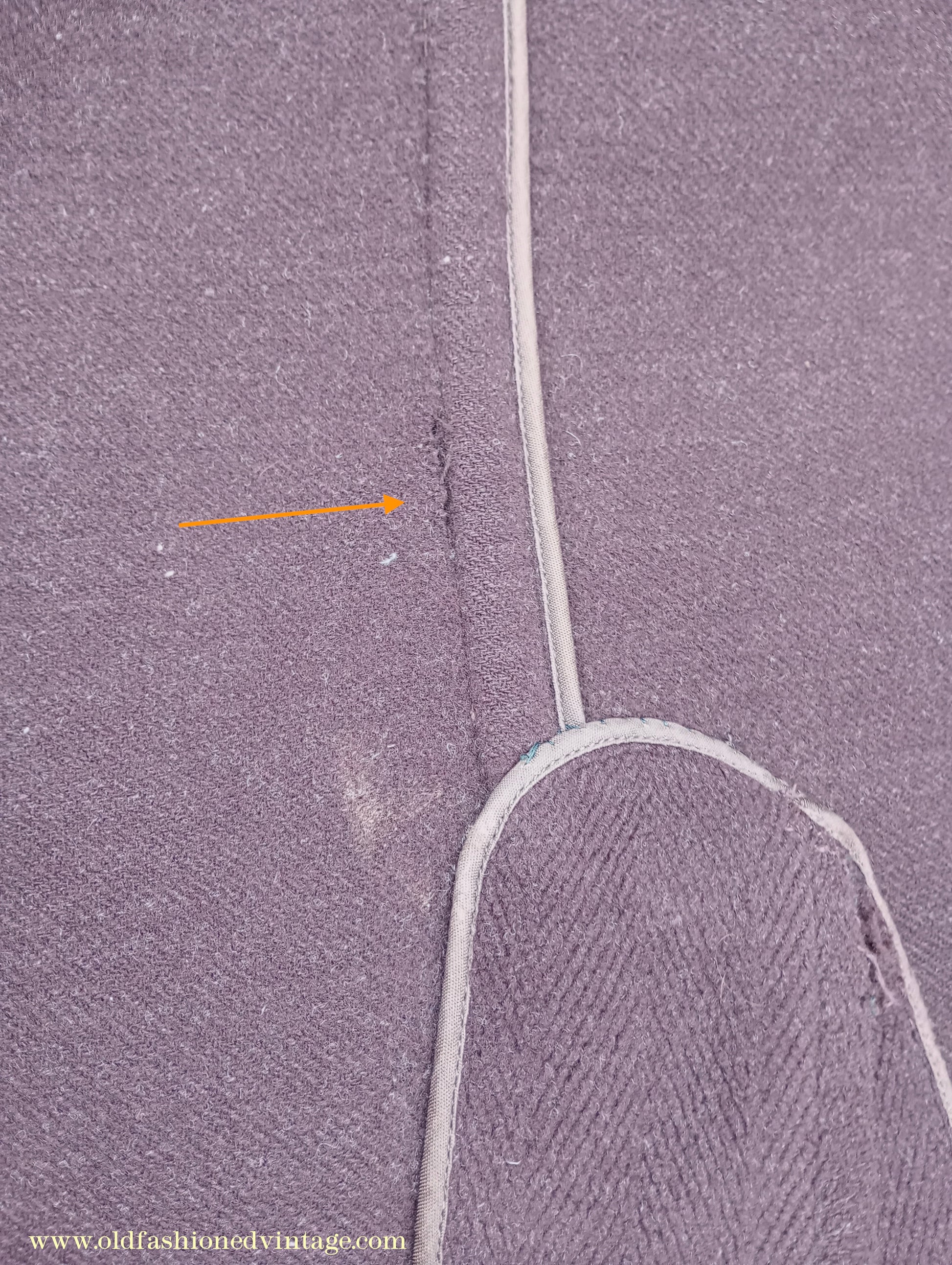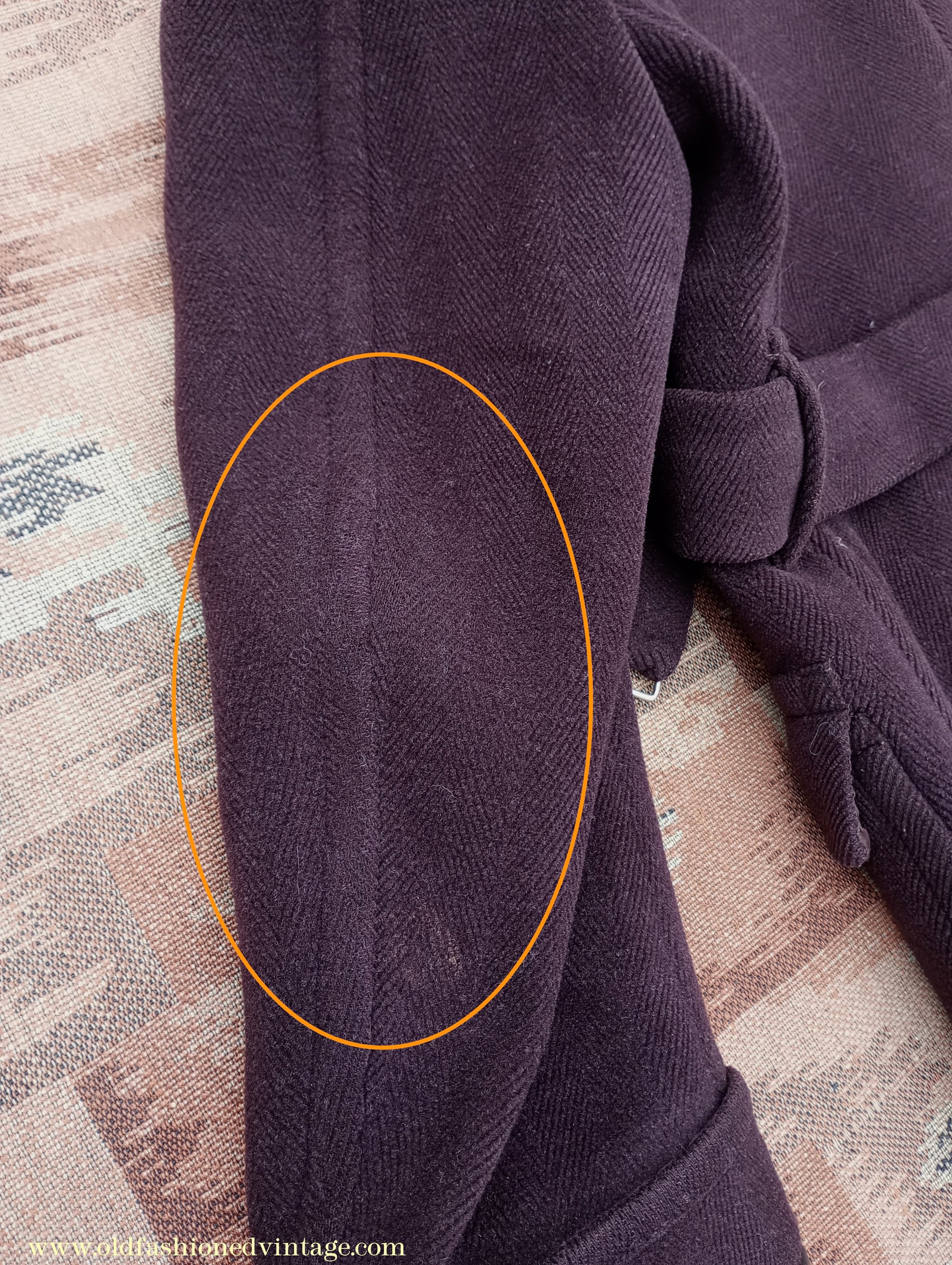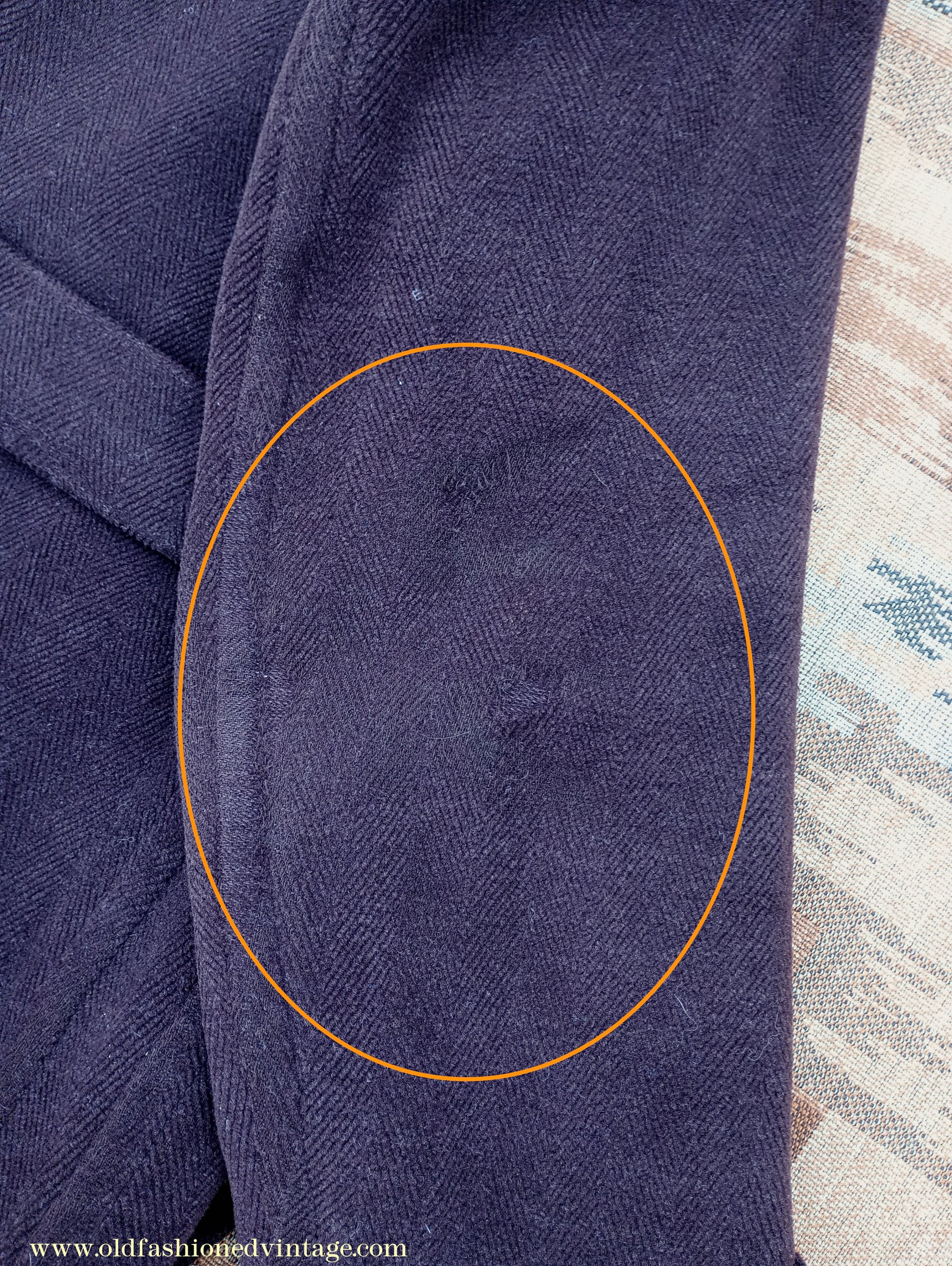 In well-worn, slightly distressed condition with noticeable flaws - there is surface wear & loss of nap the high spots & edges - two wear holes on the right lapel - small splits in both lapel notches - patches of wear & scuffing to both elbows - the leather trim is scuffed & coming loose in places - wear & fraying to the buttonholes, pocket flaps, pocket tops, back seam at the seat area, where there is also a small split, & belt - grime around the collar fold - a few scattered faint marks - on the inside some stains, marks & scuffs to the lining - tears & seam splits at the left armpit, some loose stitching at the right armpit. Has been thoroughly steamed & brushed prior to listing but a faint storage mustiness remains.