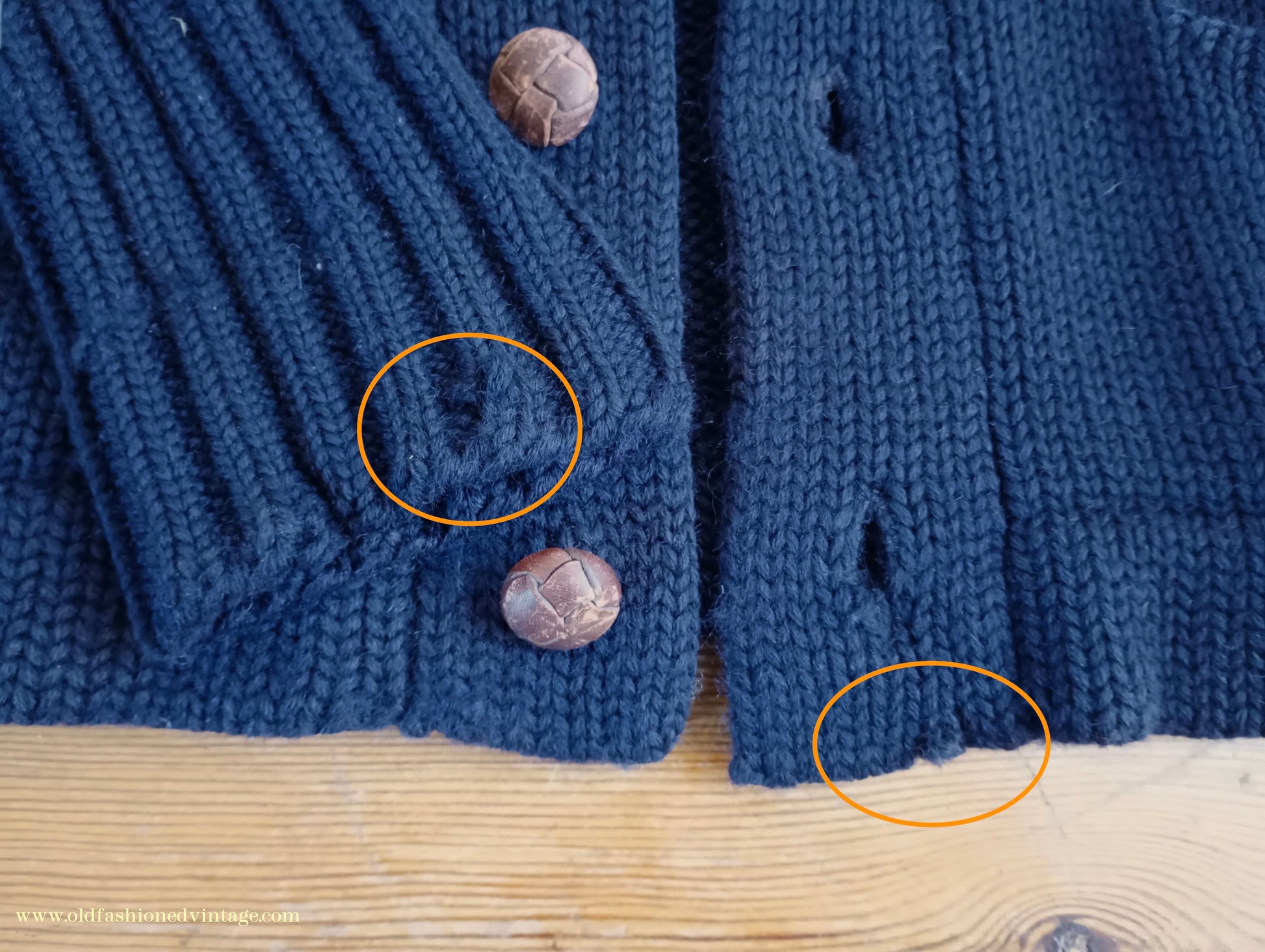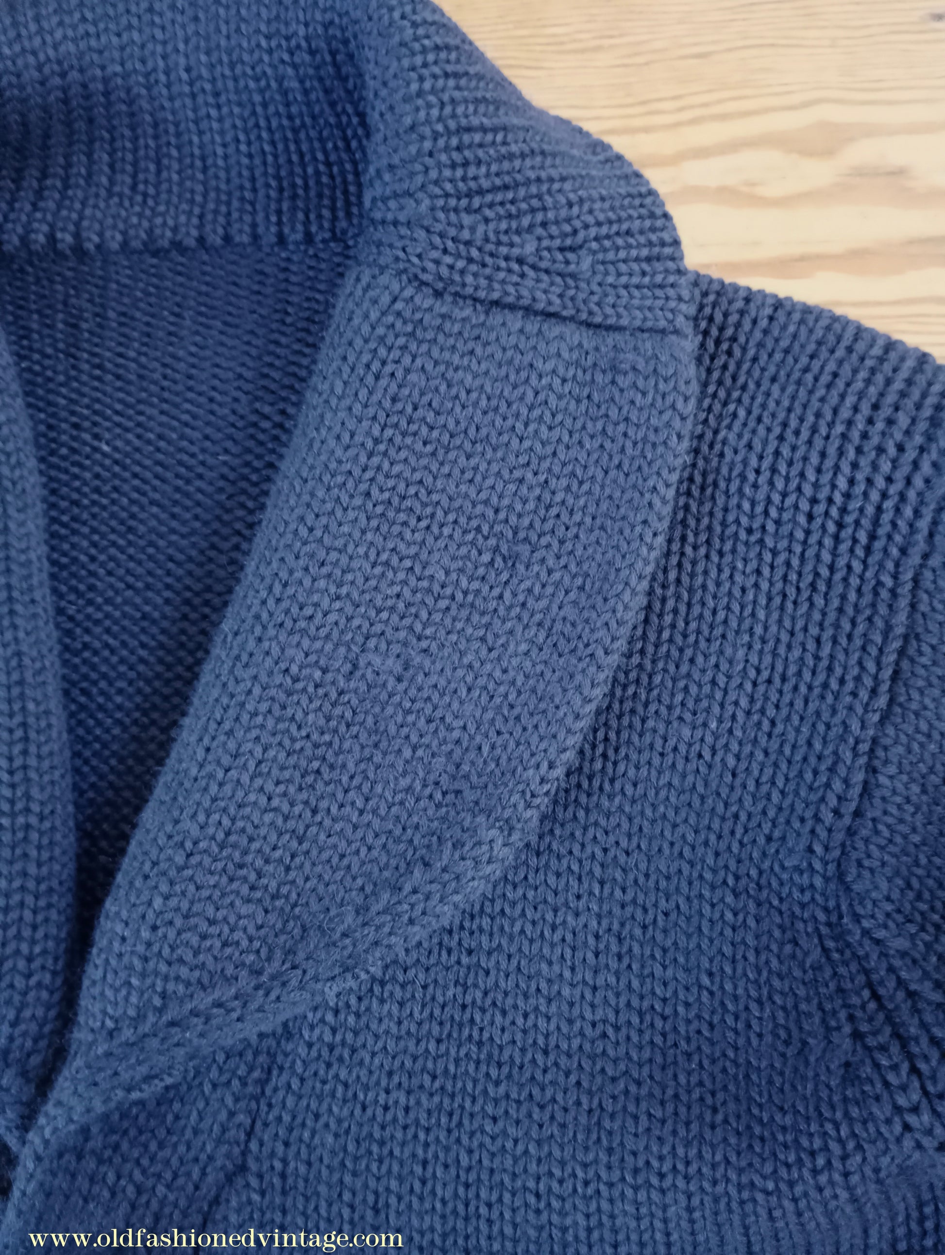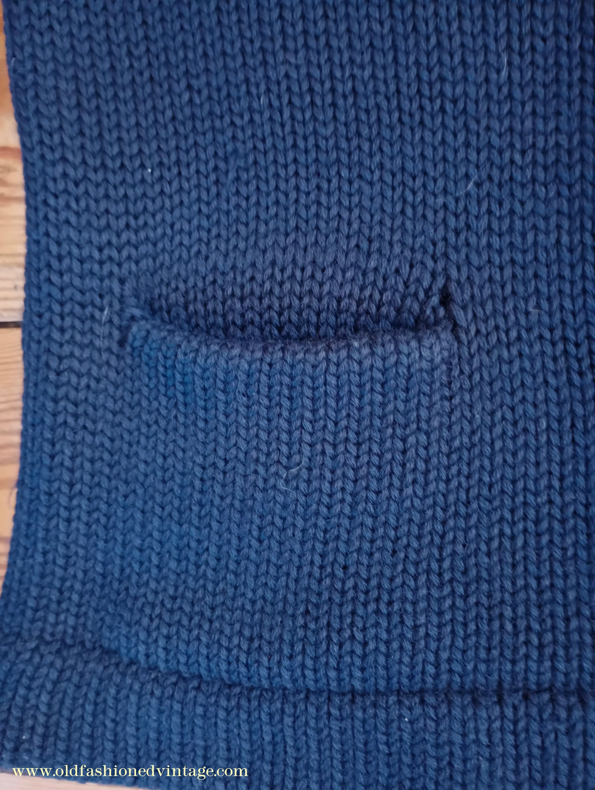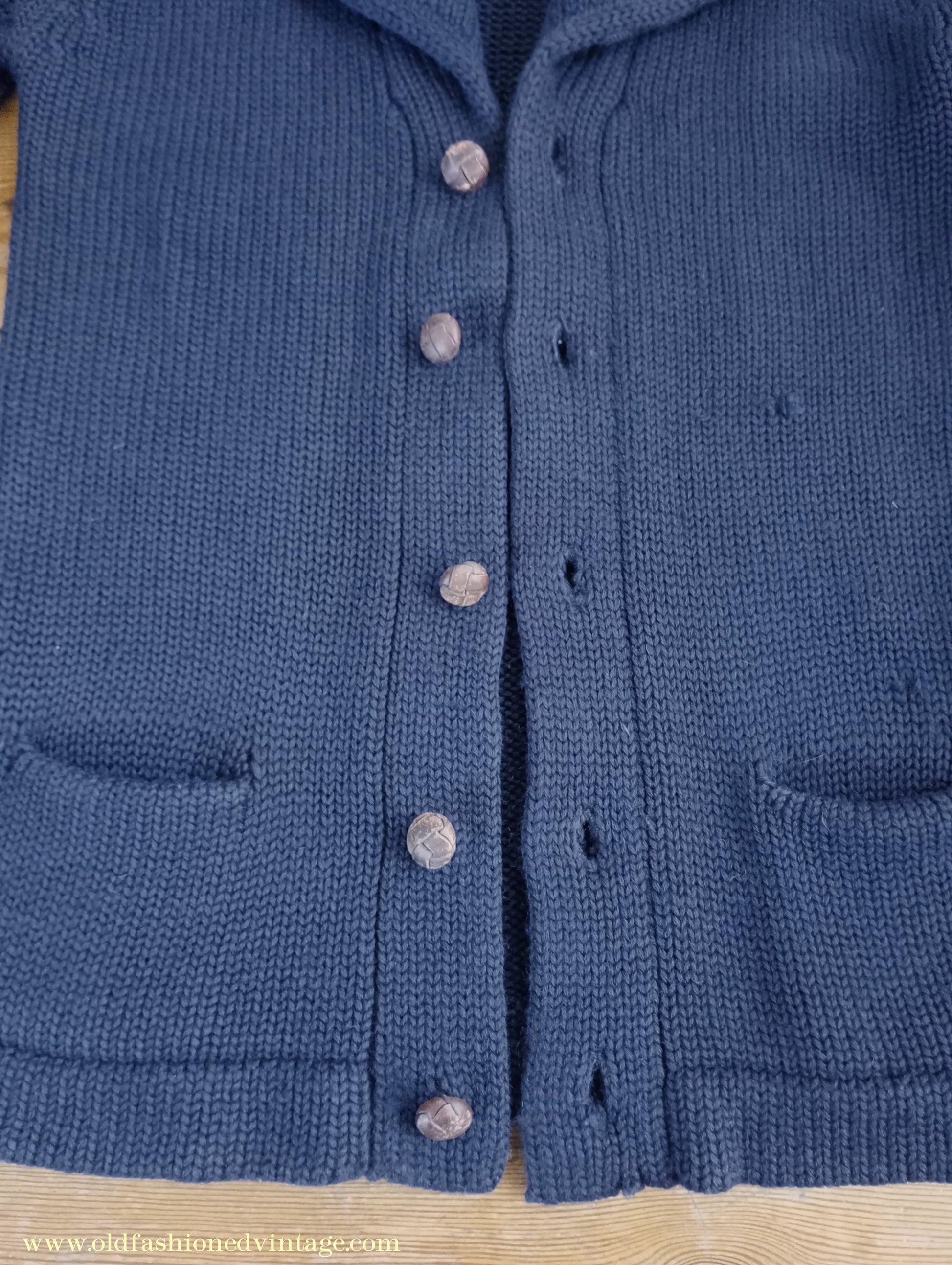A characterful vintage American circa 1930s/1940s cardigan sweater jacket, knitted from chunky wool yarn in navy blue colour, somewhat darker than it appears on my screen. It has a particularly generous shawl collar, deep ribbed cuffs, 2 pockets & fastens with leather 'football' buttons. No labels present.