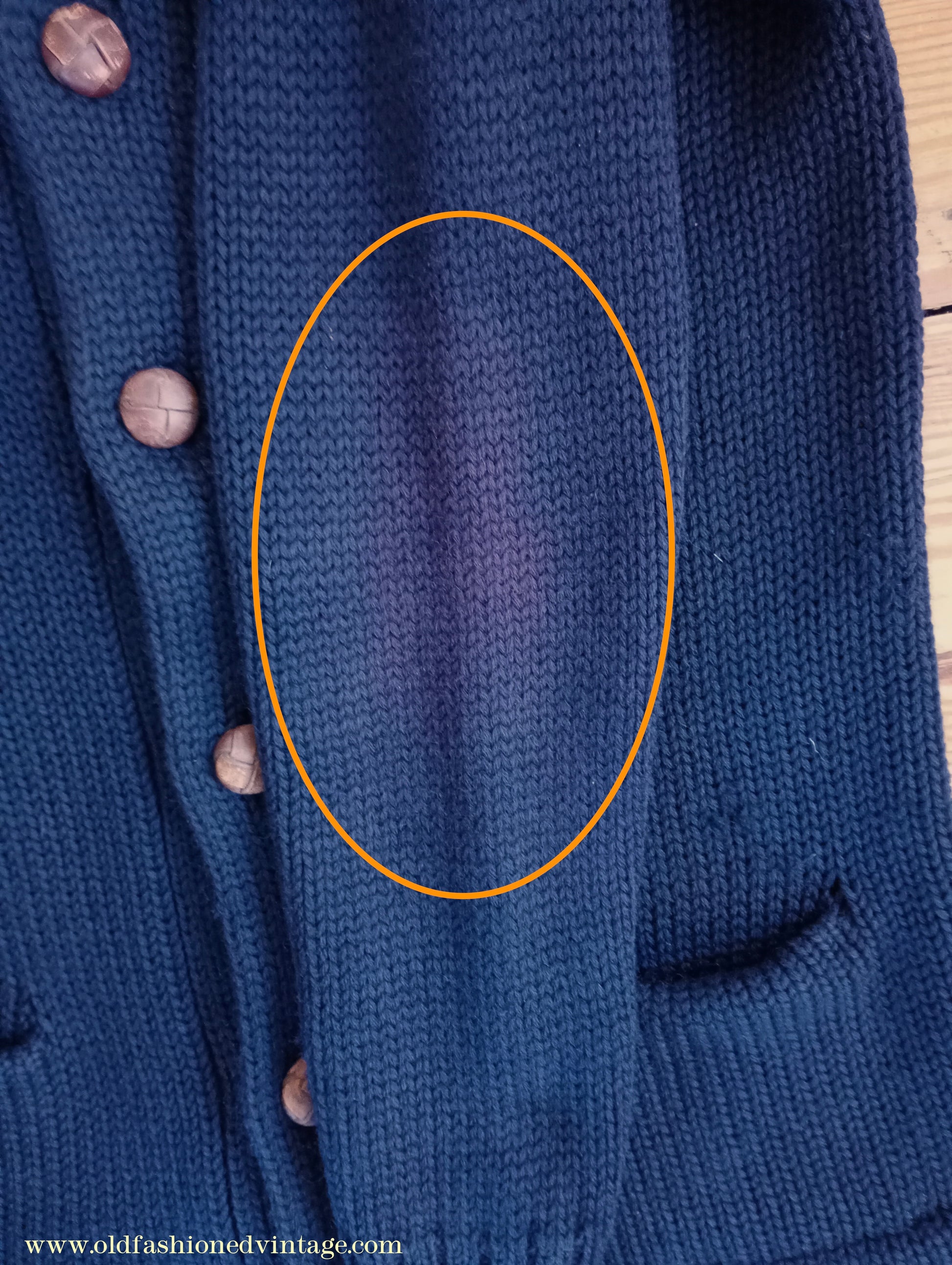 In good used condition overall with some wear & flaws - there are several plucks & snags on the left chest & upper left sleeve, as if college badges have been removed, & a few other snags here & there - pulling at the pocket corners - a small hole at the centre back hem, another on the bottom front edge & another on the right cuff (circled) - a faded spot on the right collar & a bleached patch on the left sleeve (circled - less apparent when worn than in the photos) - some wear to the buttonholes & the buttons are old replacements; there are loops on the collar edge but no corresponding buttons. Has been carefully hand washed & steamed prior to listing.