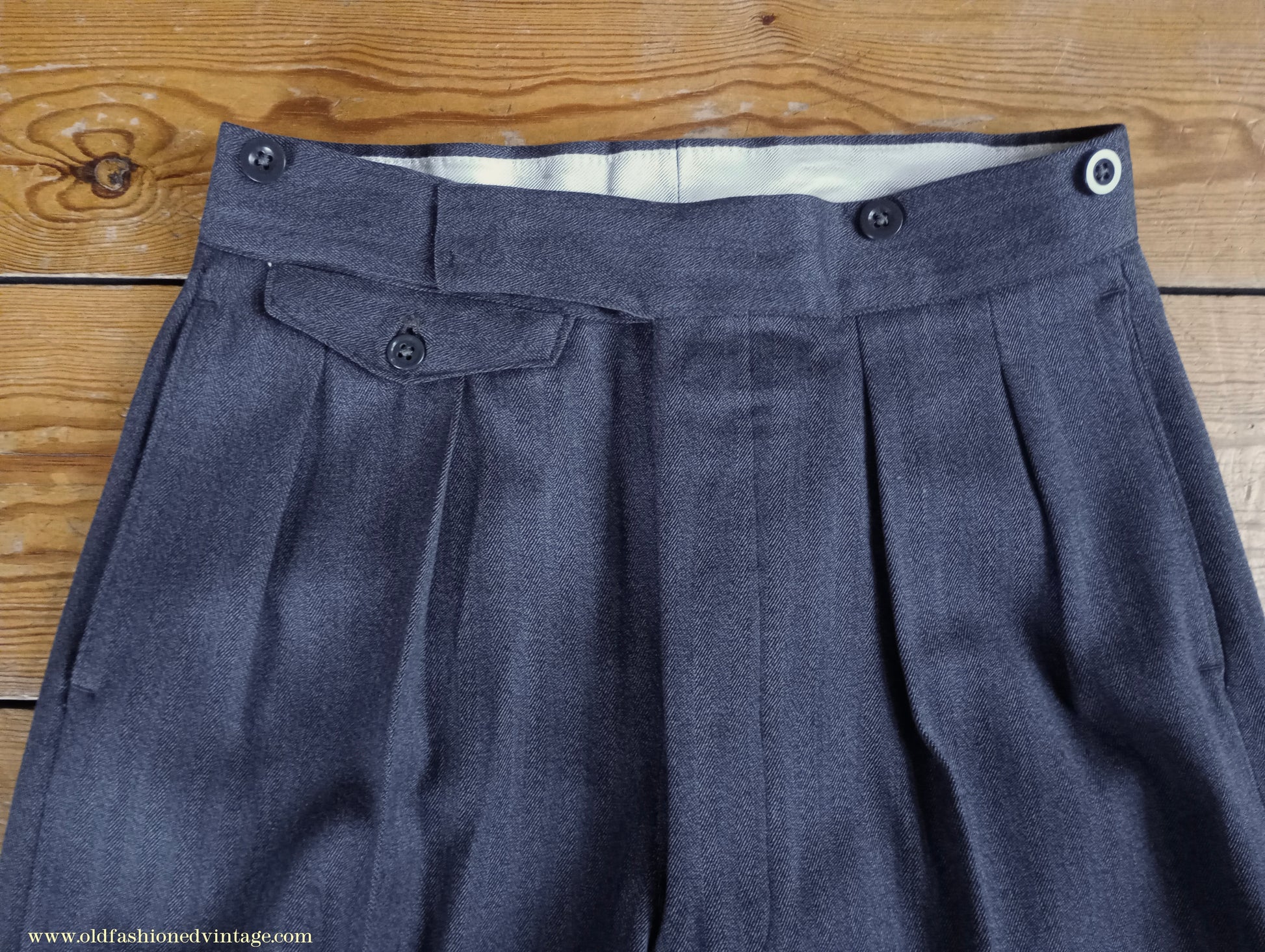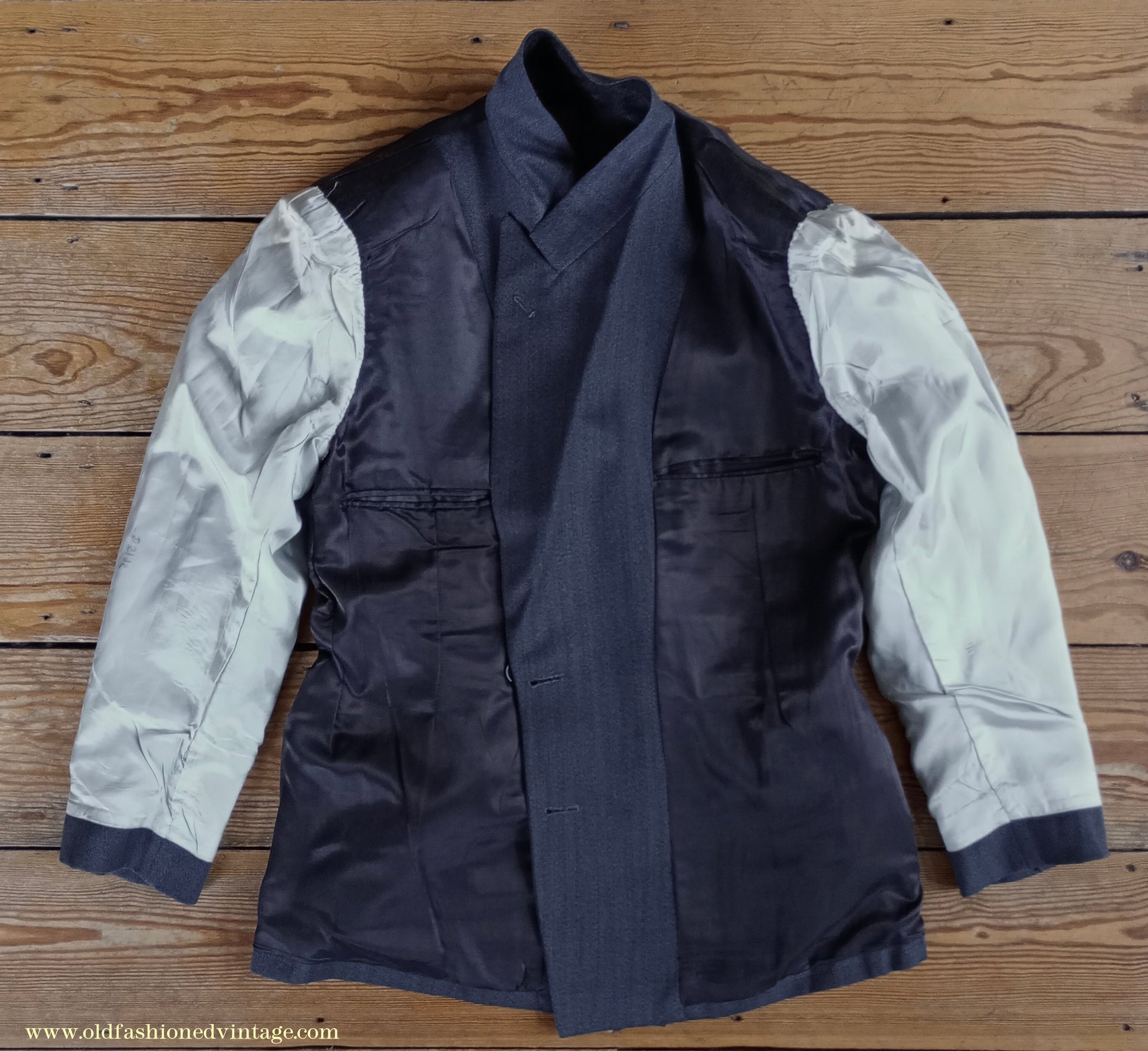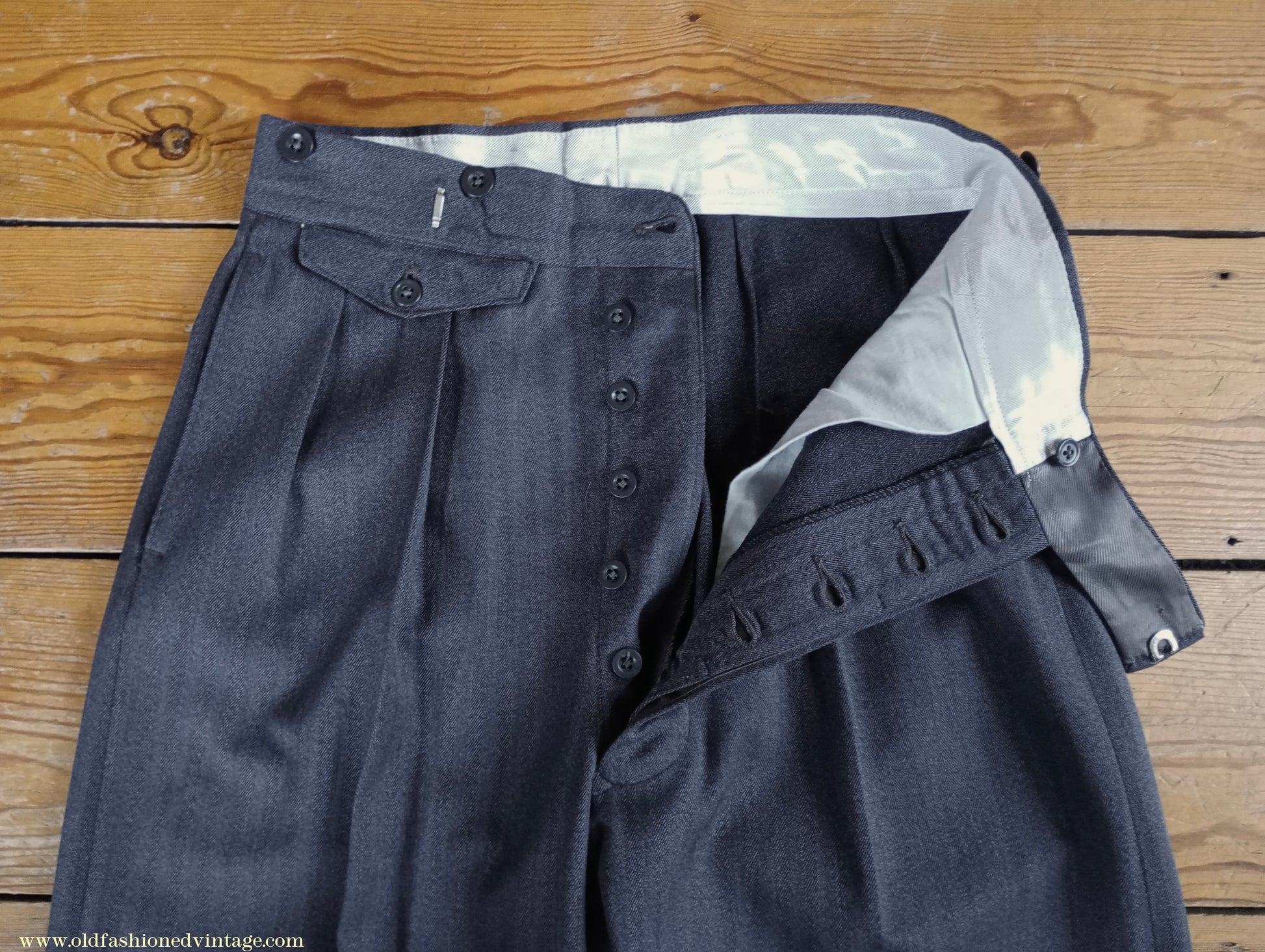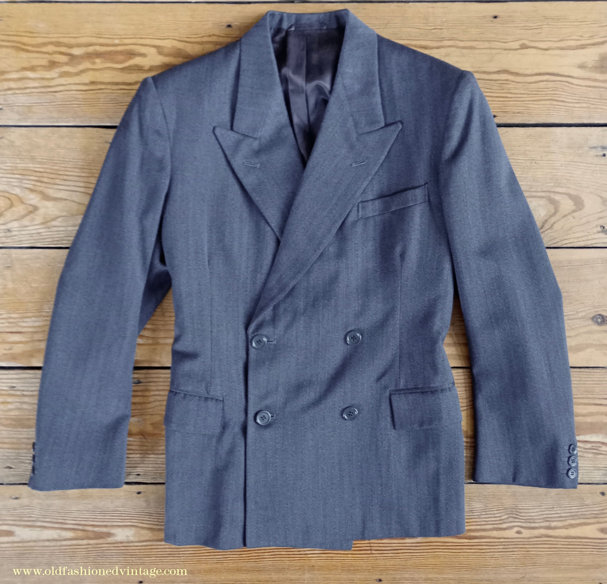 A really nice vintage two-piece suit from the late 1940s or early 1950s, made from wool herringbone weave fabric in slate or graphite grey. The double-breasted jacket has strongly padded shoulders, broad lapels, fitted waist, flapped lower pockets, & 4 x 2 button fastening; it is fully lined in grey rayon twill with off-white sleeve linings. The trousers are full-cut & wide in the leg, with stylish wider-than-usual waistband, extra-deep double inward pleats, button fly, brace buttons, turn-ups, and side slip, flapped front cash & 1 flapped rear pockets. No labels present.