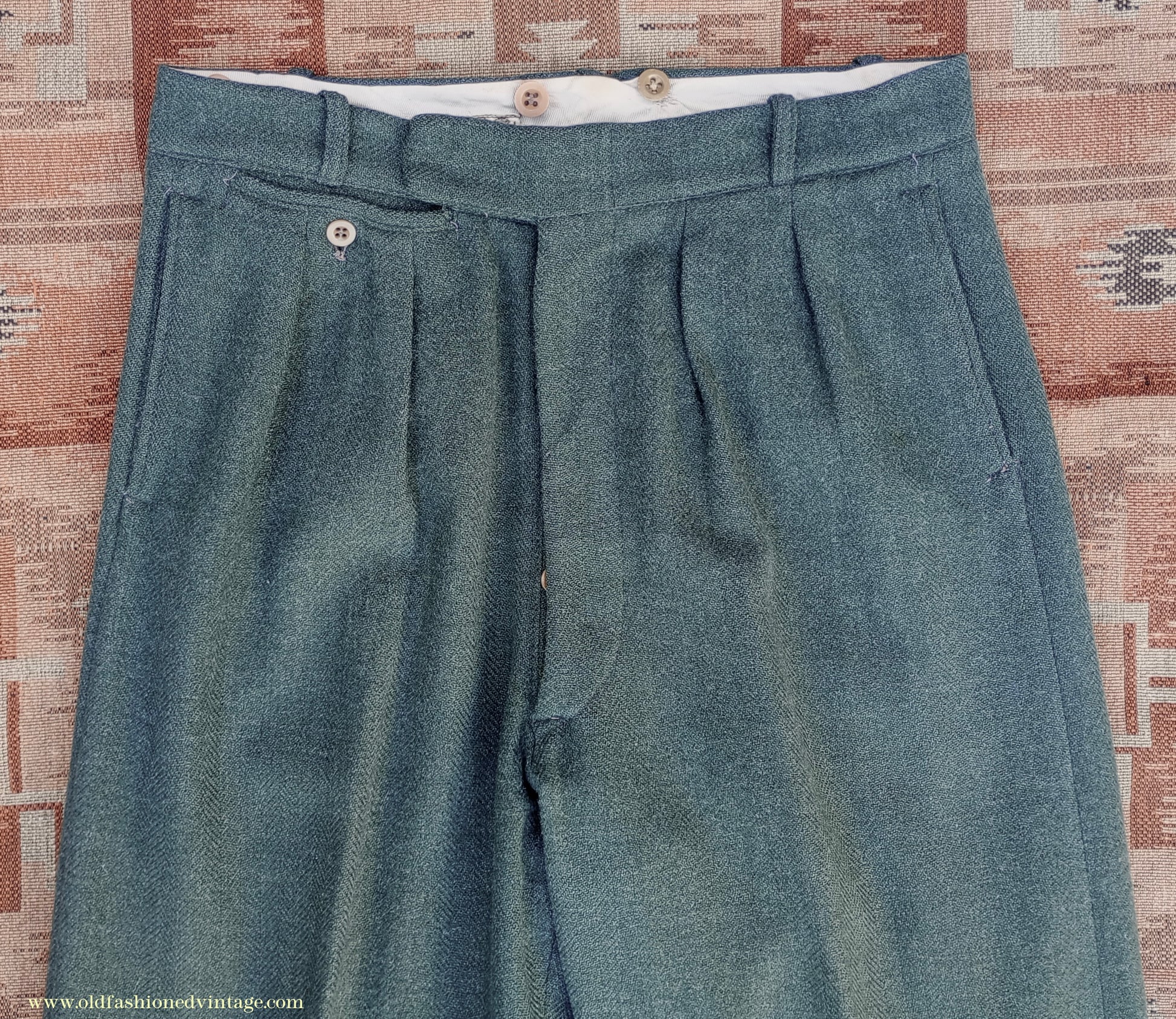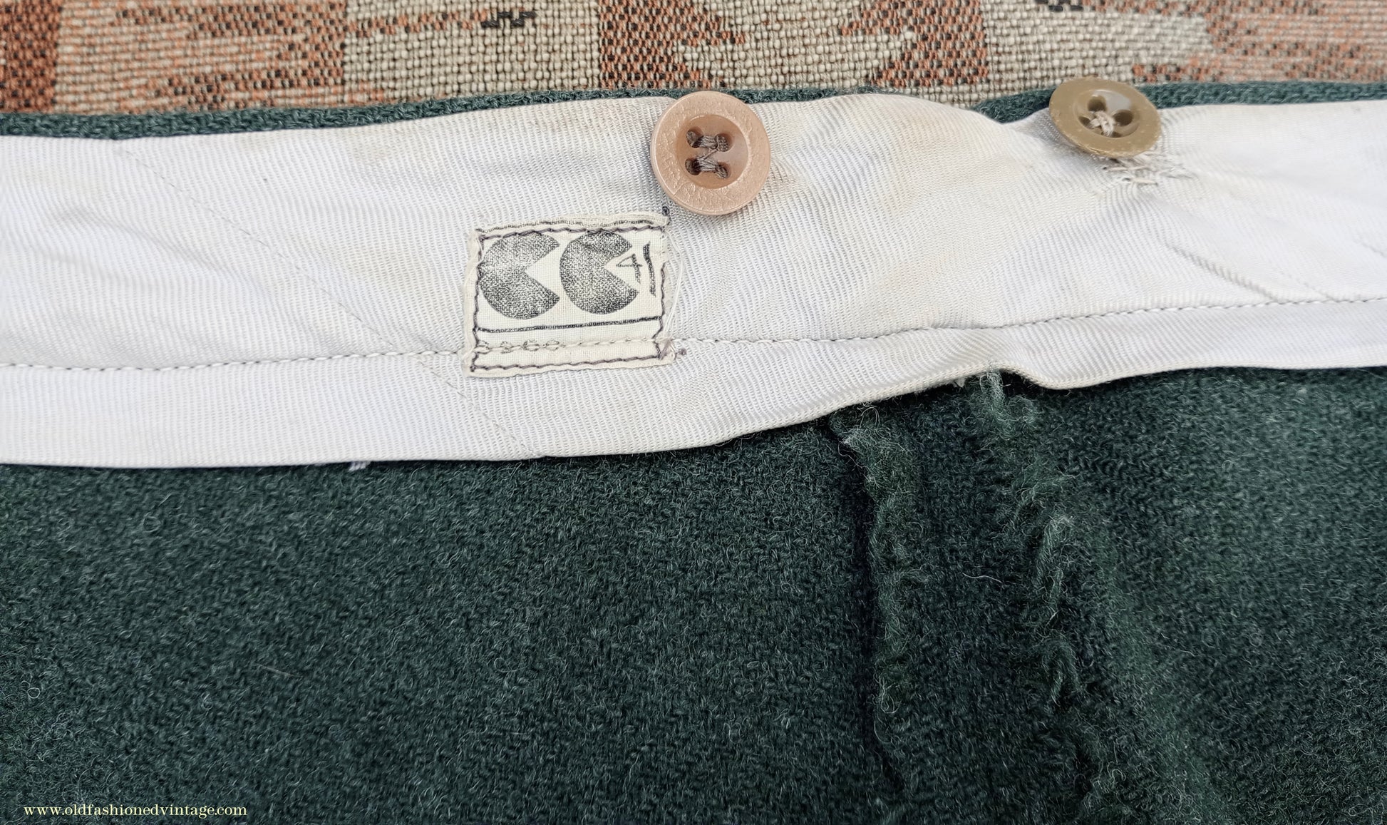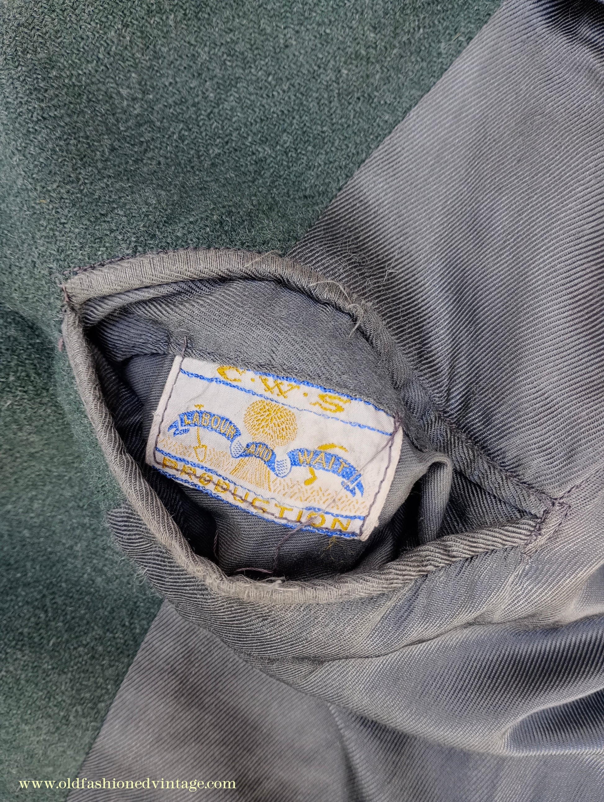 A fantastic vintage 1940s CC41 Utility Scheme labelled two-piece suit from 'CWS' (i.e. the Co-operative Workers Society), made from a fairly soft, herringbone wool tweed fabric in a forest green colour which was rather hard to capture; on my screen the close ups of the labels are most accurate. Single-breasted 3 button jacket with medium padded shoulders, broad notch lapels, fitted waist, welted chest & lower flap pockets, austerity type tubular cuffs with 3 decorative buttons; lined in grey rayon twill with off-white striped sleeve linings. Trousers are full-cut & wide in the leg, with double inward pleats, belt loops, braces buttons, side slip & buttoned cash pockets, button fly, turn-ups. The CC41 label has obviously been cut away from the jacket but remains on the trousers, & there is a lovely embroidered CWS label in the pocket. This has been in my collection for years but regrettably doesn't fit me and it deserves to be worn; CC41 sports cut suits are very rare, and even more so in a green colour such as this - you are unlikely to see another!
