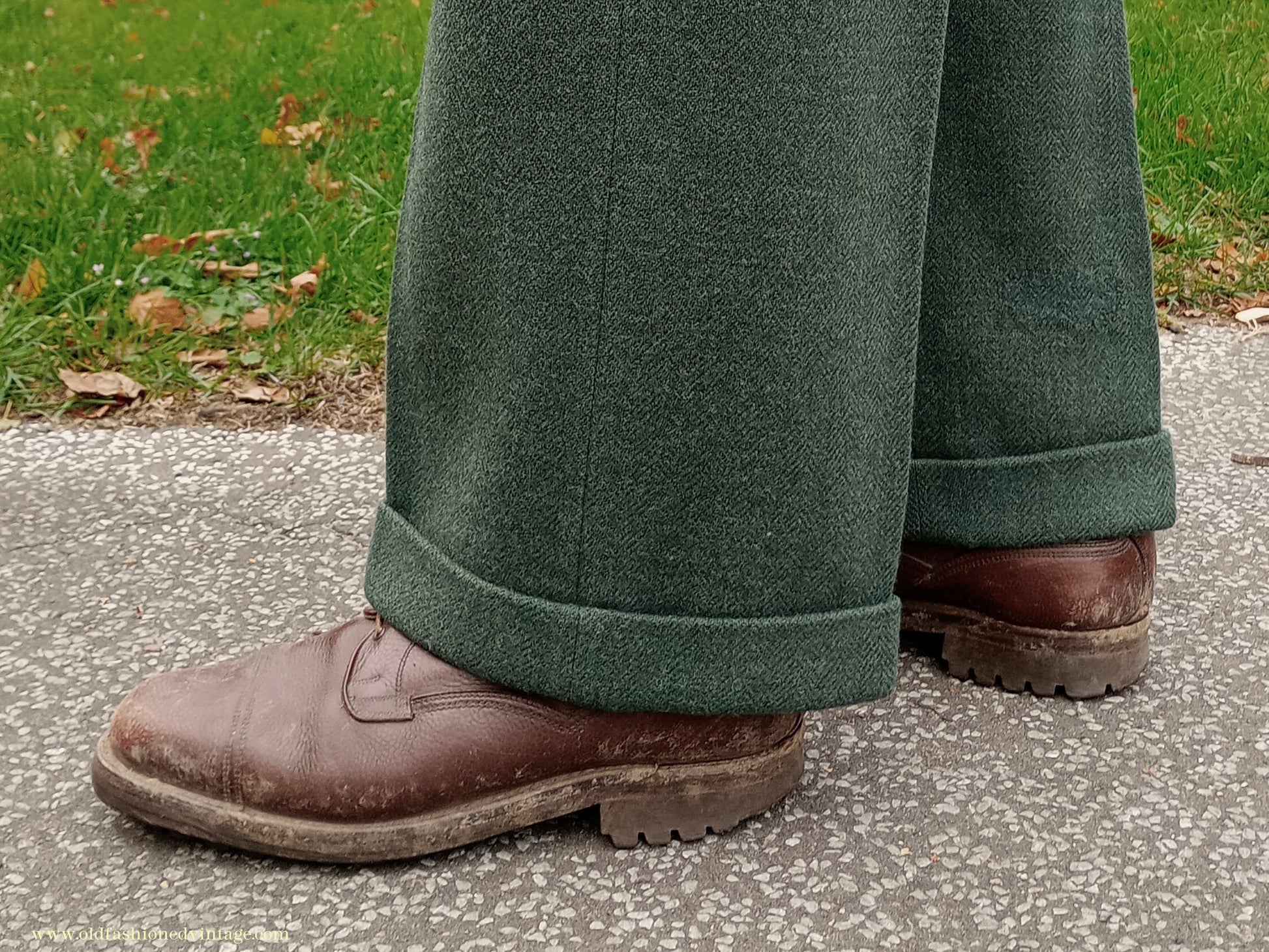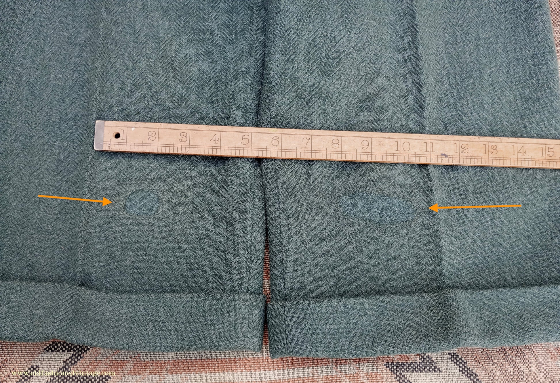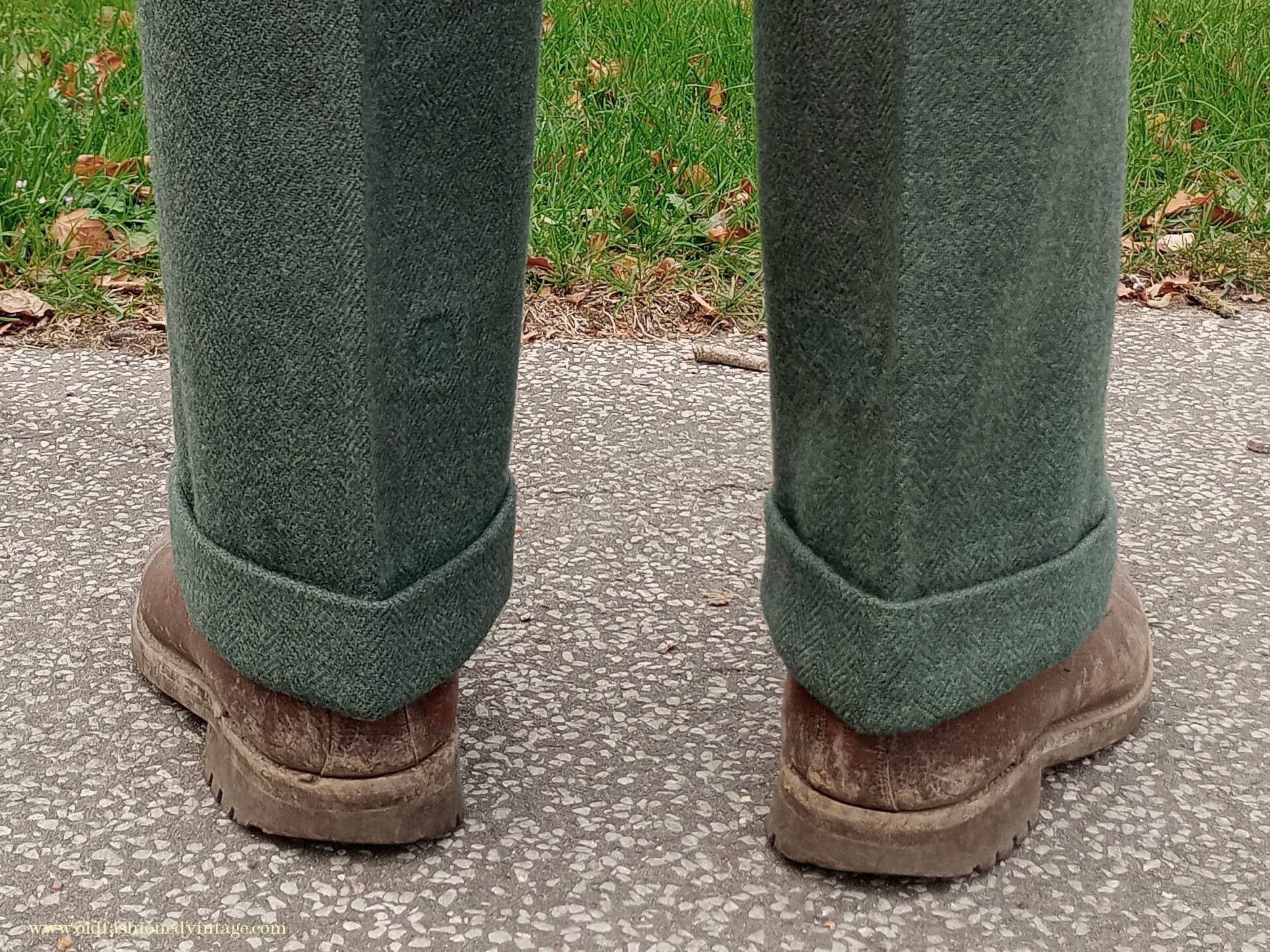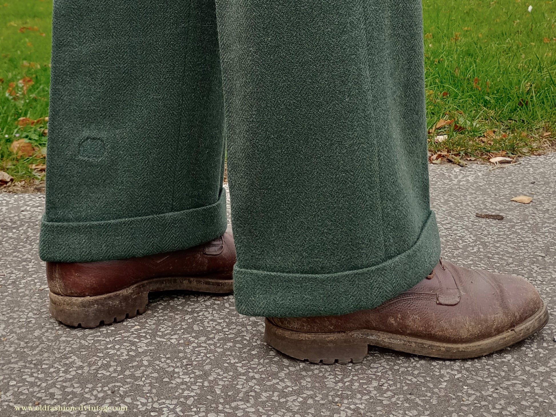 A fantastic vintage 1940s CC41 Utility Scheme labelled two-piece suit from 'CWS' (i.e. the Co-operative Workers Society), made from a fairly soft, herringbone wool tweed fabric in a forest green colour which was rather hard to capture; on my screen the close ups of the labels are most accurate. Single-breasted 3 button jacket with medium padded shoulders, broad notch lapels, fitted waist, welted chest & lower flap pockets, austerity type tubular cuffs with 3 decorative buttons; lined in grey rayon twill with off-white striped sleeve linings. Trousers are full-cut & wide in the leg, with double inward pleats, belt loops, braces buttons, side slip & buttoned cash pockets, button fly, turn-ups. The CC41 label has obviously been cut away from the jacket but remains on the trousers, & there is a lovely embroidered CWS label in the pocket. This has been in my collection for years but regrettably doesn't fit me and it deserves to be worn; CC41 sports cut suits are very rare, and even more so in a green colour such as this - you are unlikely to see another!