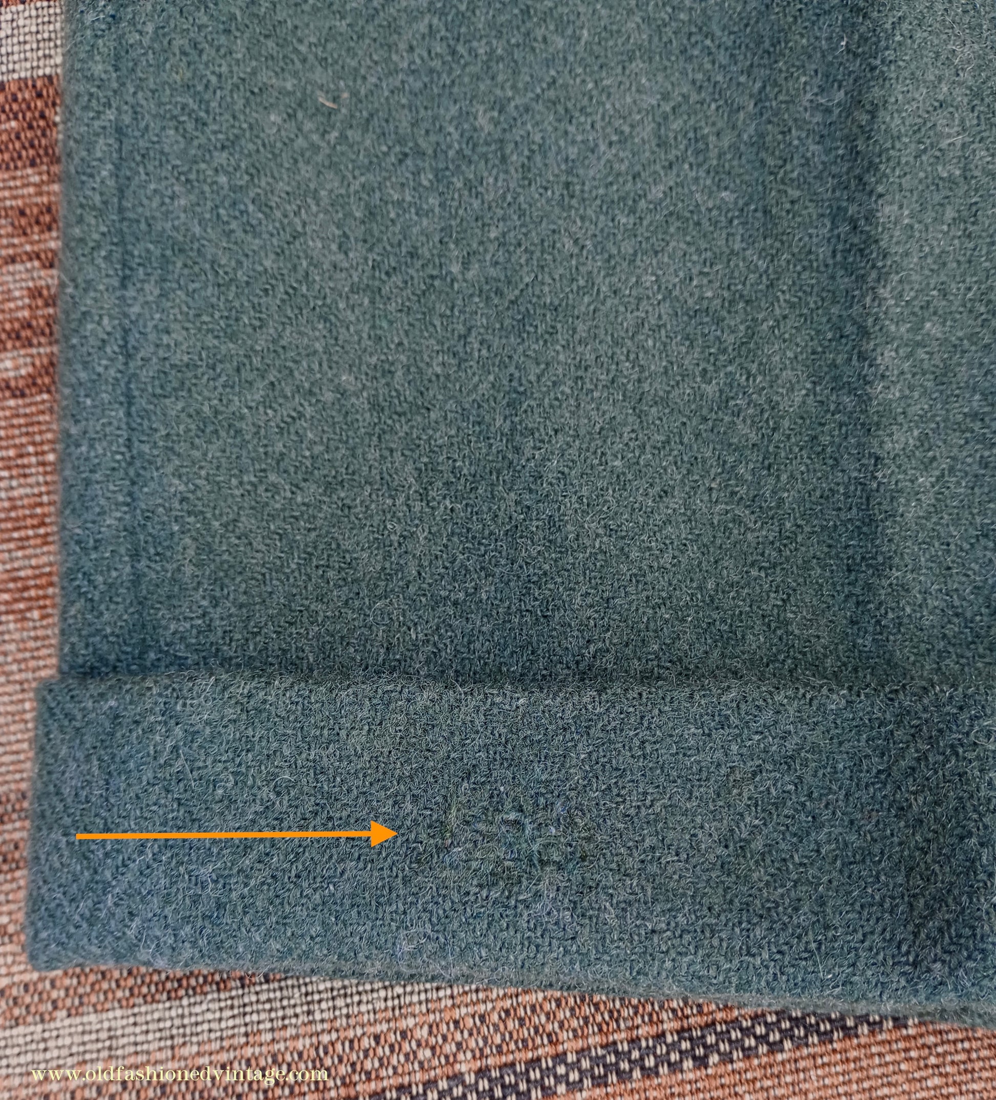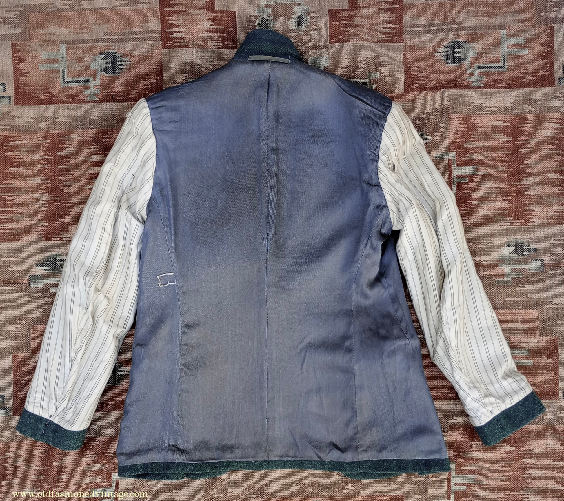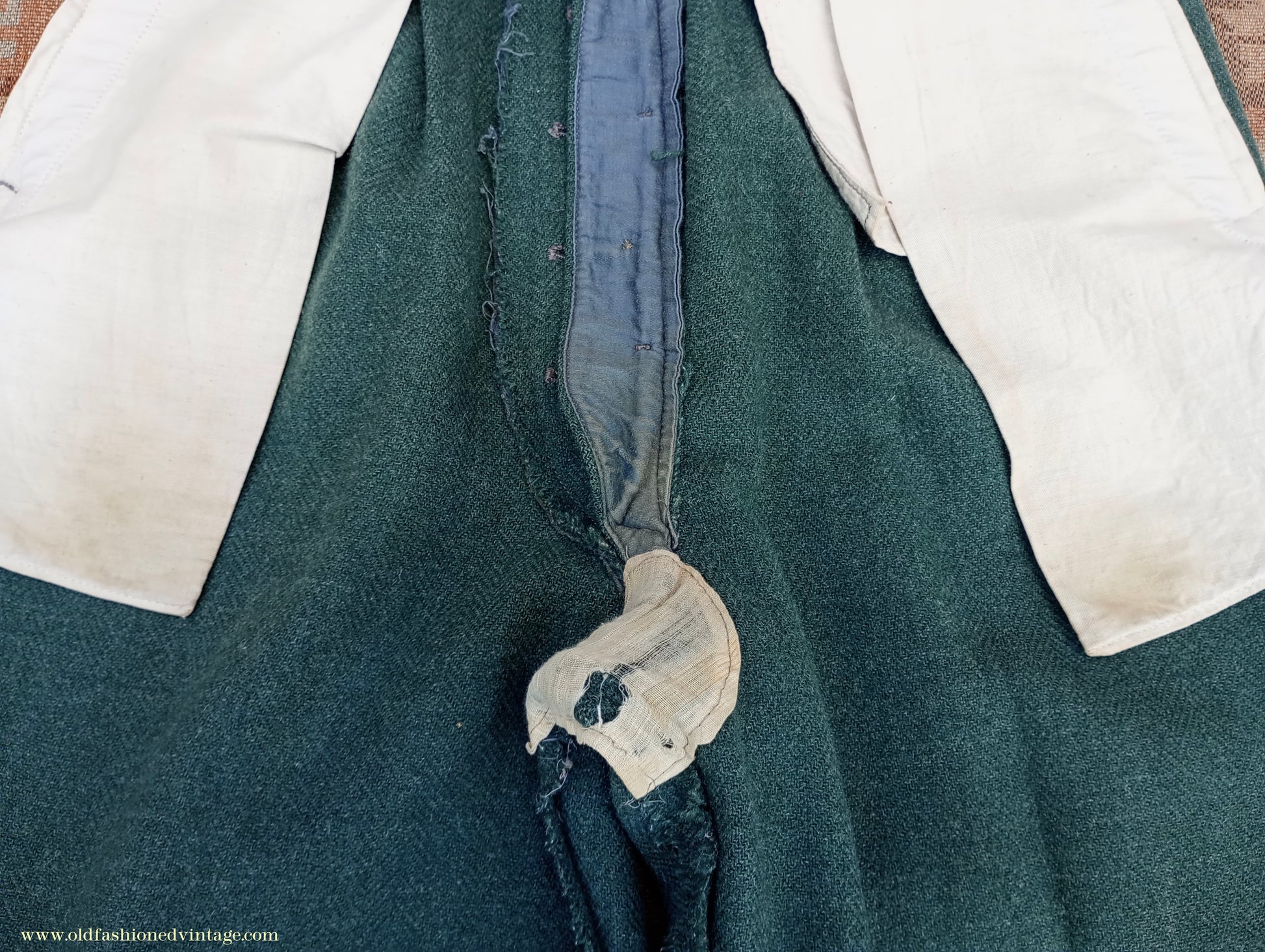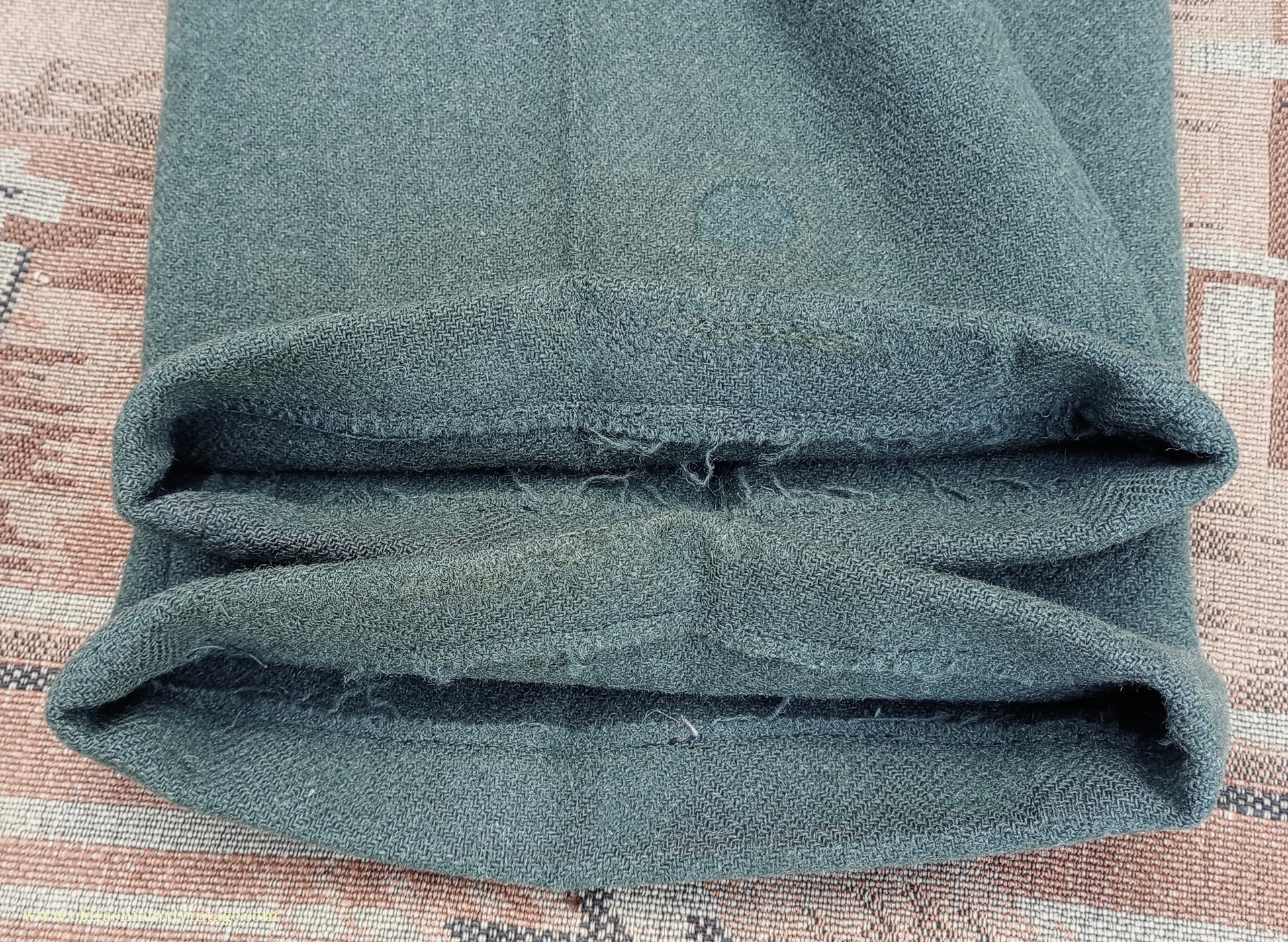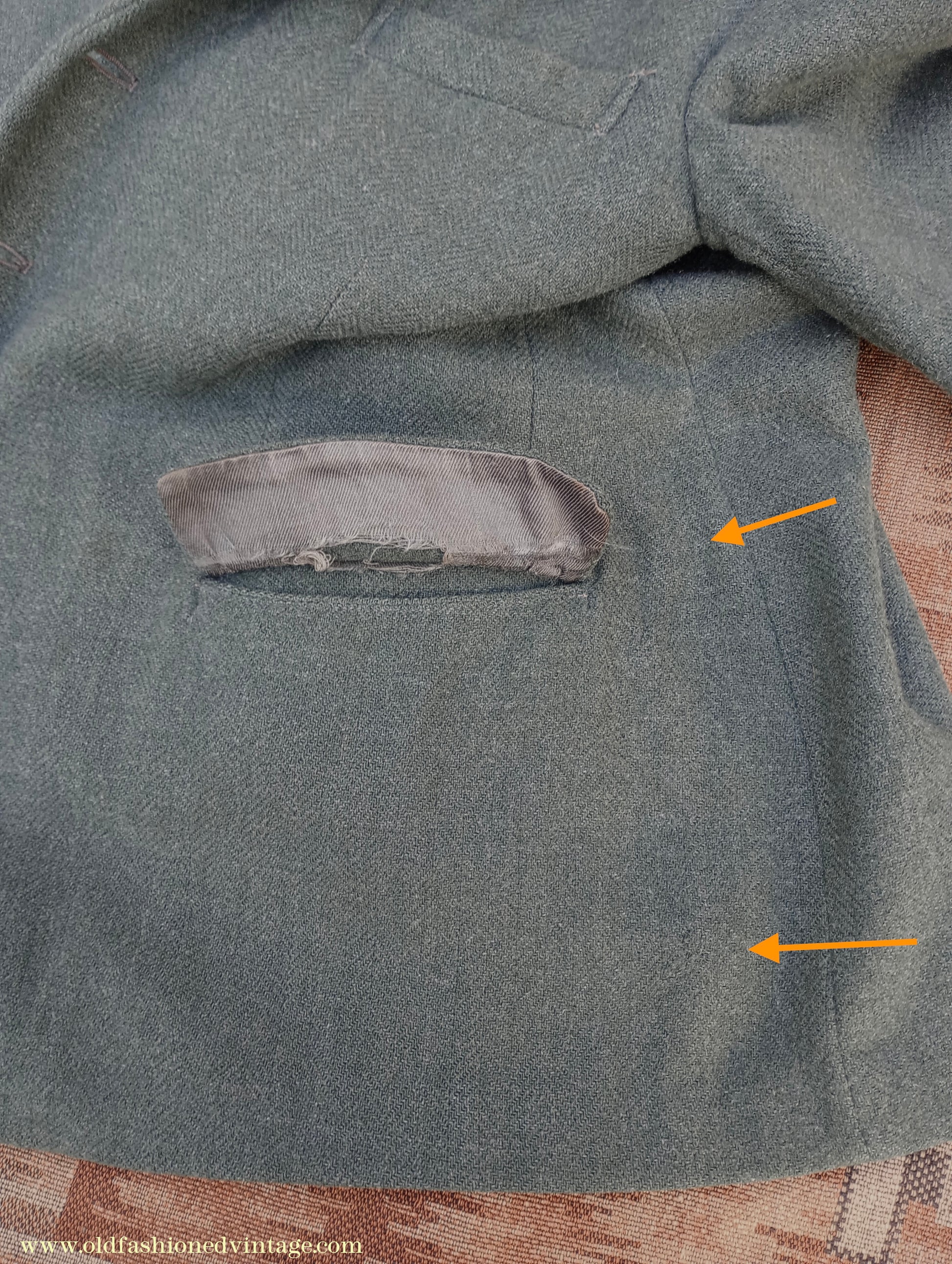 The jacket has 2 discreet repairs on the lower left side (arrowed) & wear/holes to the left pocket flap lining - the lining has scuffs, snags, some marks, & wear to the top pocket edges. The trousers have a patch repair to each lower back inside leg (arrowed); the fabric for these has been cut from inside of one of the turn-ups, where a different piece has been inserted, so it would be difficult or impossible to alter the leg length (see close ups); in my opinion these patches would not be overly apparent when worn but photos on a model are included to help you decide - repairs & reinforcement patching to the hem edges - a repair to the right outside front turn-up (arrowed) - some discolouration, stains & wear to the pocket bags & crotch lining - repairs behind 2 of the brace buttons, which are replacements. Has been thoroughly steamed & brushed prior to listing.