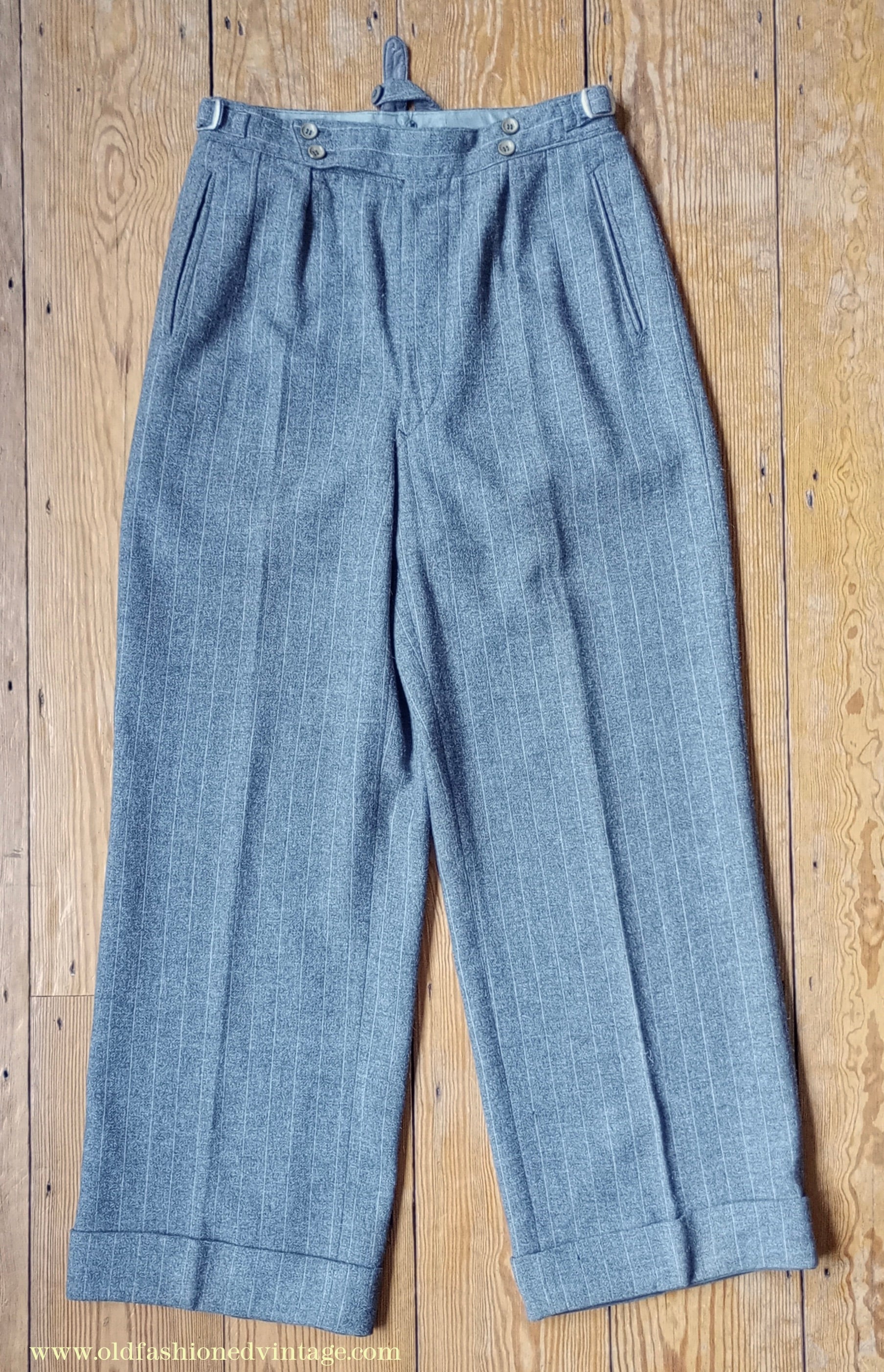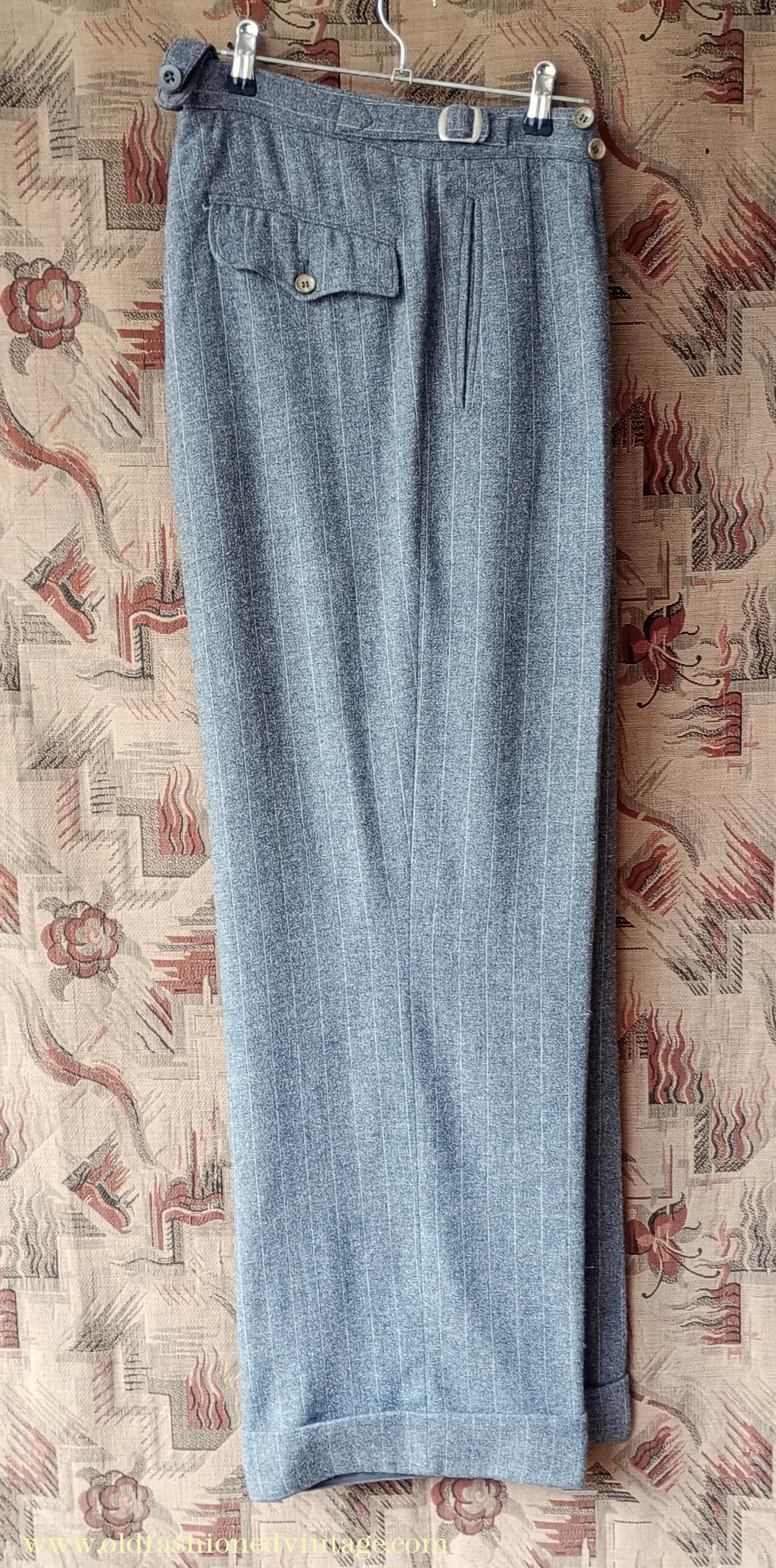 Excellent vintage 1940s German trousers made from a medium weight wool flannel type fabric in marled mid-grey with white pinstripes. They are full-cut & wide in the leg, have fronts with one inward pleat & one dart, super detailed waistband with extended, angle-ended double-button tab with corresponding opposite decorative buttons, side adjuster tabs with fancy embossed buckles, button fly, braces buttons with rear 'rabbit ear' tabs, 2 welted front pockets, 1 rear pocket with generous scalloped flap & unusual extra-deep 2 1/4" turn-ups made in the Continental half-depth manner.