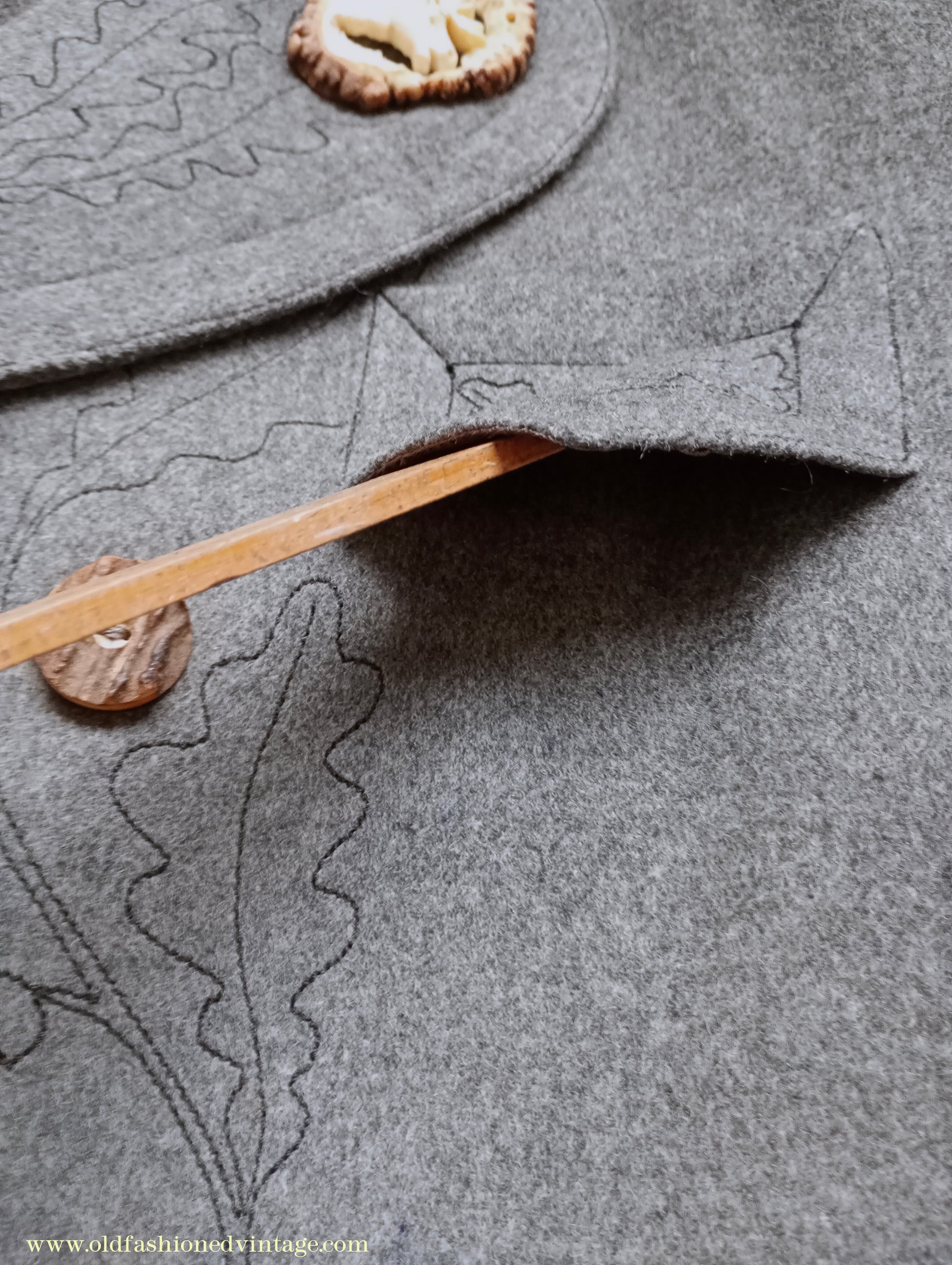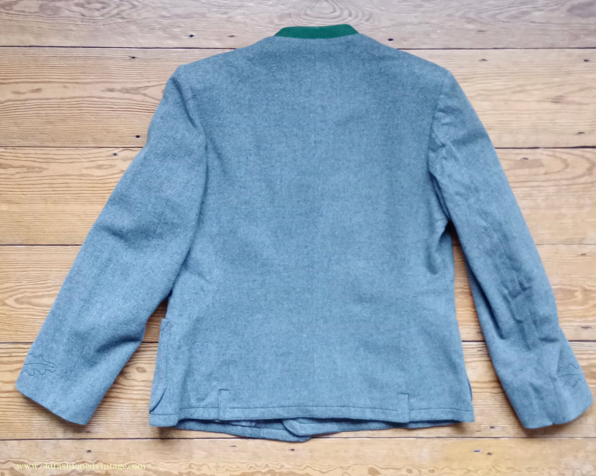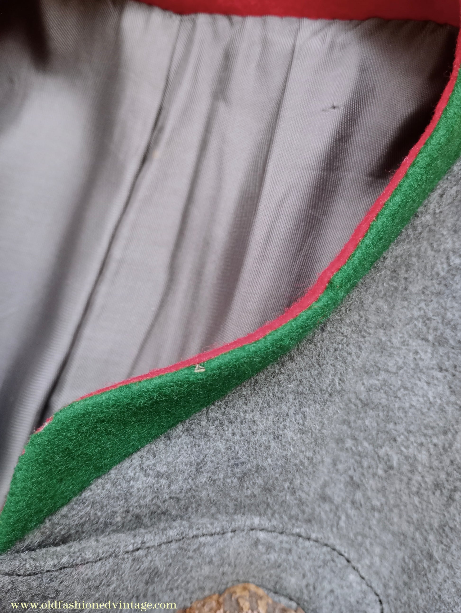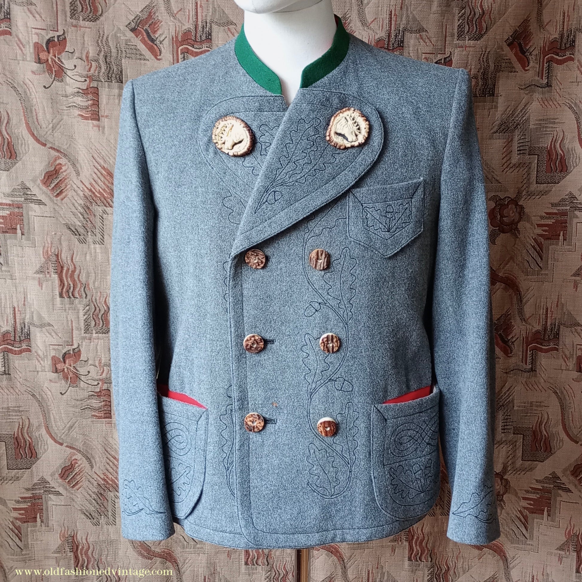 A beautiful vintage circa 1940s German or Austrian 'Janker' Trachten style jacket, made from medium weight wool fabric in a marled mid grey shade with bright red & green trim. 6-button double-breasted with broad, rounded lapels, stand collar, strongly padded shoulders, nicely-shaped, unusual semi-patch pockets with floating bottoms & standard pockets behind. Decorated overall with oak leaf & acorn embroidery and fitted with especially large, intricately carved stag horn lapel badges & horn buttons - fully lined with grey rayon & grey/white striped sleeve linings. No labels present.