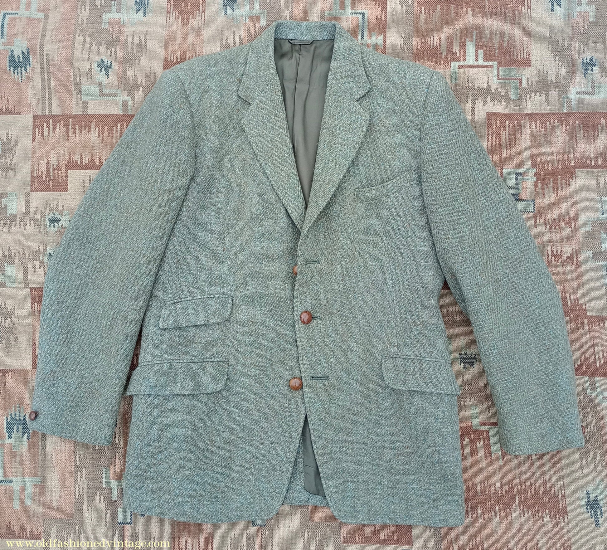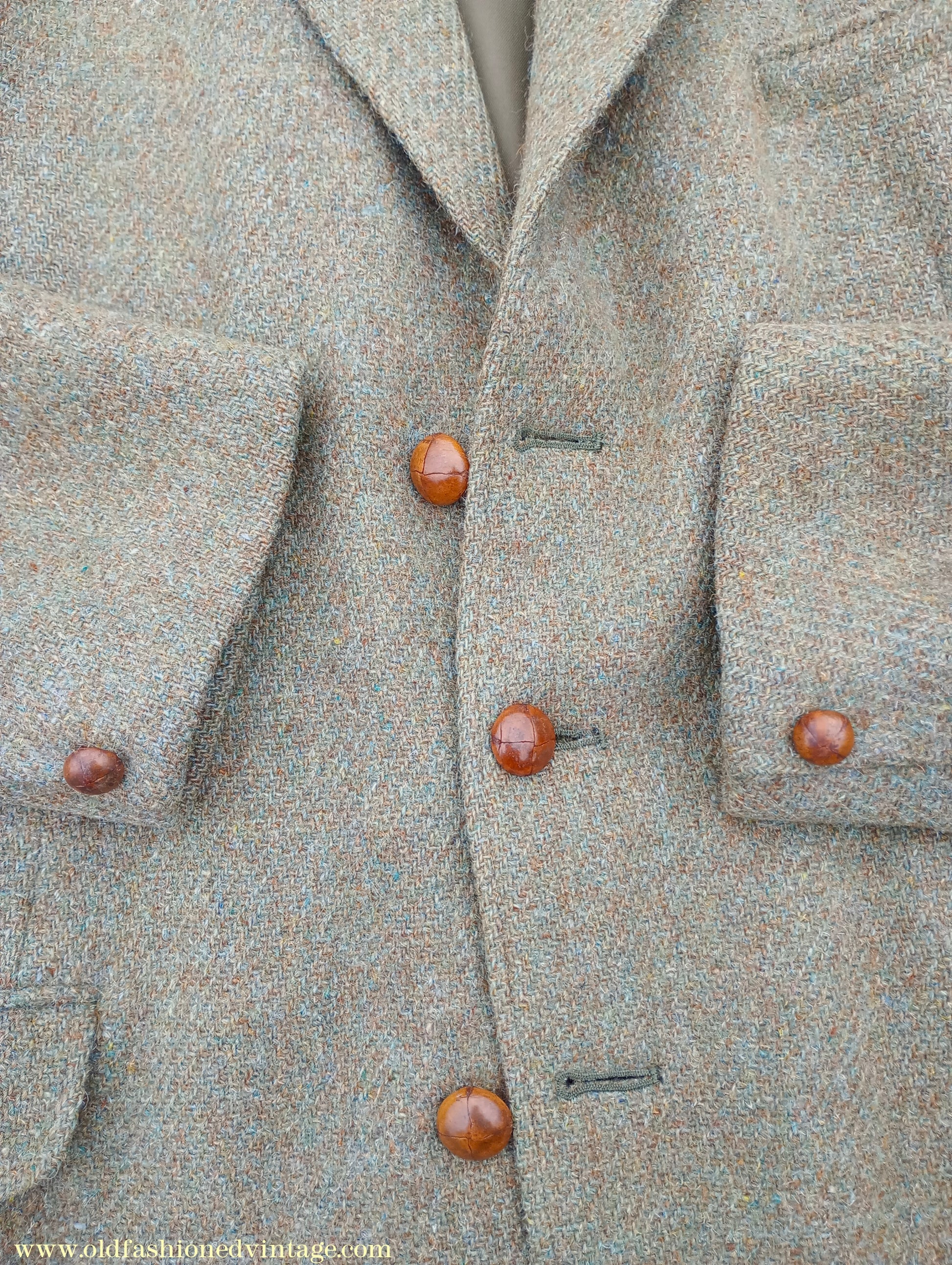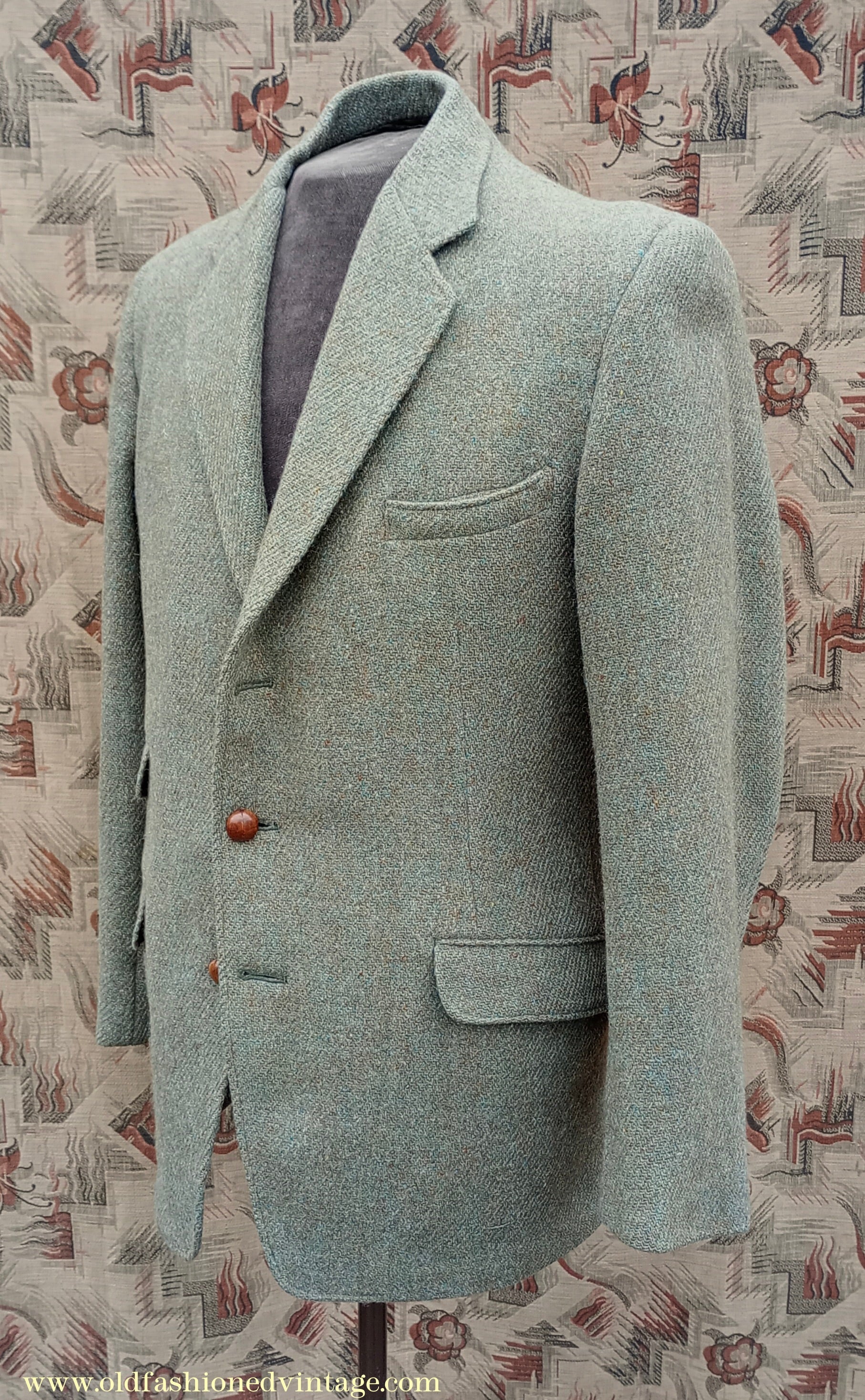 A vintage late 1950s to early 1960s Harris Tweed sports jacket, made by 'Hepworths' from 100% pure Scottish wool in a marled mid-green colour - on my screen the close-up of the buttons is most accurate. Single breasted 3-button fastening with medium lapels - centre vent - medium padded shoulders - slightly fitted waist - welted breast & angled lower flapped hand & ticket pockets - leather 'football' buttons - body lined with olive green rayon/acetate with 1 chest & pocket, sleeves lined with ivory. The Harris label is the shield type of the Independent producers (rather than the Orb of the Association), which came into use in 1958 & was prohibited after a court case in about 1962.
