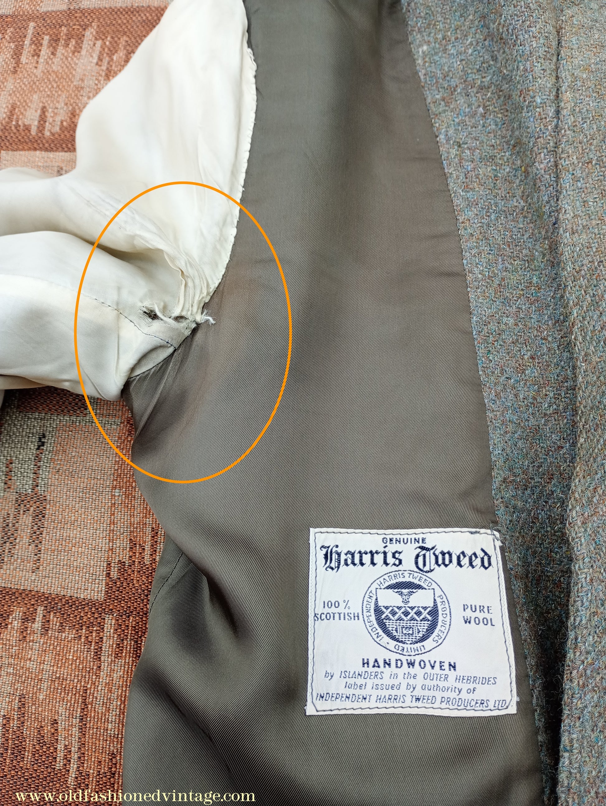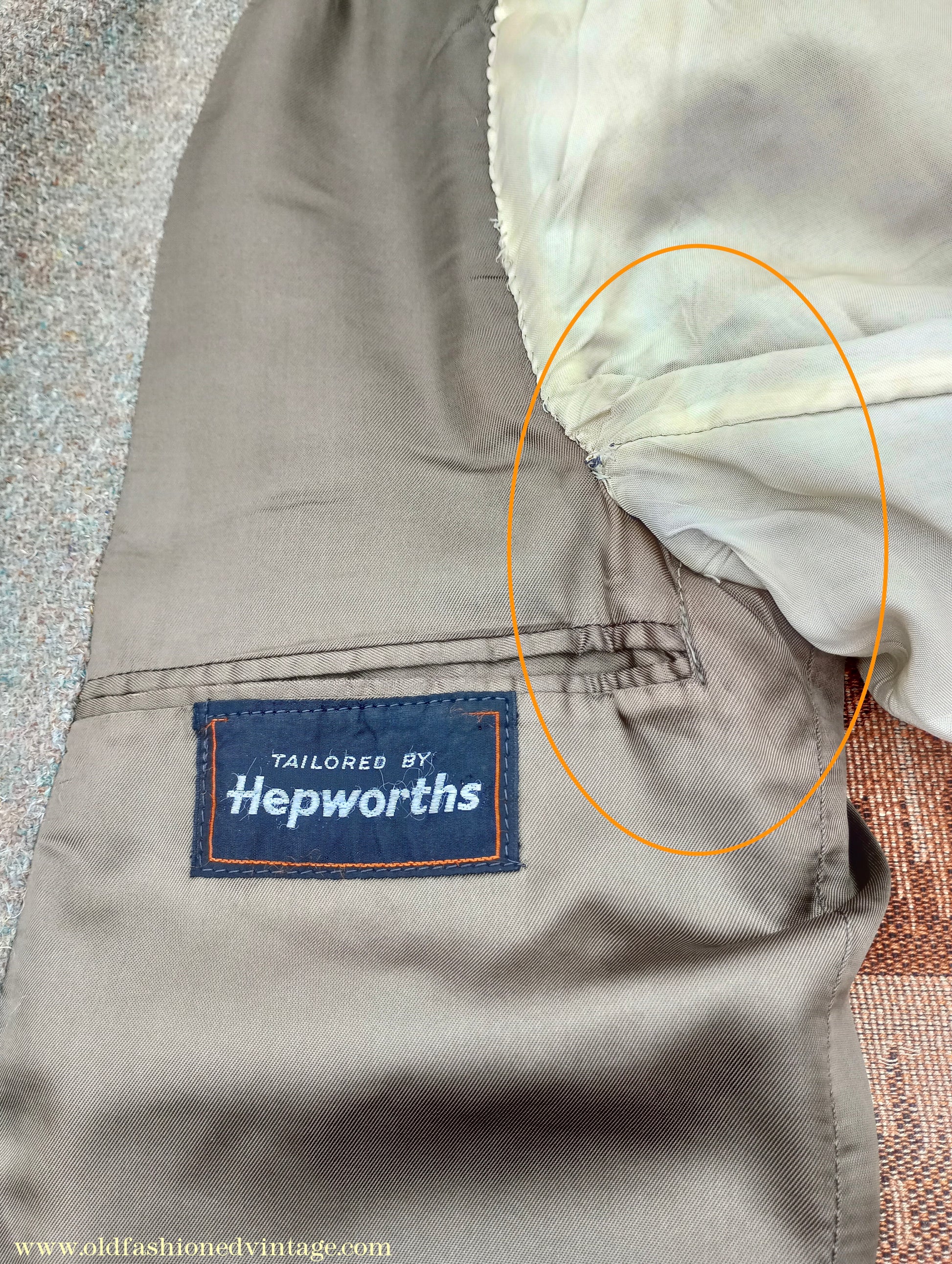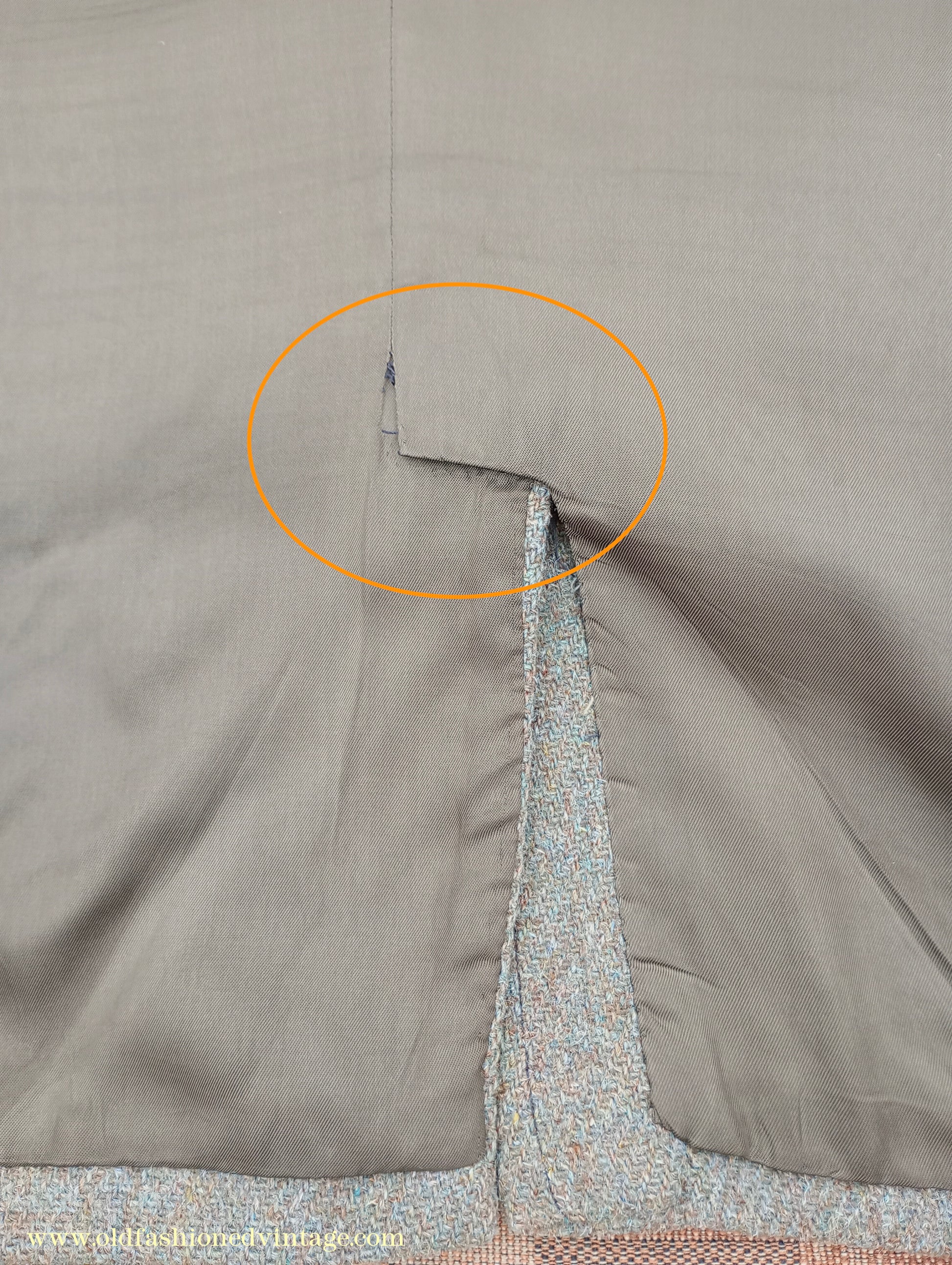 In very good condition with light wear overall - externally there is a slight overall patina (apparent when looking under the lapels) - a few snags & pulls - a small loop of yarn, perhaps a weaving defect, towards the left front hem (circled) - internally some marks & scuffs to the lining - staining & discolouration at the underarms, with a tear to the left sleeve liner (circled) - some broken stitching at the top of the vent. Has been thoroughly steamed & brushed prior to listing but an underarm smell & some storage mustiness remain.