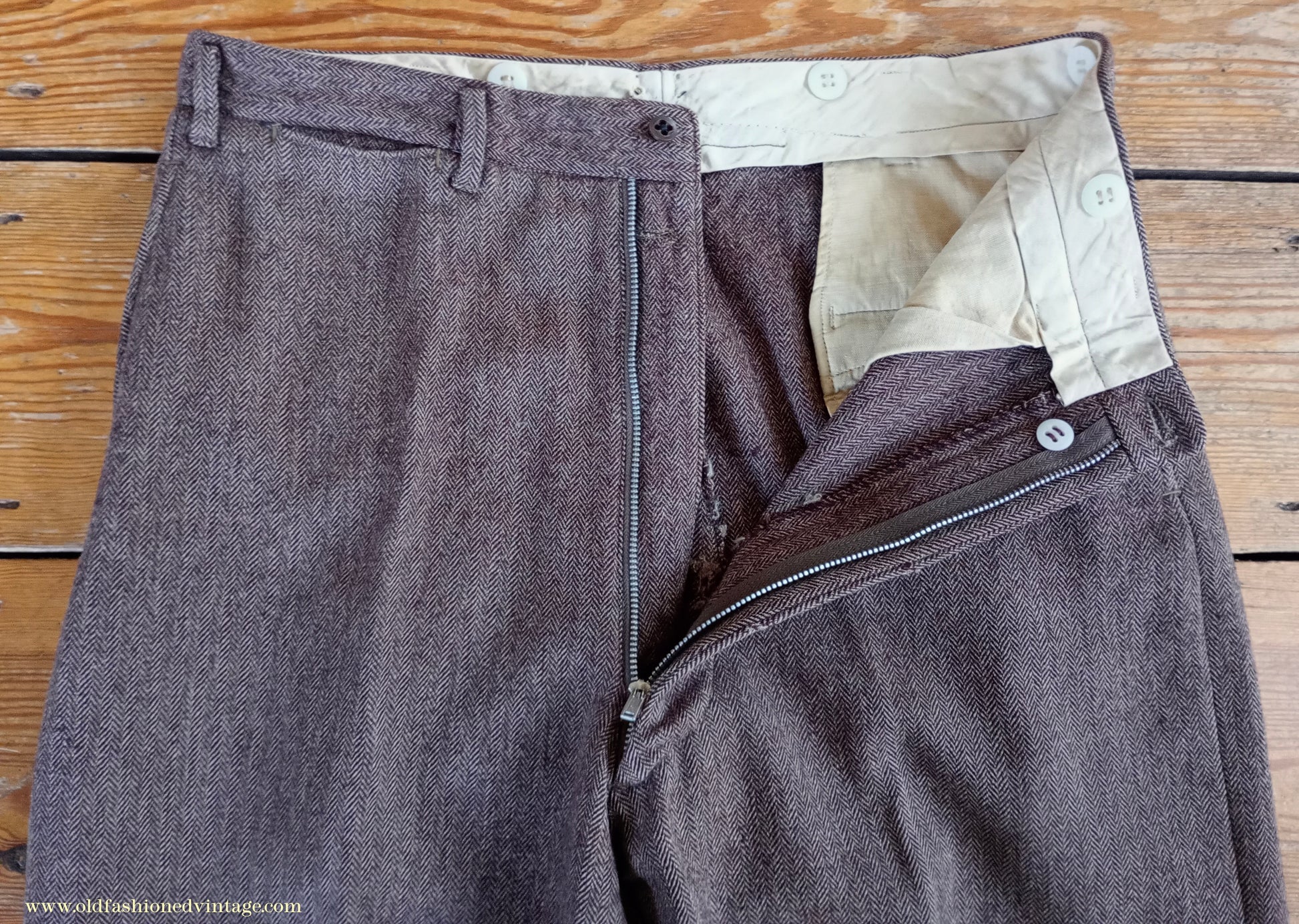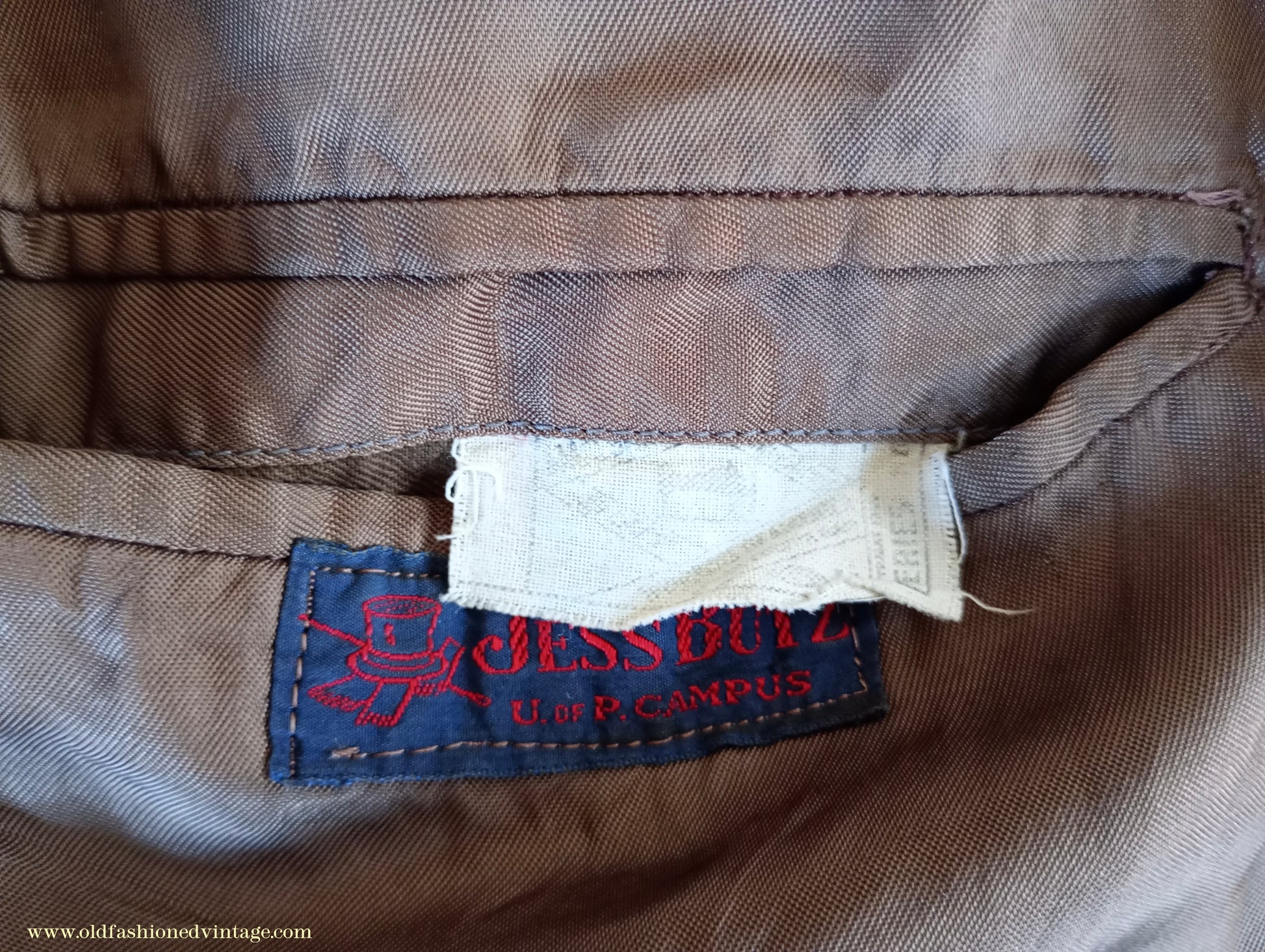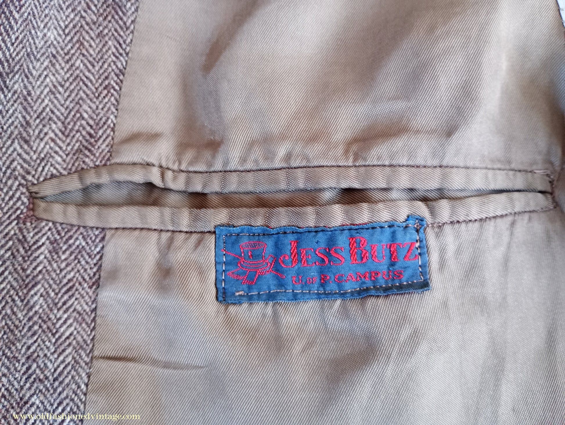 A vintage 1950s two-piece suit from 'Jess Butz', the campus menswear shop at the University of Pennsylvania, made from a fairly soft, finely woven herringbone wool tweed fabric in mid-brown tones. Single-breasted 3-roll-2 button sack jacket with lightly padded shoulders, notch lapels, centre vent, welted chest & lower flap pockets, cuffs with 2 decorative buttons; part lined in brown rayon with ivory sleeve linings. Trousers are flat fronted, with belt loops, braces buttons, side slip, watch & 2 rear pockets, Talon zip fly, turn-ups. A classic American Ivy style suit, looks a lot like Brooks Brothers of this era, & in fact came to me years ago with a Brooks suit from the same owner but isn't labelled as such.