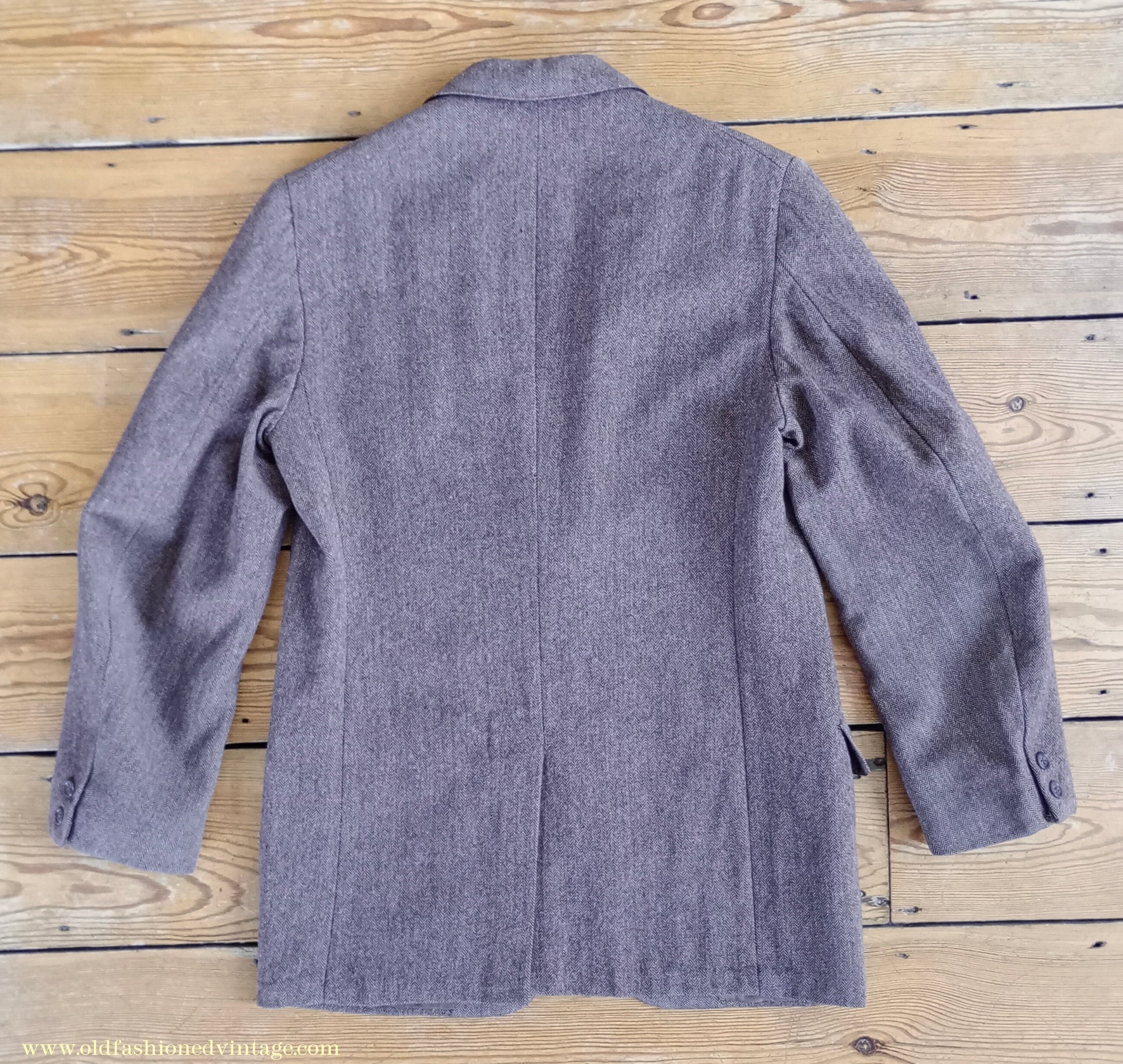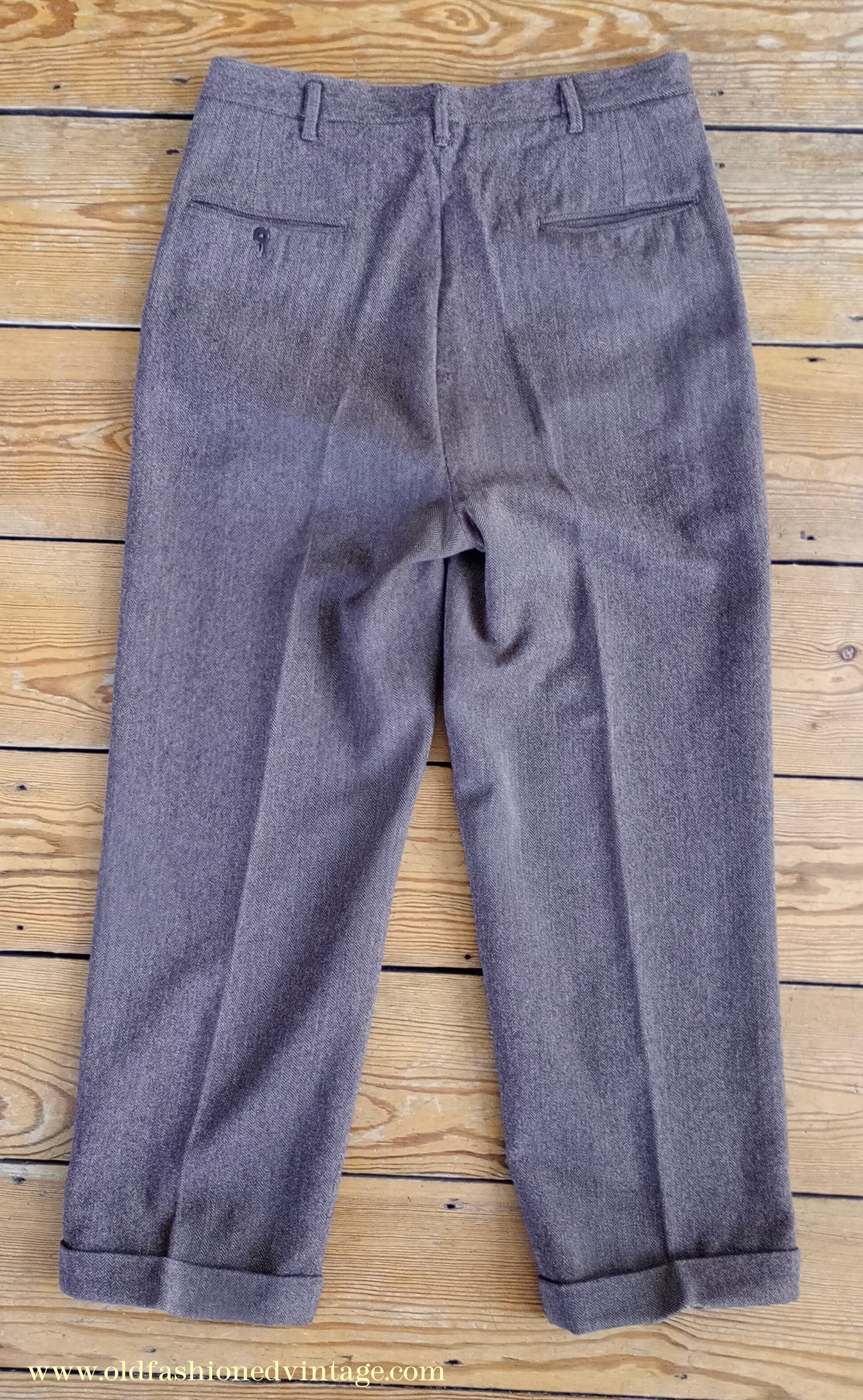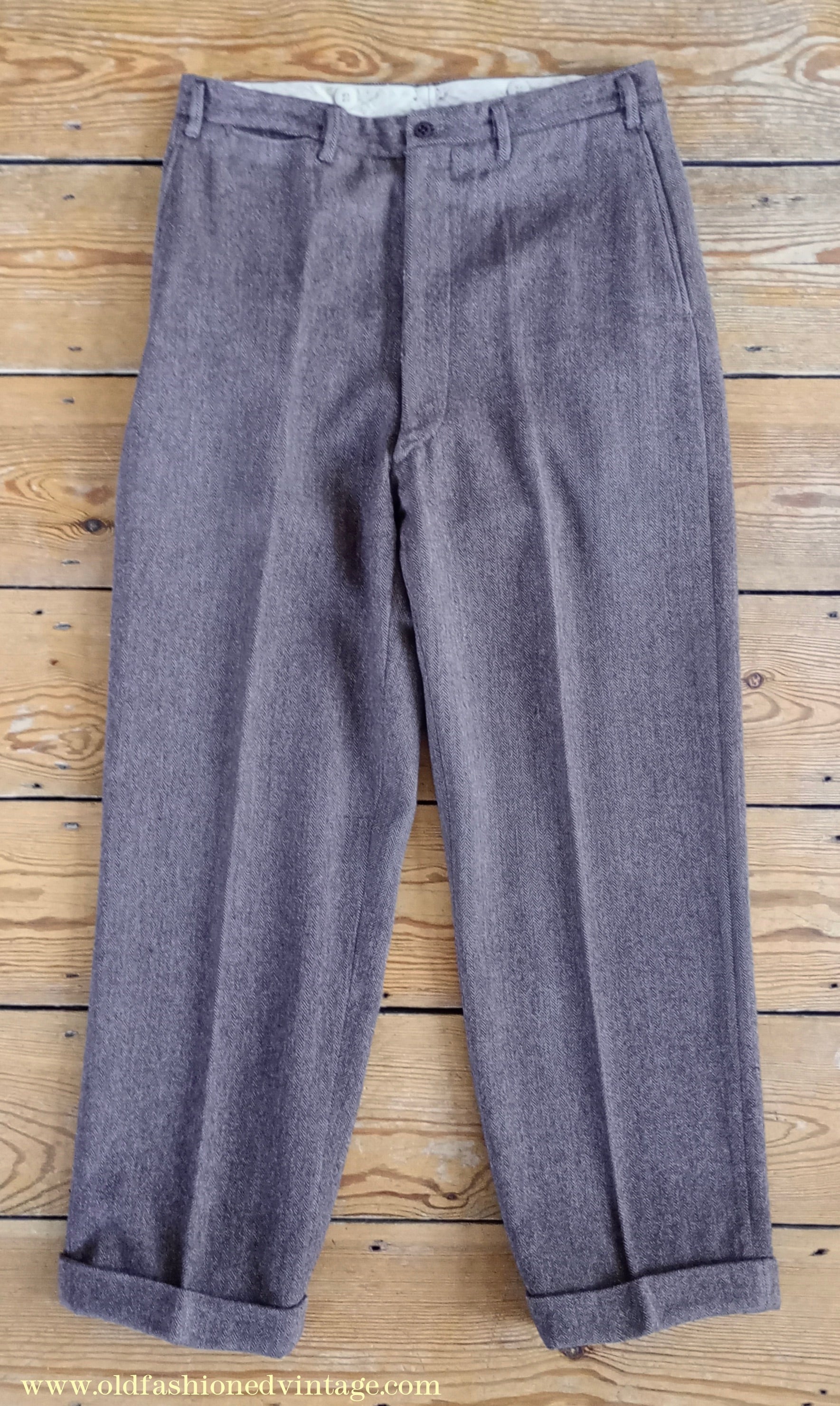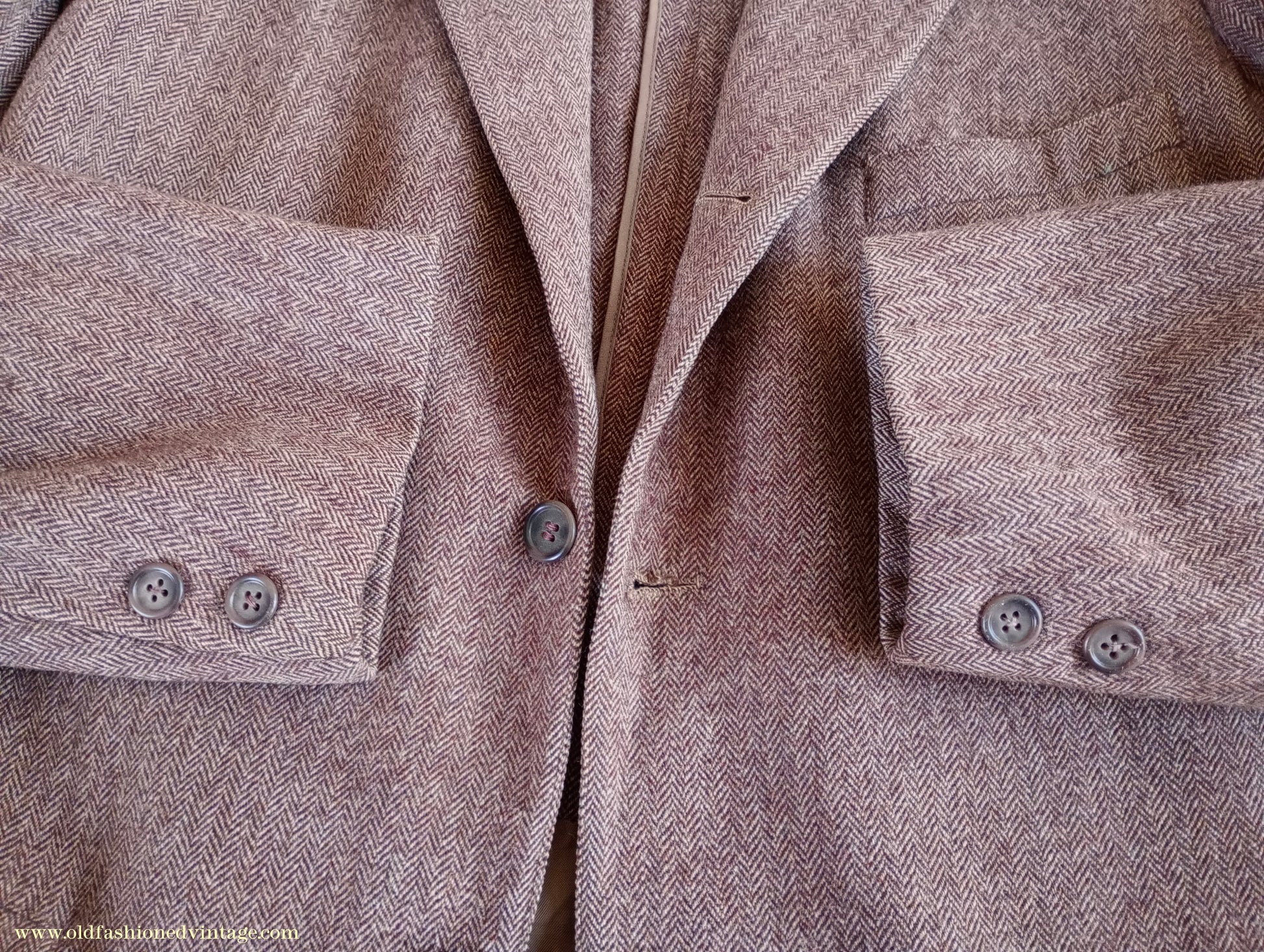 A vintage 1950s two-piece suit from 'Jess Butz', the campus menswear shop at the University of Pennsylvania, made from a fairly soft, finely woven herringbone wool tweed fabric in mid-brown tones. Single-breasted 3-roll-2 button sack jacket with lightly padded shoulders, notch lapels, centre vent, welted chest & lower flap pockets, cuffs with 2 decorative buttons; part lined in brown rayon with ivory sleeve linings. Trousers are flat fronted, with belt loops, braces buttons, side slip, watch & 2 rear pockets, Talon zip fly, turn-ups. A classic American Ivy style suit, looks a lot like Brooks Brothers of this era, & in fact came to me years ago with a Brooks suit from the same owner but isn't labelled as such.