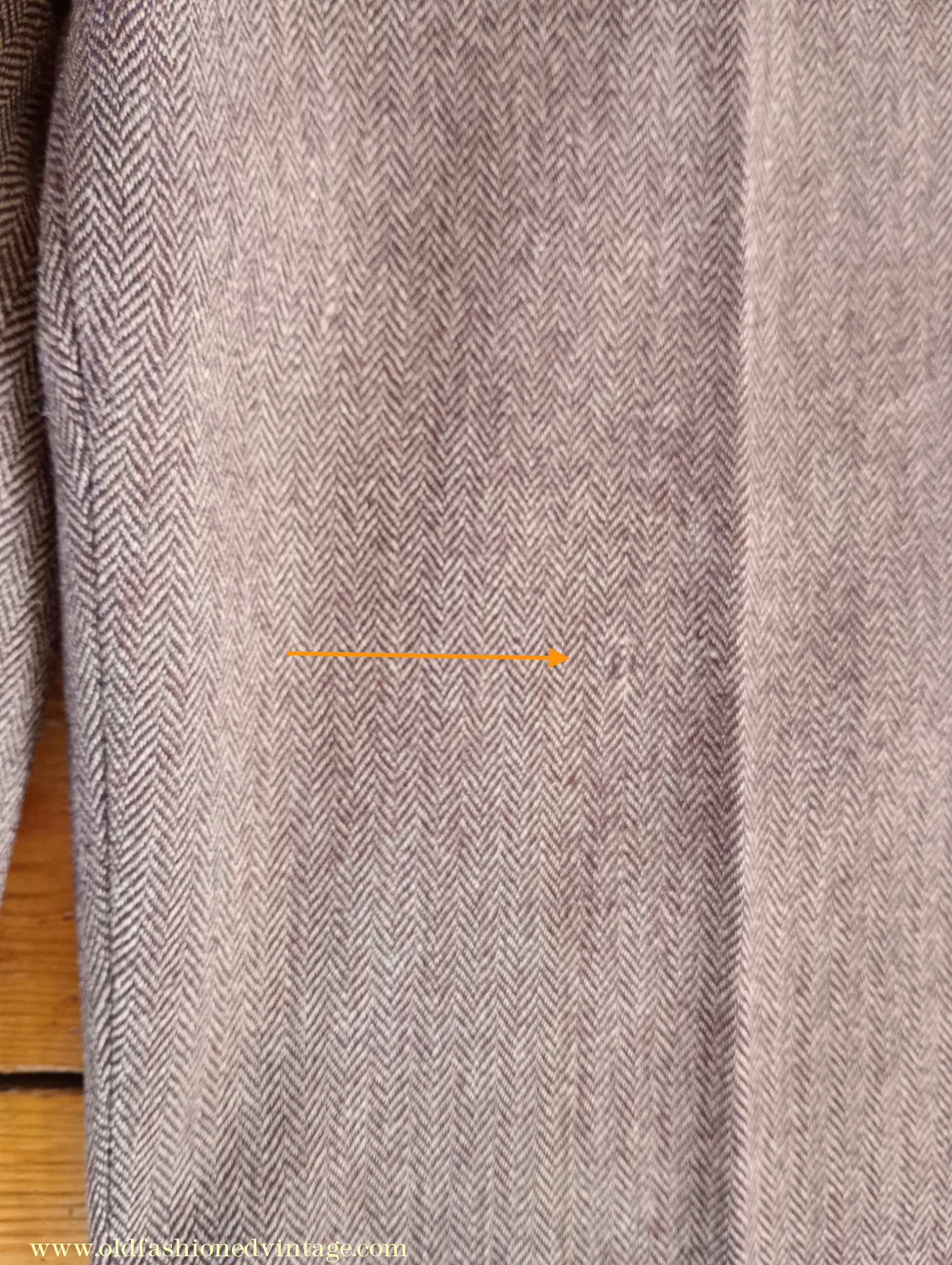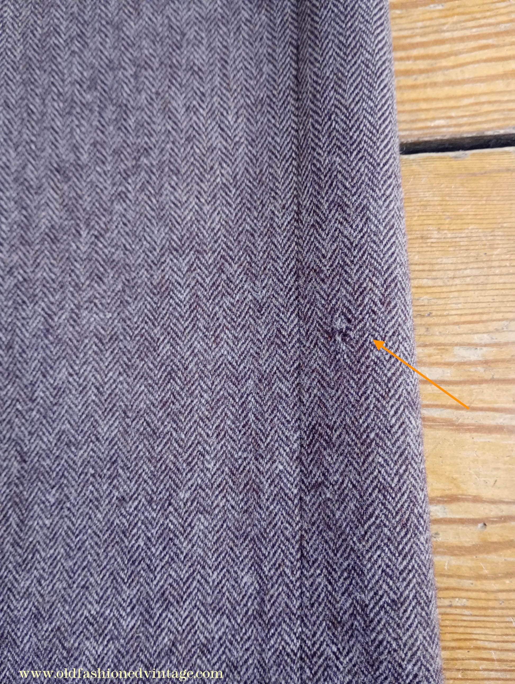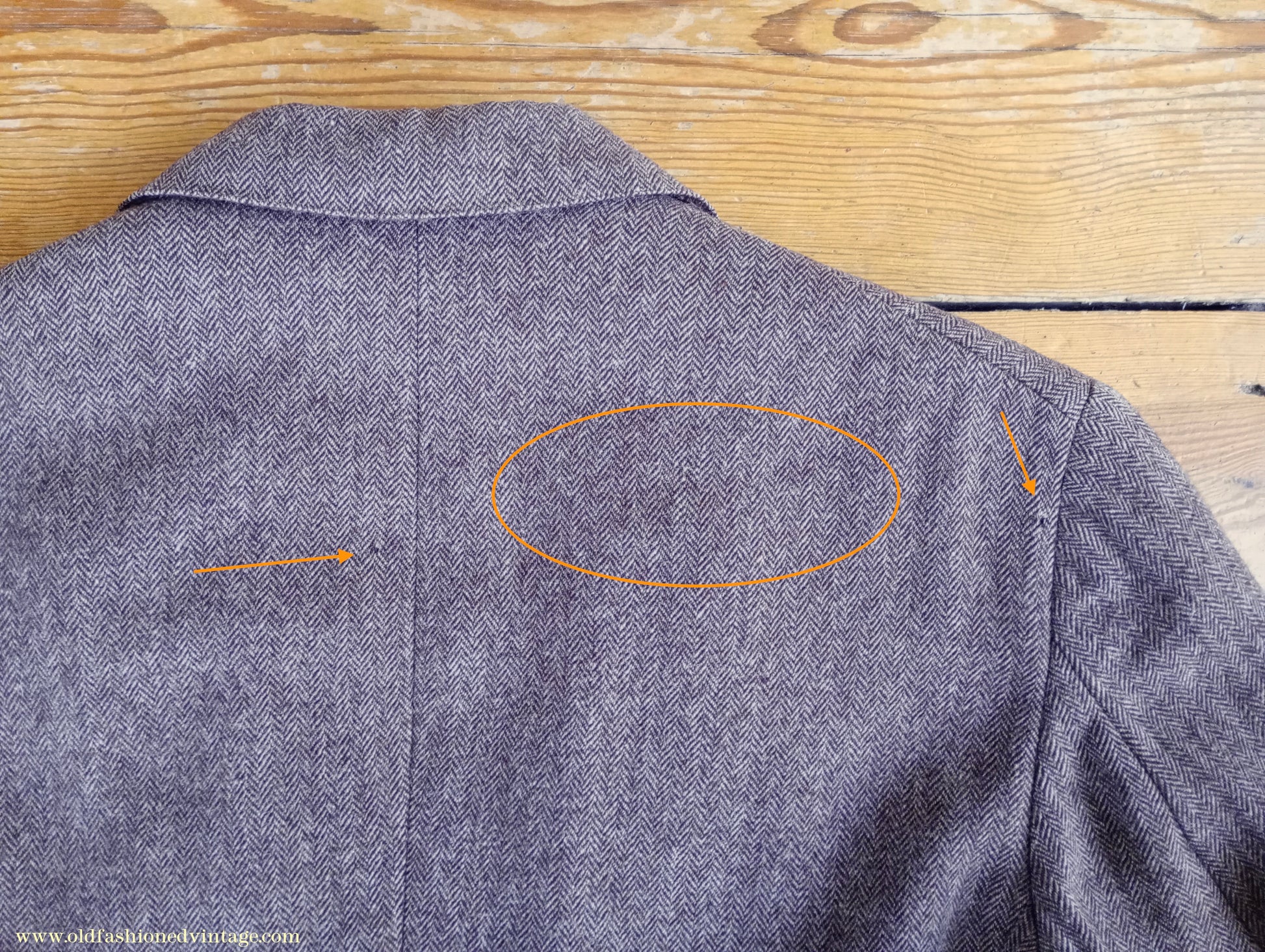 In good condition overall, with some signs of use & minor flaws - there is surface wear to the elbows, thighs, seat of the trousers & other contact points - the jacket has 2 small holes & a very faint dark mark to the upper right back (arrowed & circled), wear to the centre buttonhole, some watermarks to the lining - the trousers have 2 worn areas on the fly edge (arrowed), a small repair to the left knee & another to the outside left calf, some fraying at the hem, some invisible repairs along the seat seam, the seat seam has been let out to the max & is a bit untidy, the linings & pocket bags are discoloured & have some stains. Has been thoroughly steamed & brushed prior to listing.