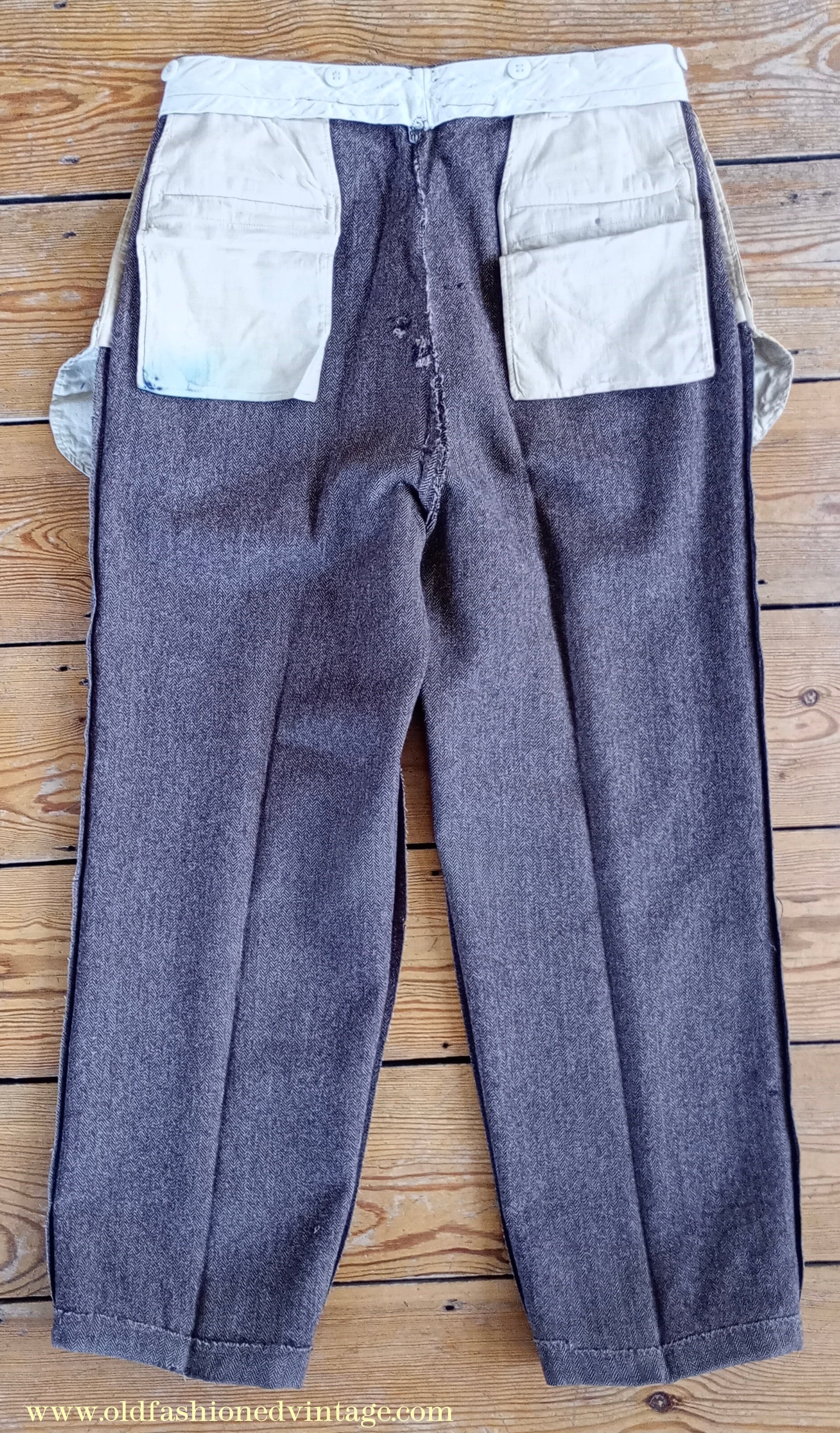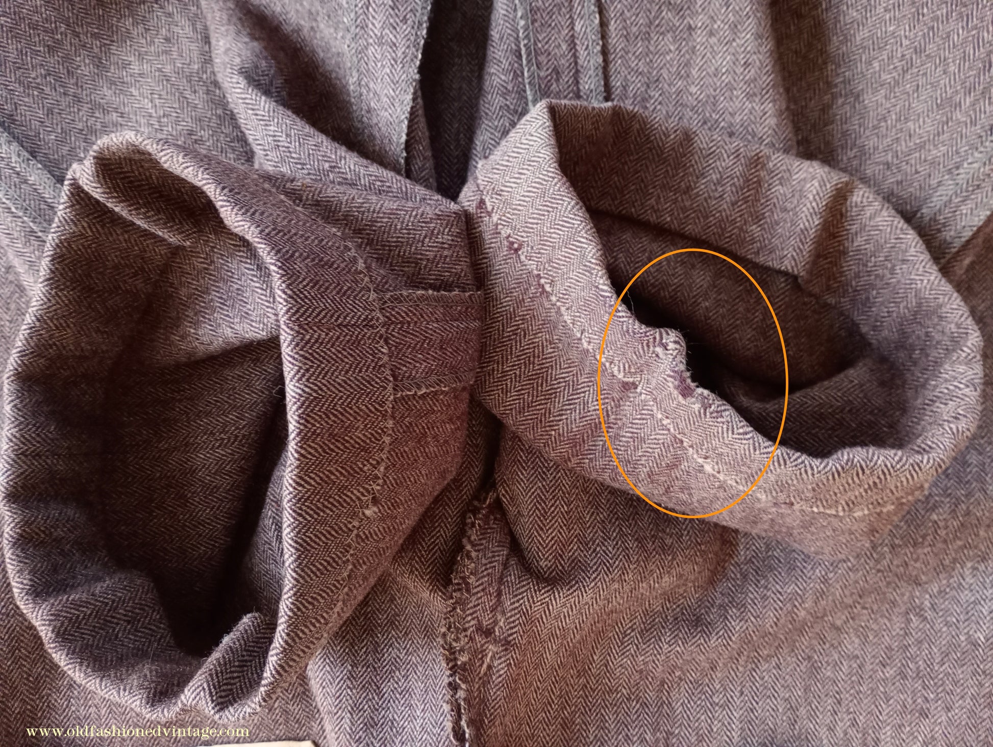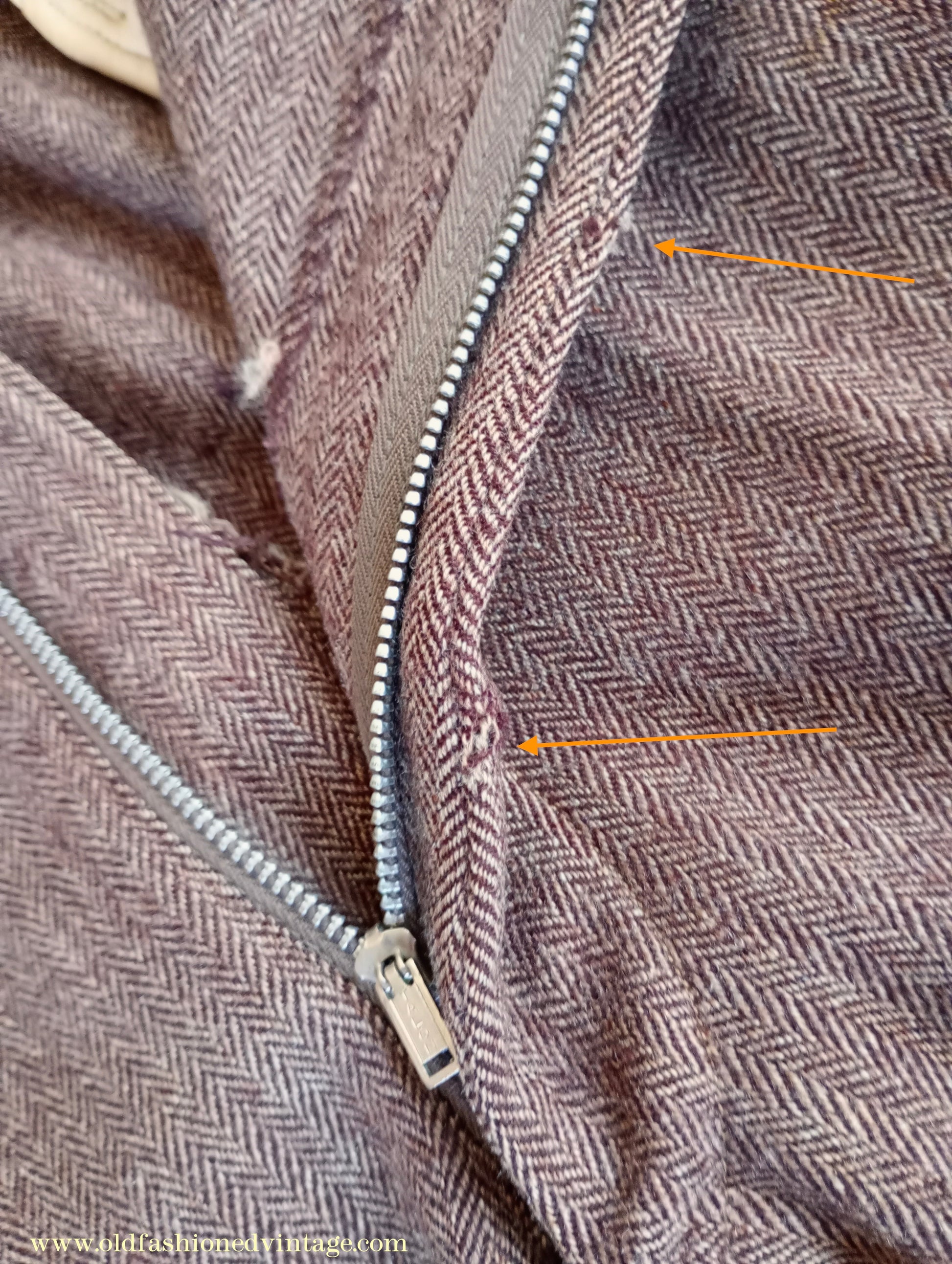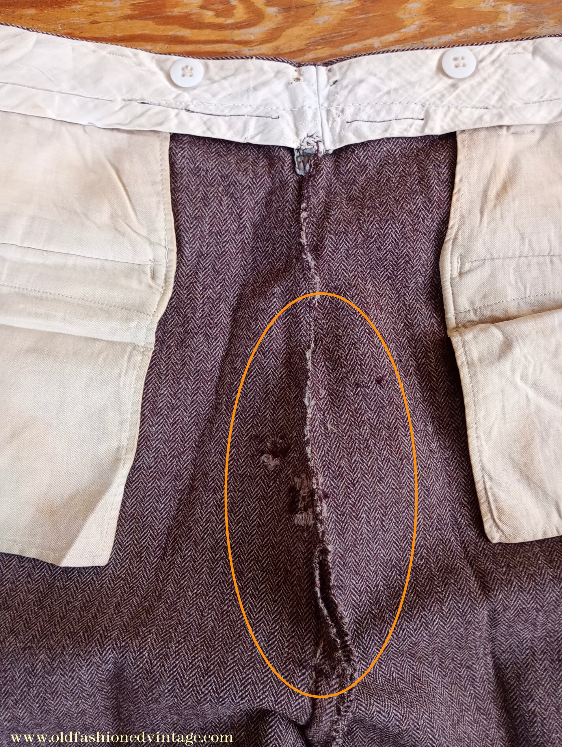 In good condition overall, with some signs of use & minor flaws - there is surface wear to the elbows, thighs, seat of the trousers & other contact points - the jacket has 2 small holes & a very faint dark mark to the upper right back (arrowed & circled), wear to the centre buttonhole, some watermarks to the lining - the trousers have 2 worn areas on the fly edge (arrowed), a small repair to the left knee & another to the outside left calf, some fraying at the hem, some invisible repairs along the seat seam, the seat seam has been let out to the max & is a bit untidy, the linings & pocket bags are discoloured & have some stains. Has been thoroughly steamed & brushed prior to listing.