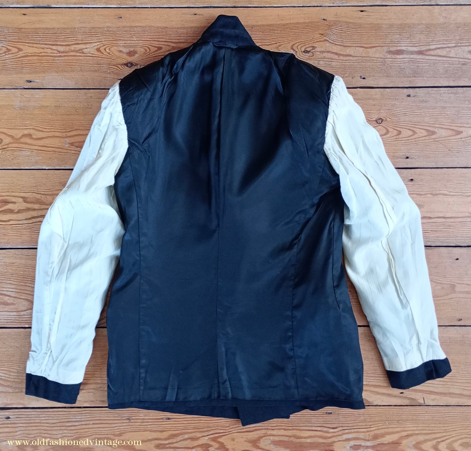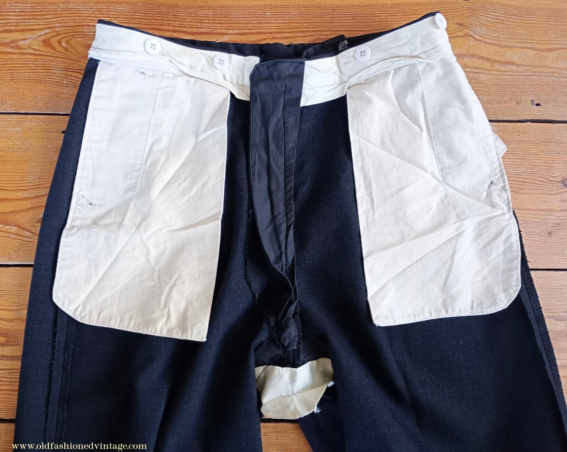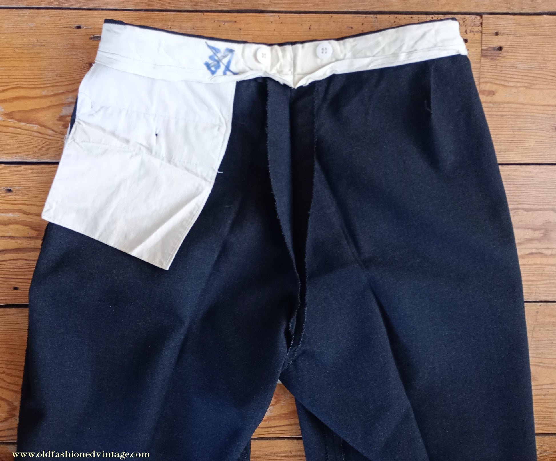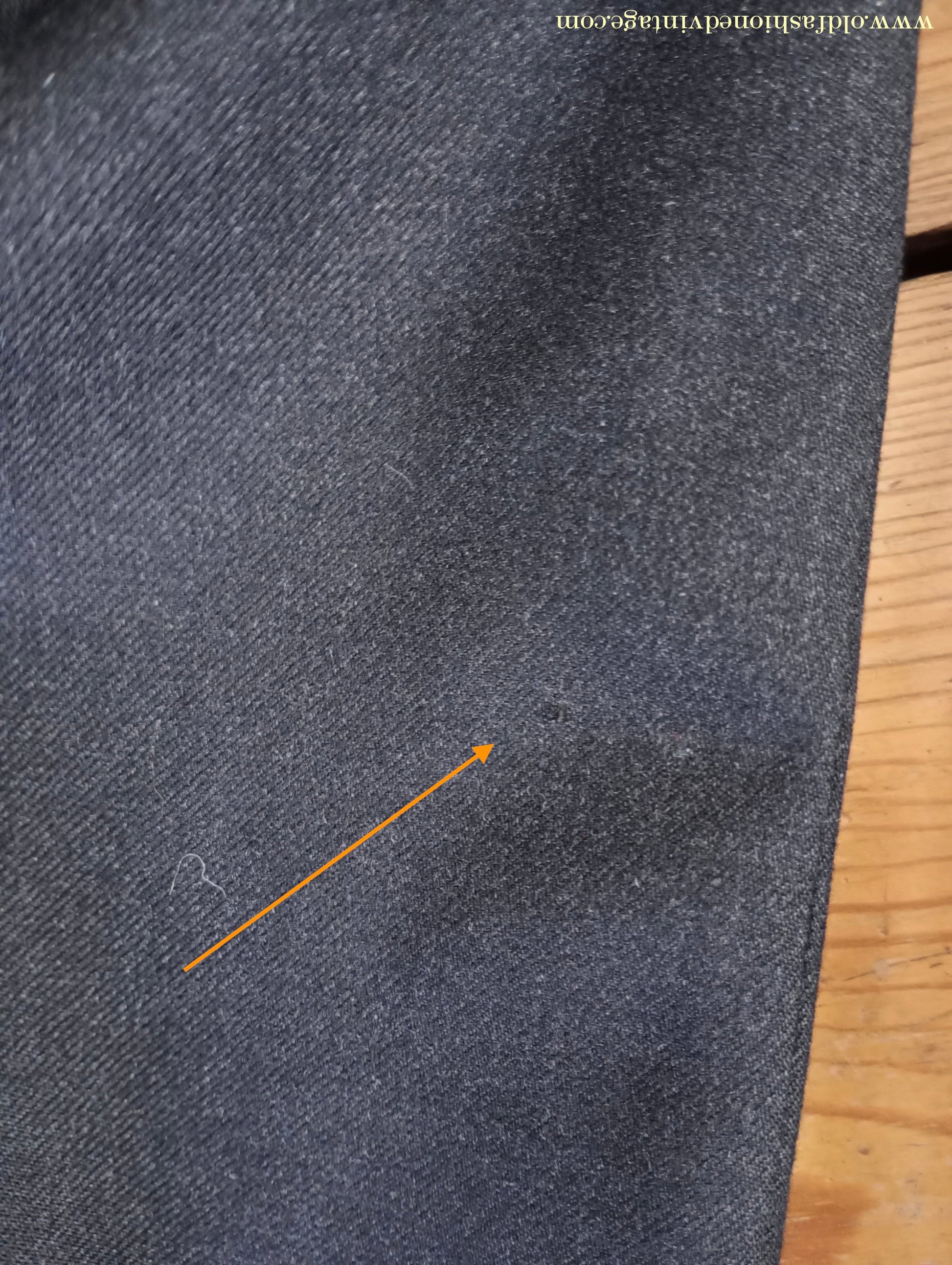 In excellent condition overall, does not appear much worn - apparently once the property of a costume company, who have written sizes inside - there is a barely visible tiny rub/fray on the inner left sleeve & a small hole on the outer right leg at about knee level (both arrowed) - the top 2 cuff buttons are odd replacements - the turn-ups have been pressed & tacked at 1 1/4" depth to gain length. Has been thoroughly steamed & brushed prior to listing but a faint storage mustiness remains.