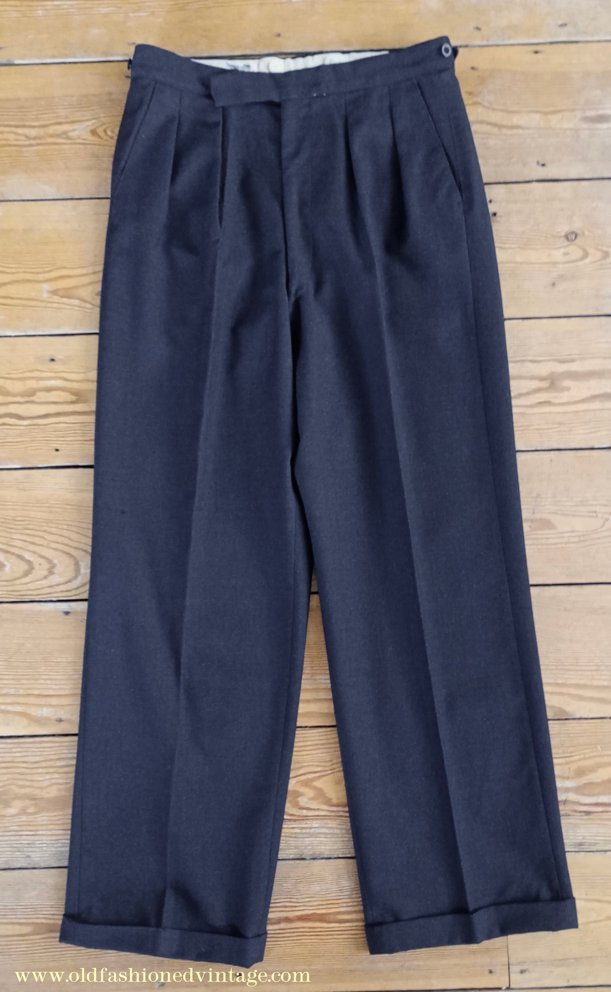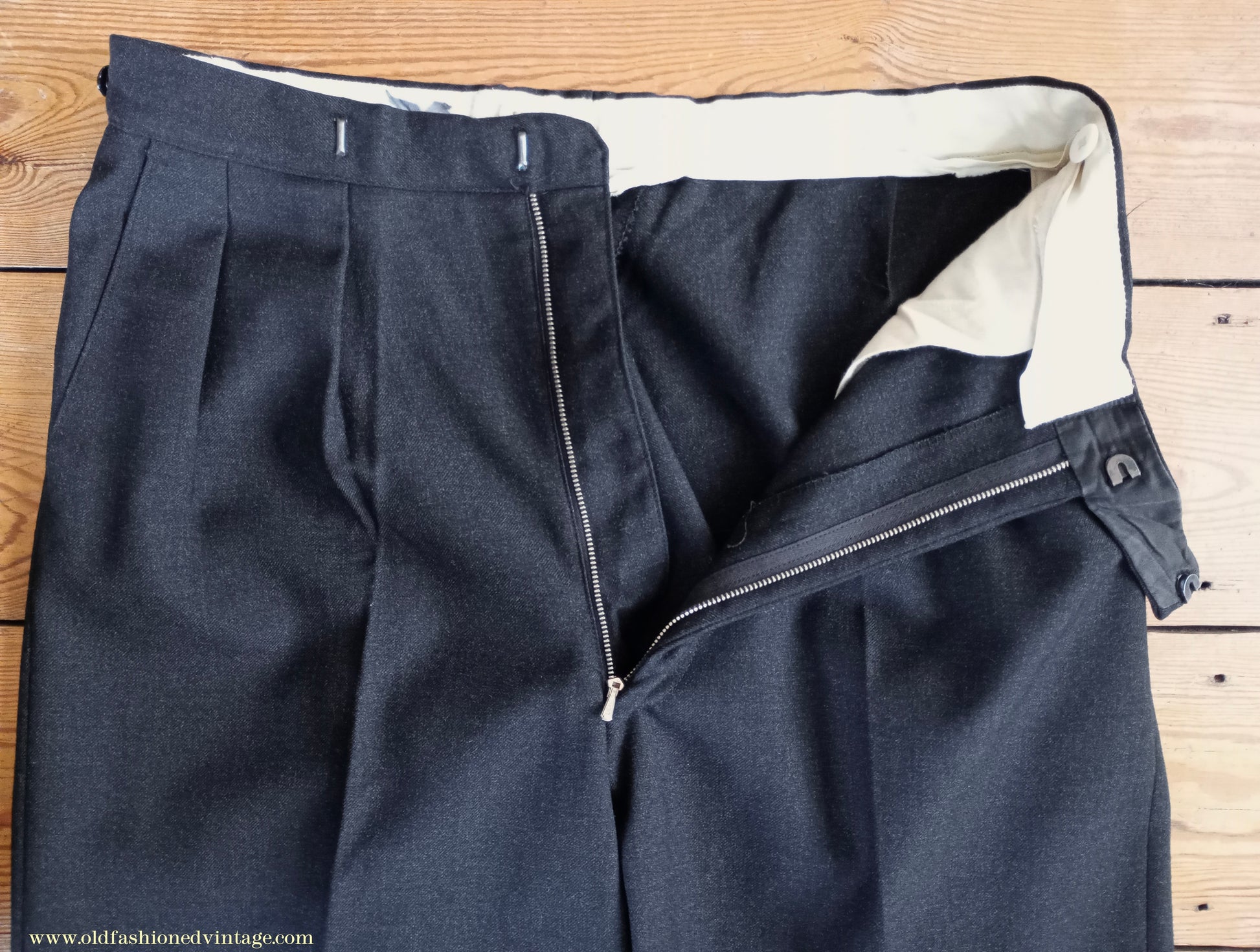 A vintage Burtons two-piece suit from the second half of the 1950s, made from wool flannel fabric in dark charcoal grey. The double-breasted jacket has strongly padded shoulders, broad lapels, fitted waist, flapped lower pockets, & 6 x 4 button fastening; it is fully lined in black rayon/acetate twill with ivory striped sleeve linings. The trousers are full-cut & wide in the leg, with double inward pleats, side waist button tab adjusters, 'Lightning' zip fly, brace buttons, turn-ups, and side slip & 1 rear pockets. Apart from the zip fly this is not really very different to Burton suits made in the late '40s.