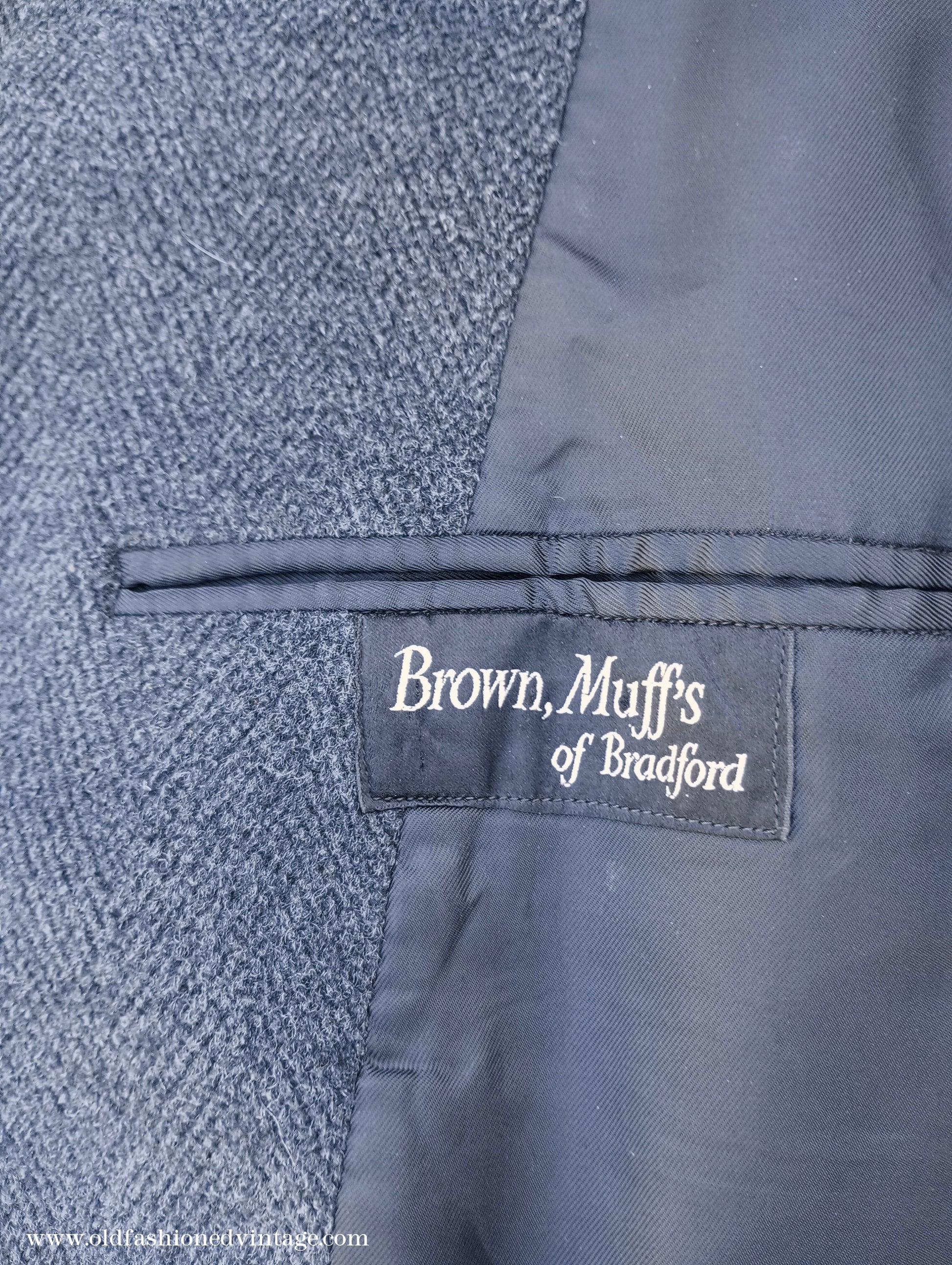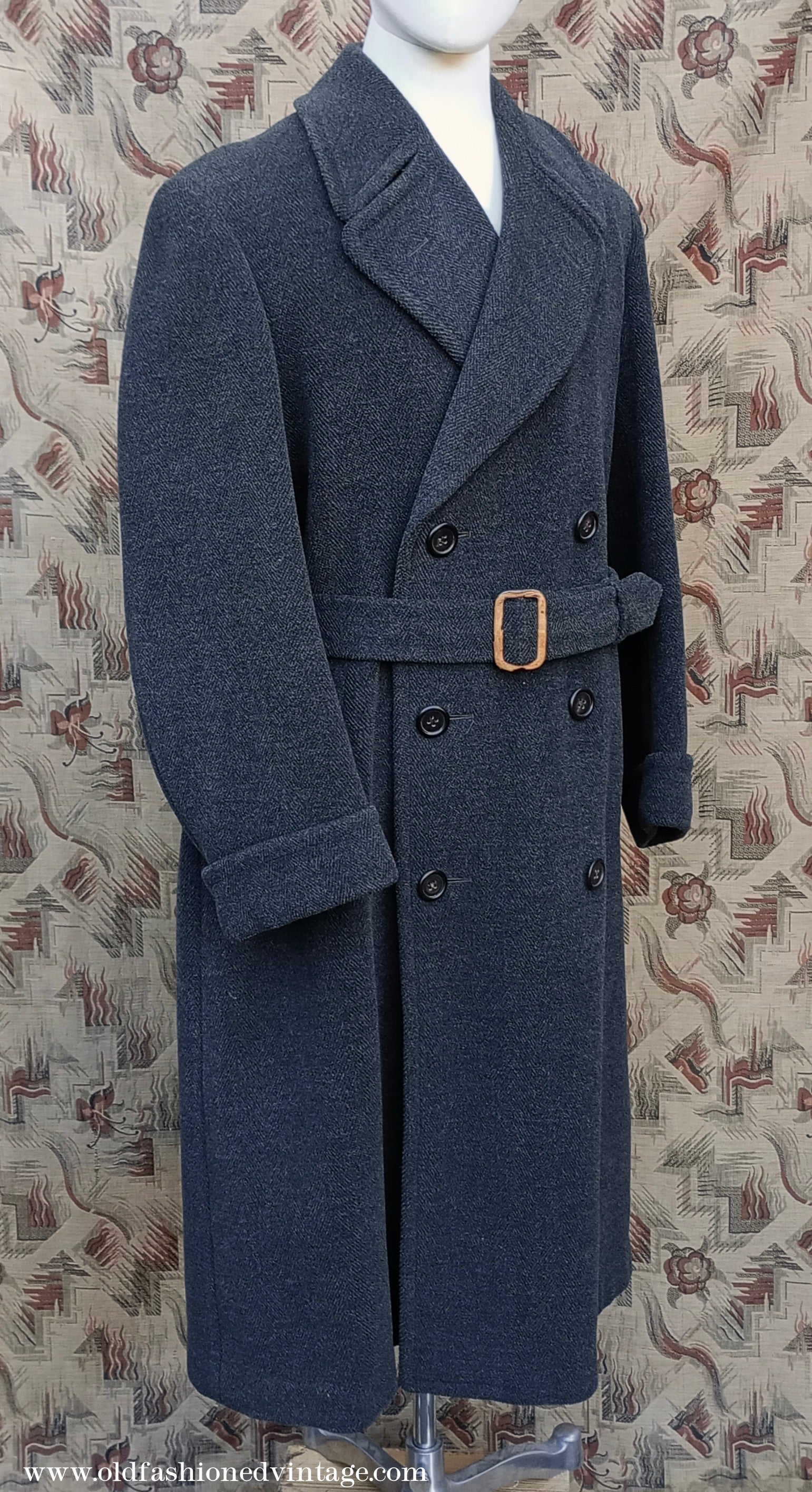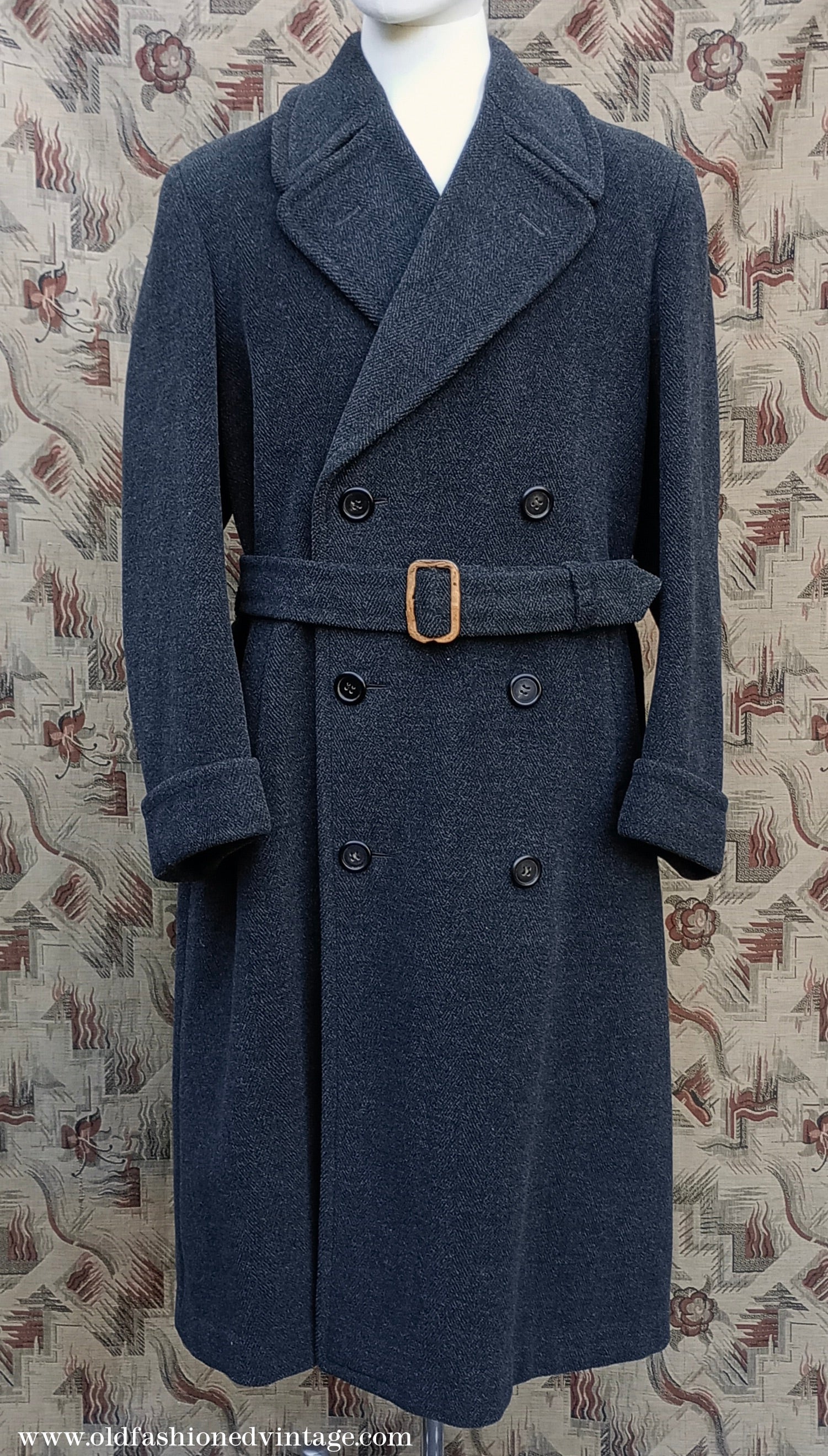 A vintage late 1940s or early 1950s overcoat by 'Brown, Muff & Co.' of Bradford, made from a thick & slightly fleecy herringbone weave wool cloth in a marled dark grey which in certain light has a greenish cast. It is 6-button double-breasted with broad lapels, has medium-padded shoulders, gauntlet cuff turn-backs, 2 lower slash pockets with fleecy linings, & matching belt with a leather-covered buckle. Part lined with black rayon fabric, with an inside breast pocket..