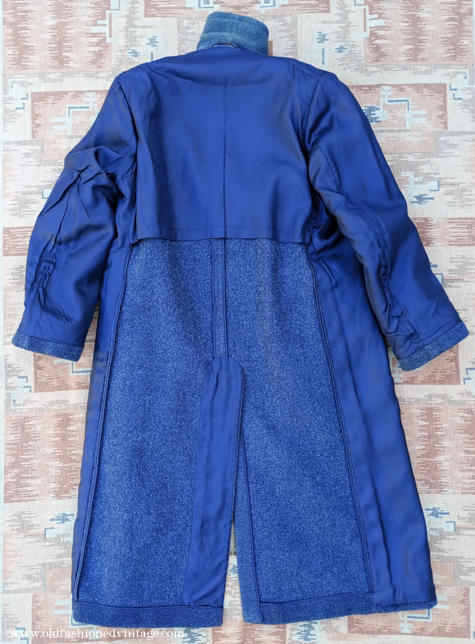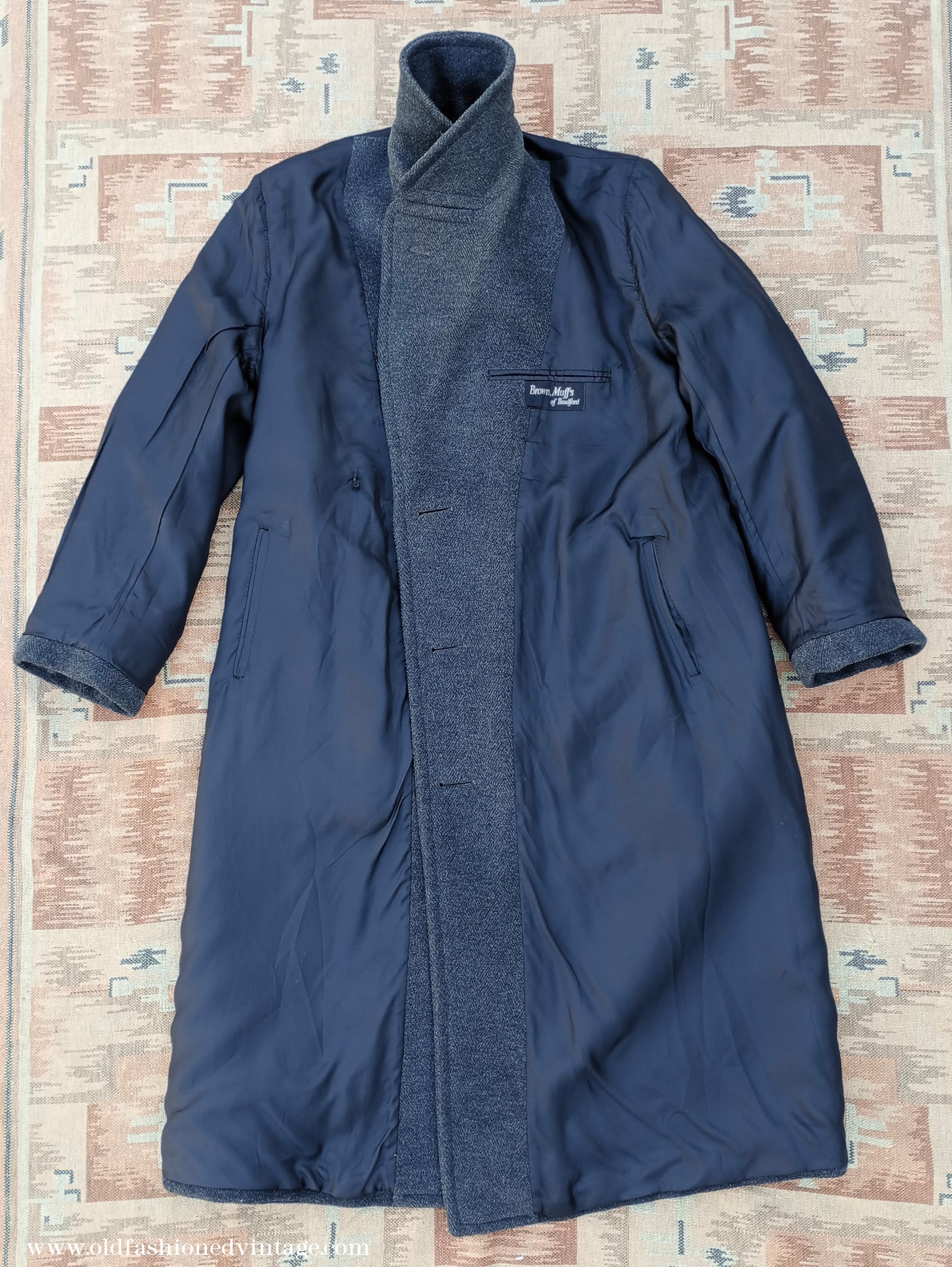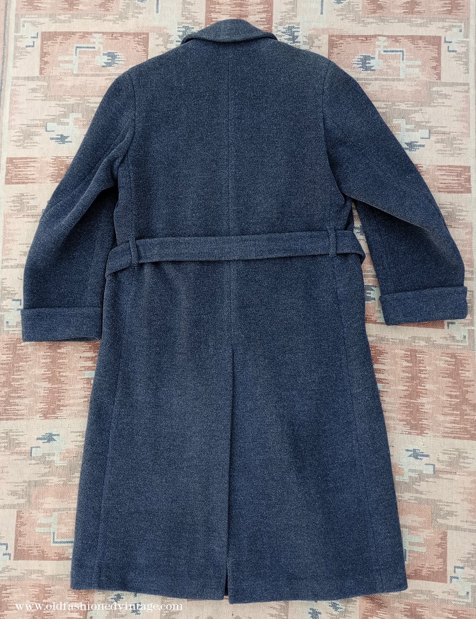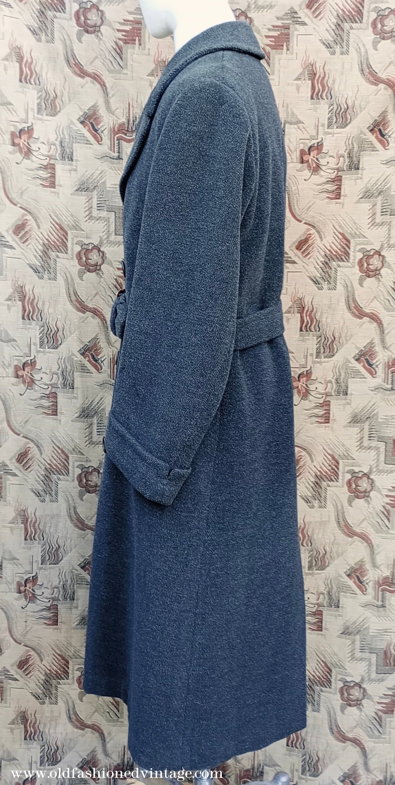 A vintage late 1940s or early 1950s overcoat by 'Brown, Muff & Co.' of Bradford, made from a thick & slightly fleecy herringbone weave wool cloth in a marled dark grey which in certain light has a greenish cast. It is 6-button double-breasted with broad lapels, has medium-padded shoulders, gauntlet cuff turn-backs, 2 lower slash pockets with fleecy linings, & matching belt with a leather-covered buckle. Part lined with black rayon fabric, with an inside breast pocket..