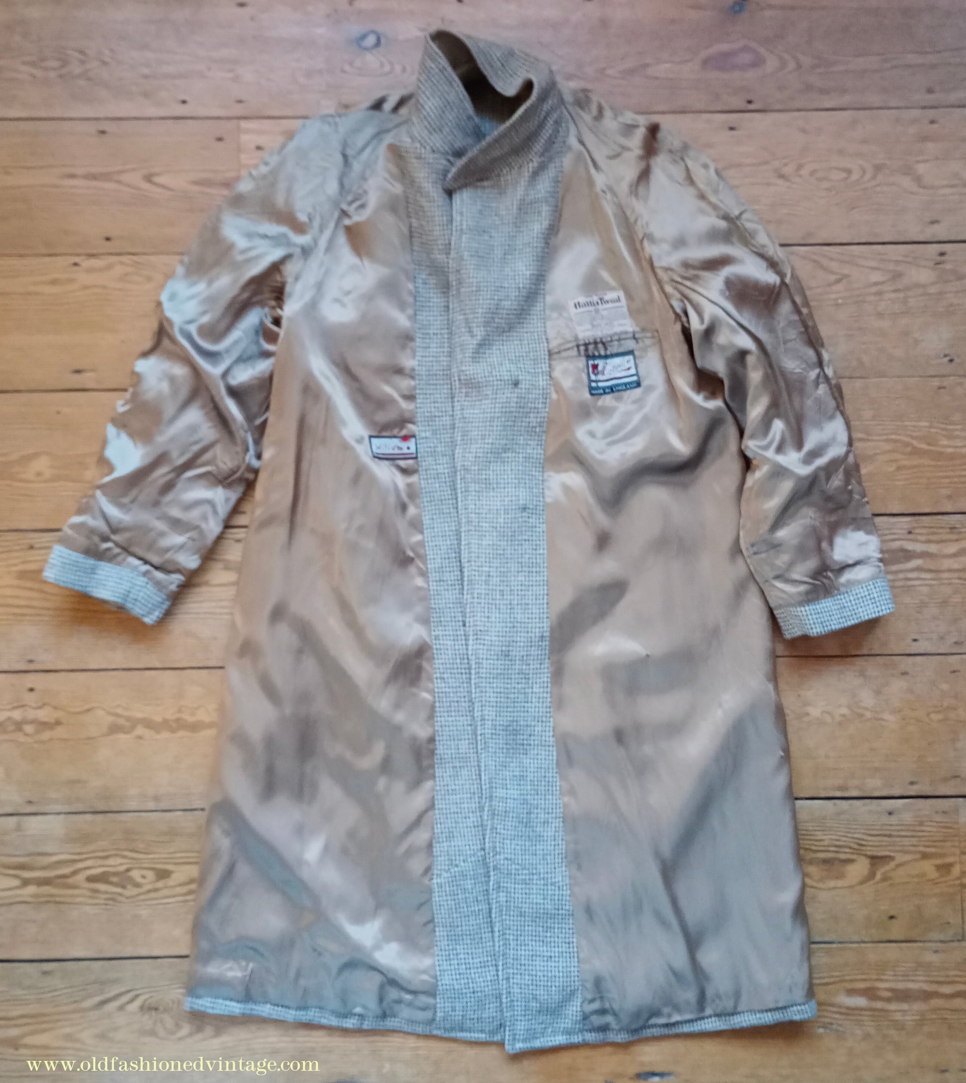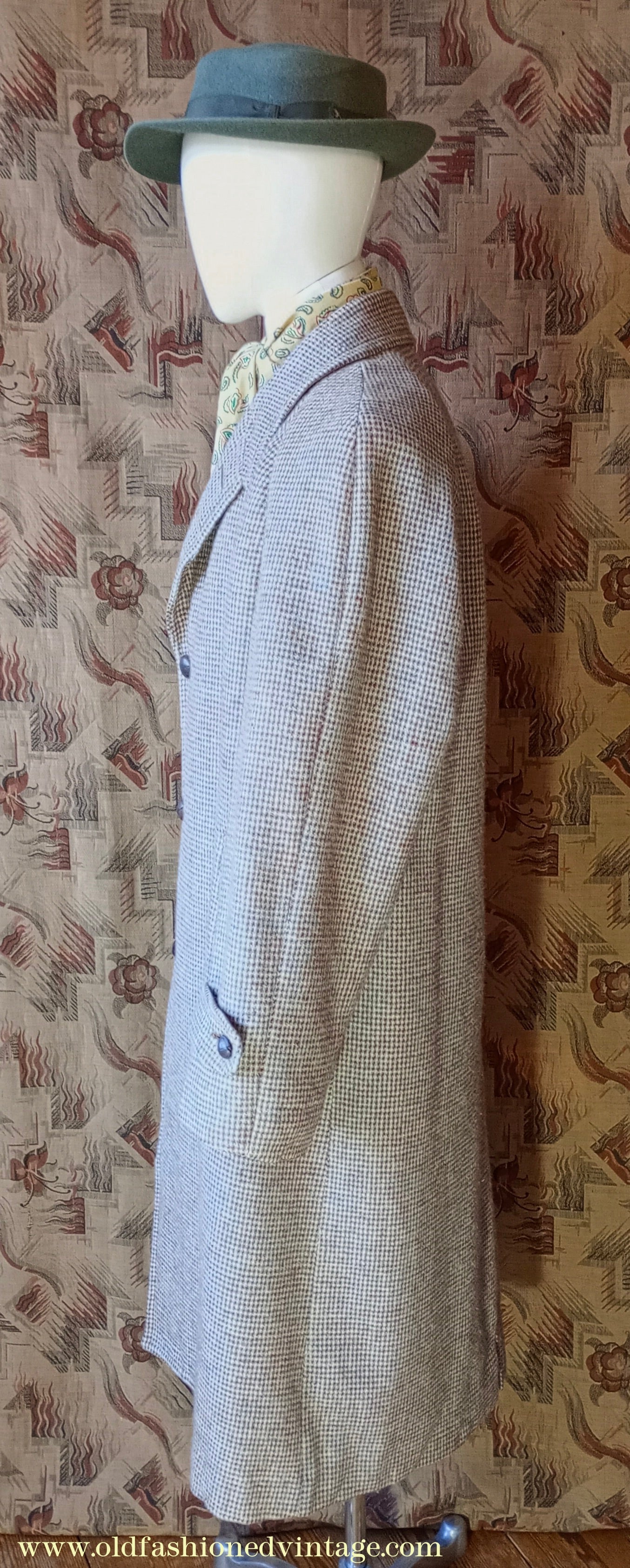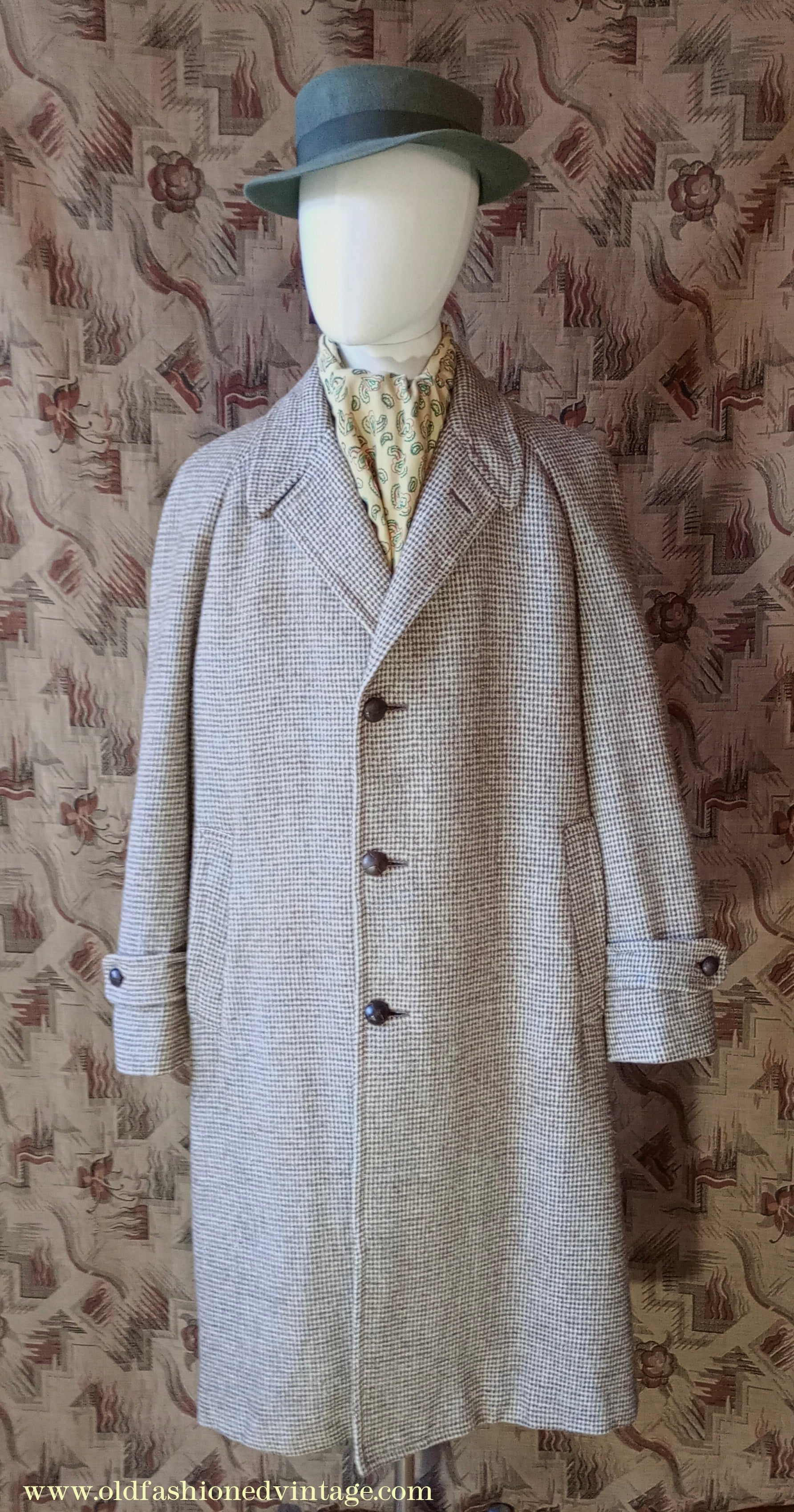 A vintage mid 1950s Harris Tweed Raglan sleeve or Balmacaan type overcoat, made by the well-known London outfitters 'Alexandre' from 100% pure wool in a classic mini check weave in shades of brown, pale blue & natural. Fairly loose, easy-fitting cut - single breasted 3-button fastening with pointy collar - long cuff tabs - lower slash pockets - leather 'football' buttons - rear kick vent - fully lined with goldy-beige rayon fabric & 'Milium' interlining with 1 inside chest pocket. The Harris label bears the 'Applied in accordance' text which I believe came into use in about 1954.