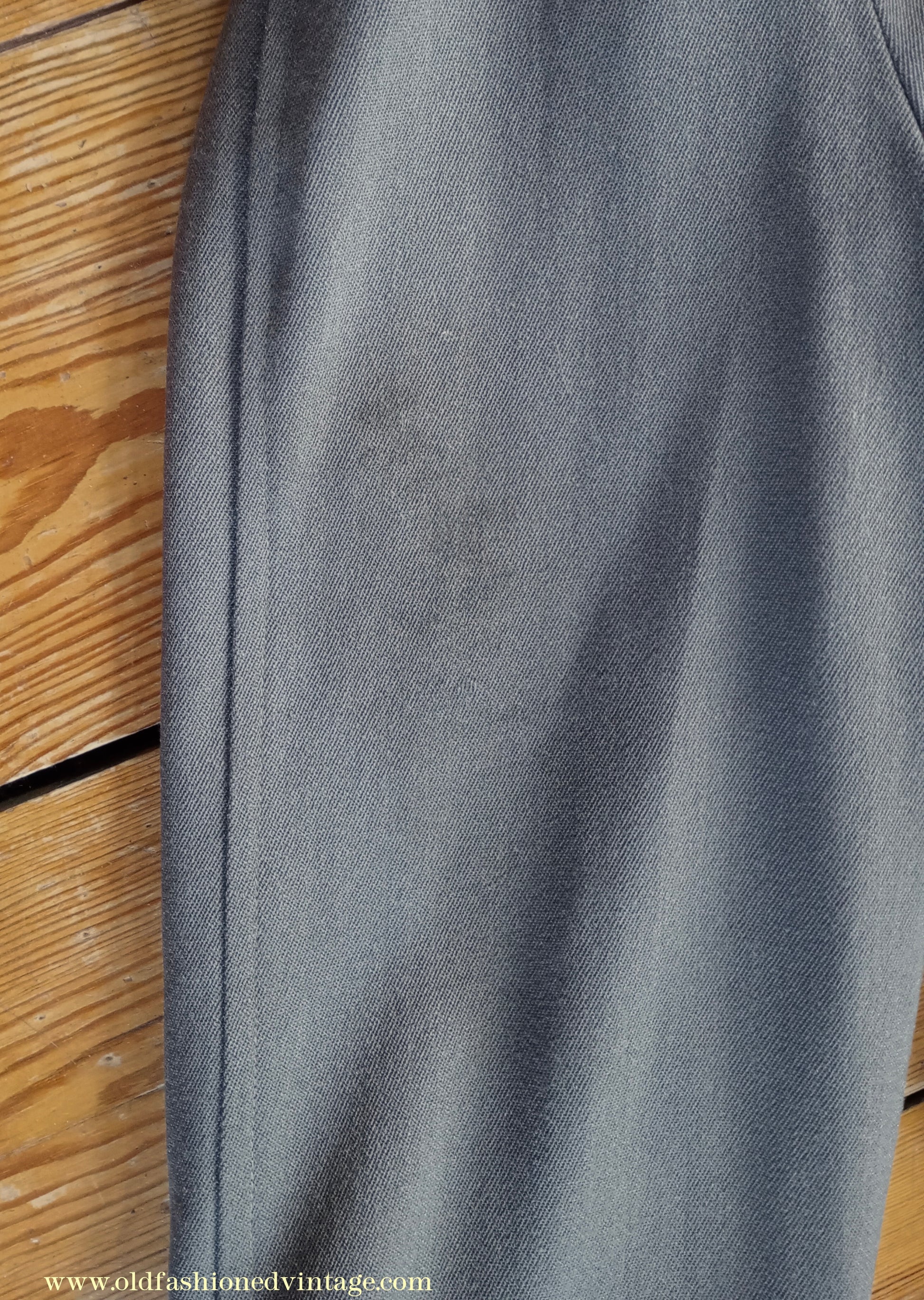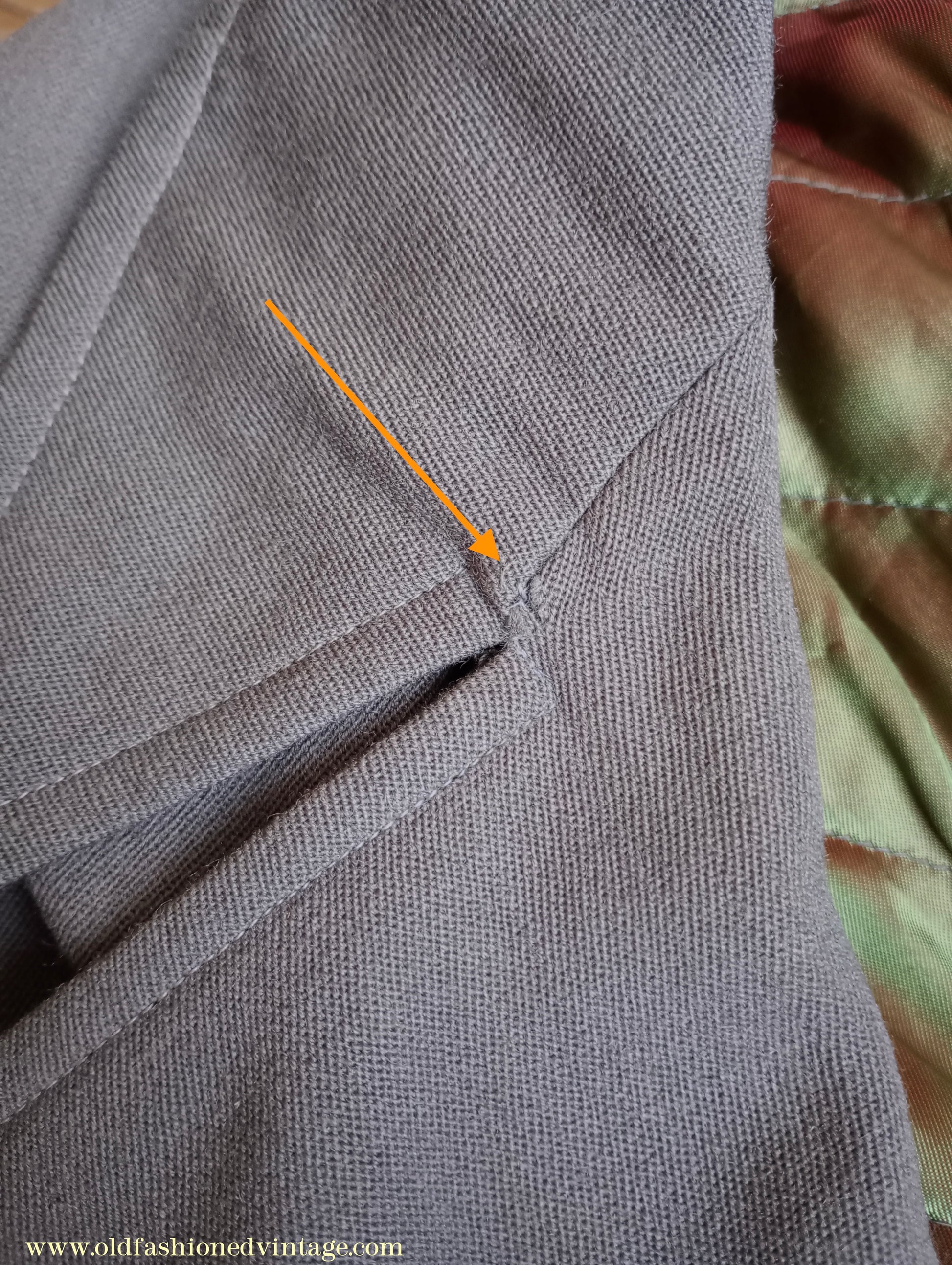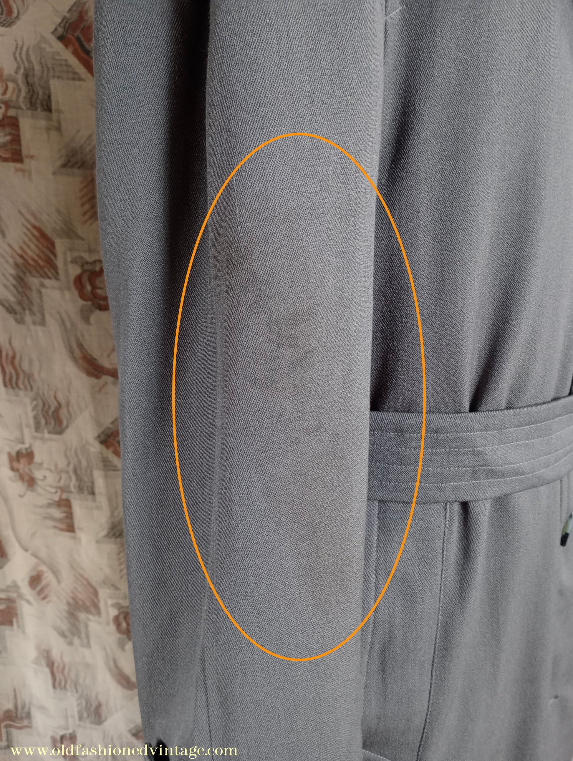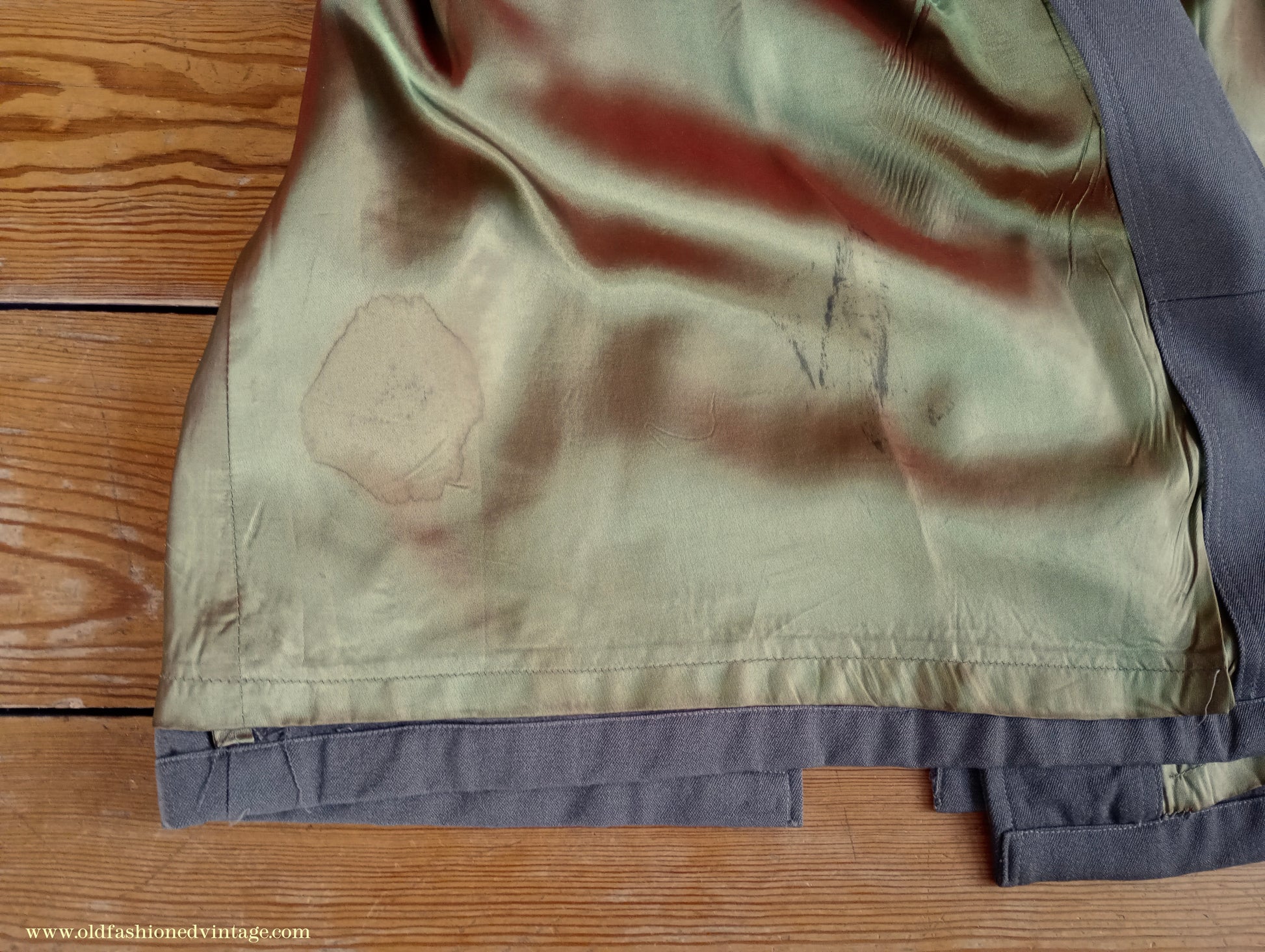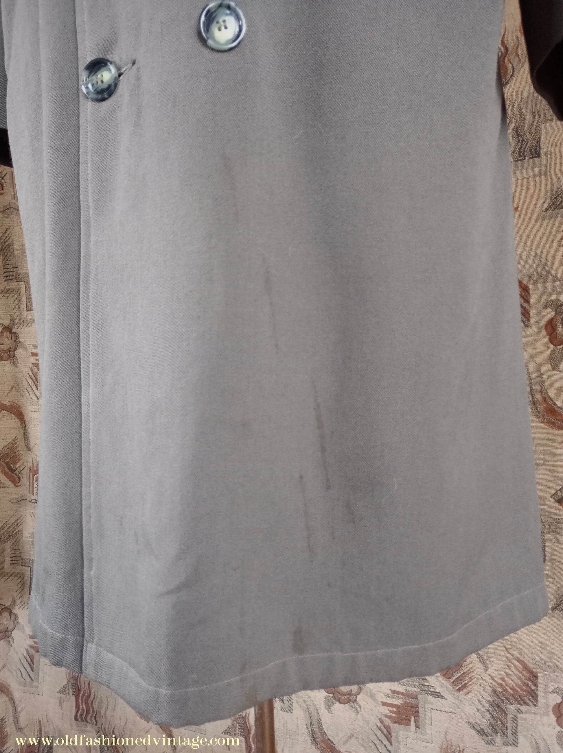 In very good condition overall - appears little worn but has some faint dark splash marks on the skirt front, which have bled through to the lining - a patch of faint dark marks with a surrounding 'puddle' on the right sleeve - a small frayed area in the right lapel notch, which looks more like a manufacturing defect - a tiny split in the seam at the right armpit & a small dark mark nearby - the leather buckle is a bit dry - the button is missing from the kick vent. Has been thoroughly steamed prior to listing but not cleaned.
