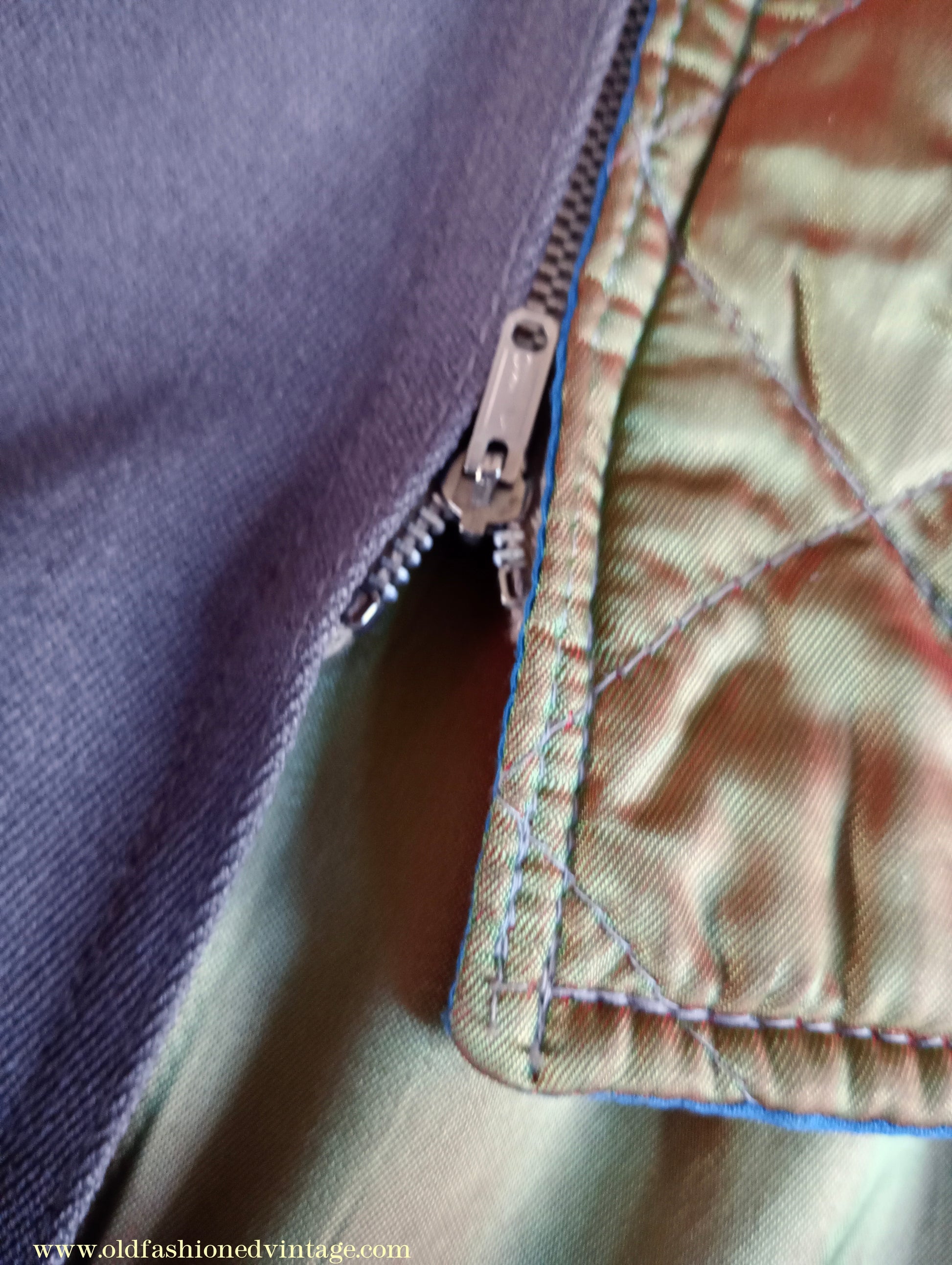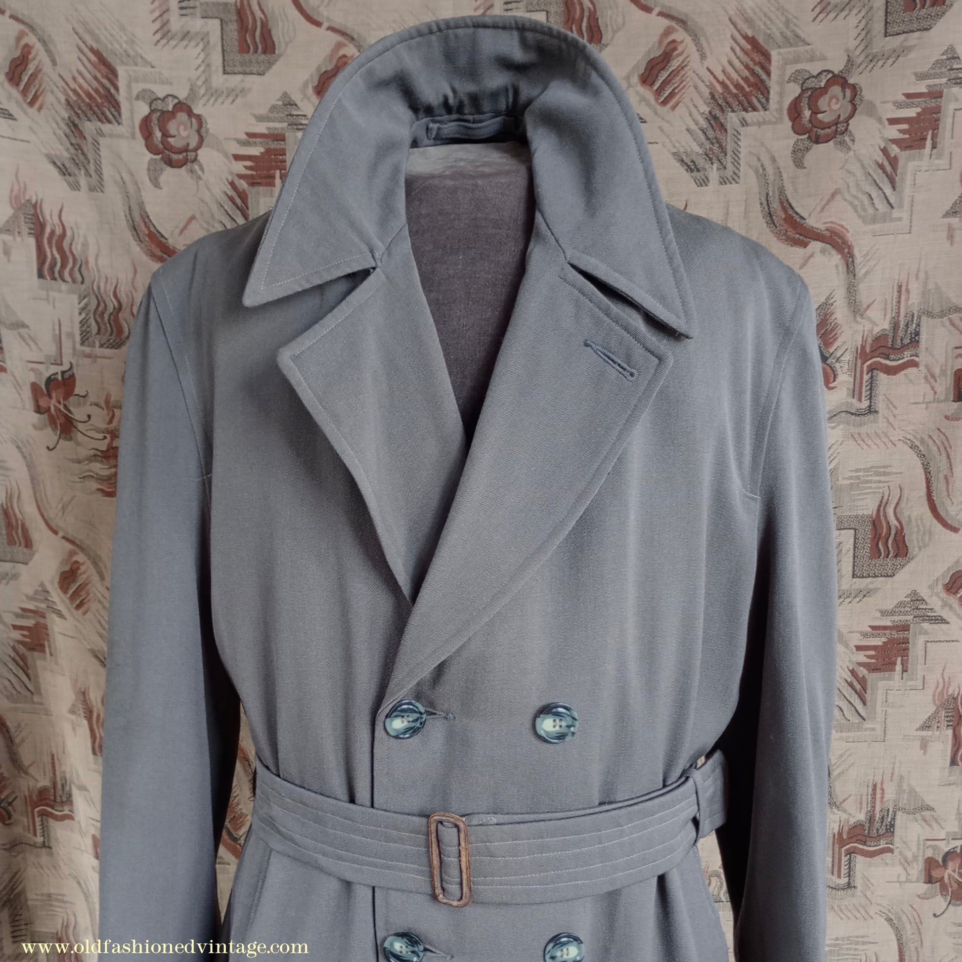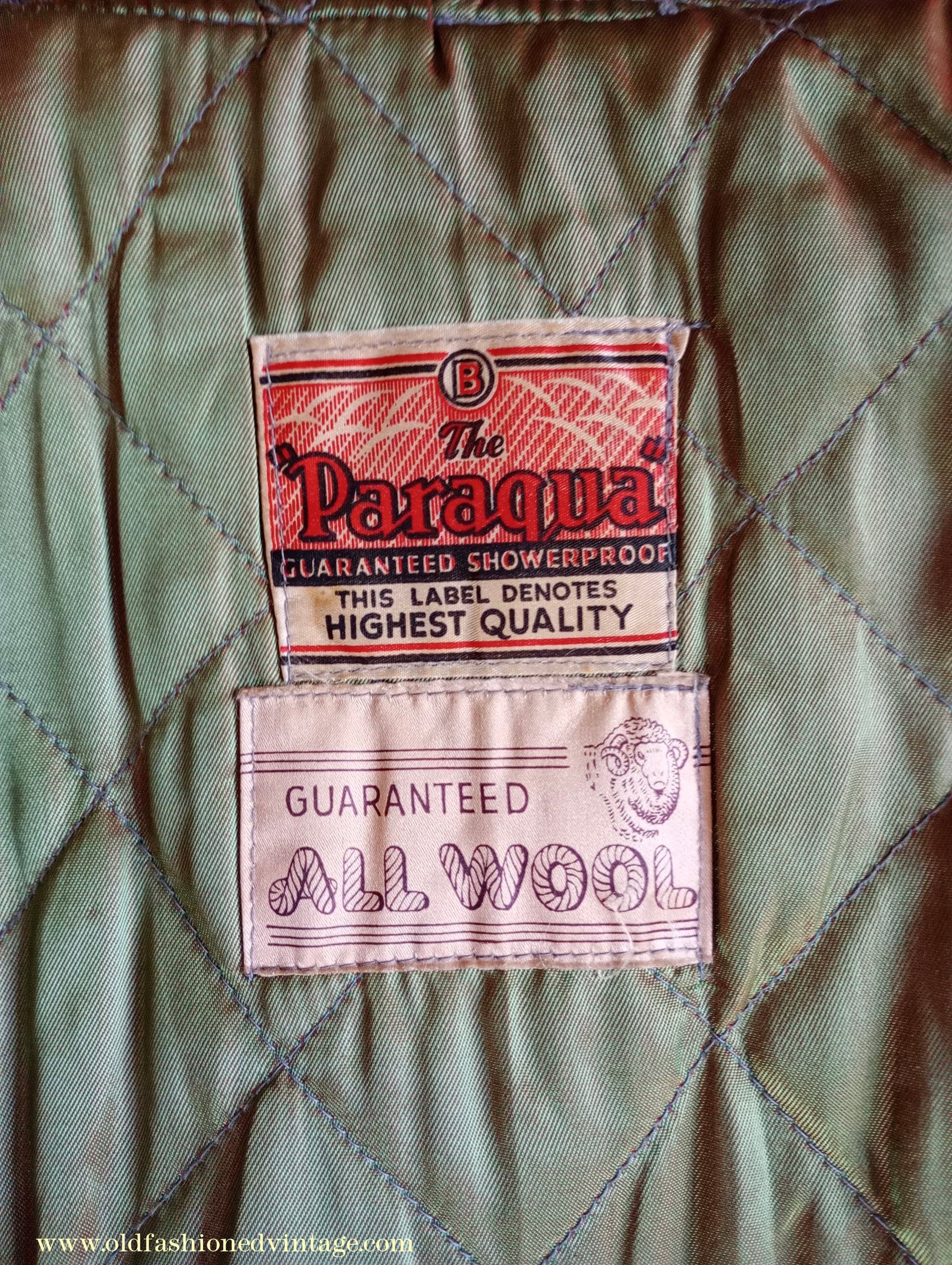 A vintage 1950s 'Paraqua' rain or trench coat made from all wool gabardine-type fabric in a dark taupe colour. Cut in a classic double-breasted style, it has padded shoulders, cuff tabs, slash pockets, kick vent, & matching belt with leather-covered buckle; fitted with attractive blue-grey marbled plastic buttons. Fully lined with iridescent coppery-green satin fabric and complete with zip-out quilted liner in the upper body, to which the nicely graphic labels are attached.