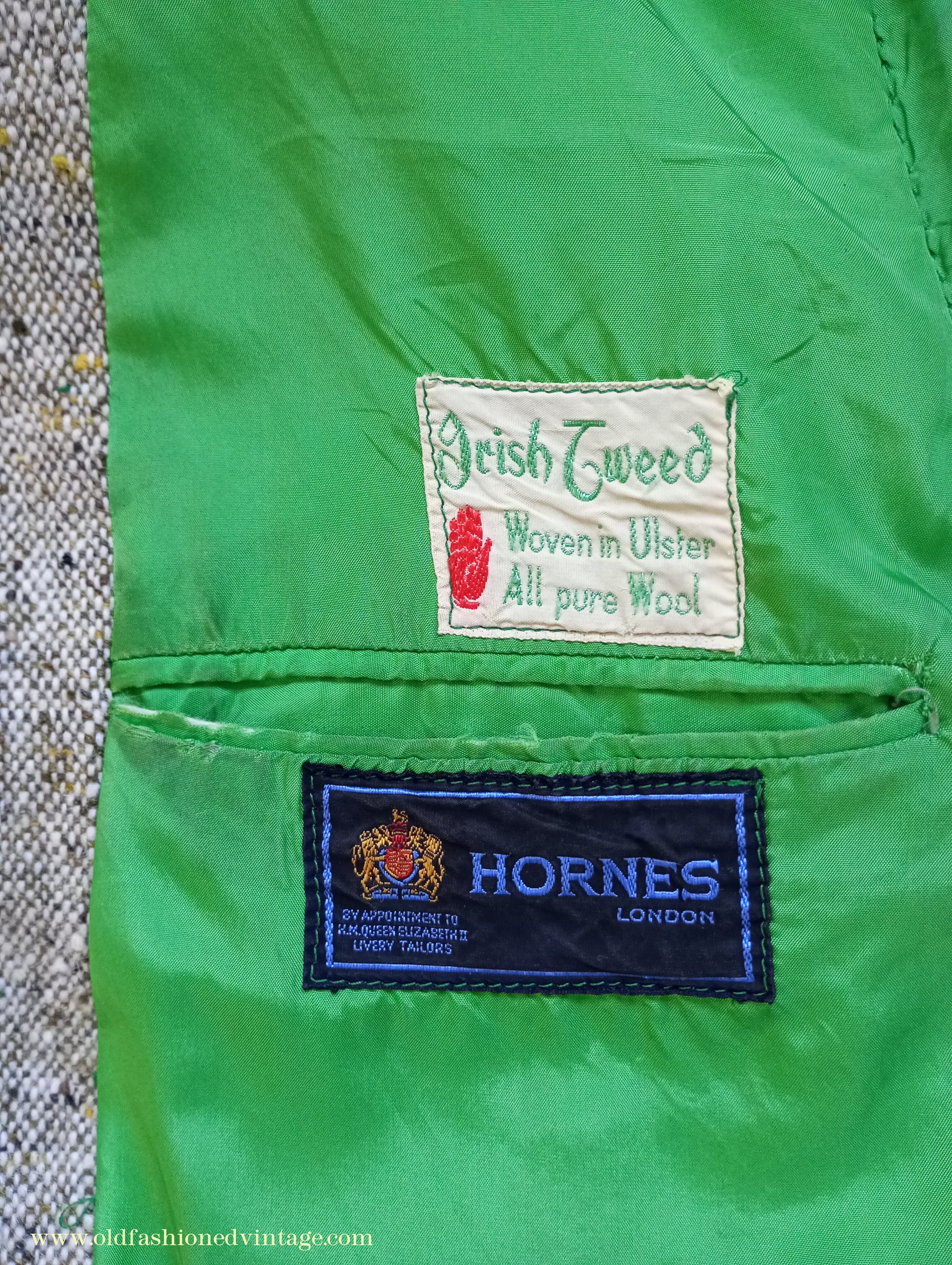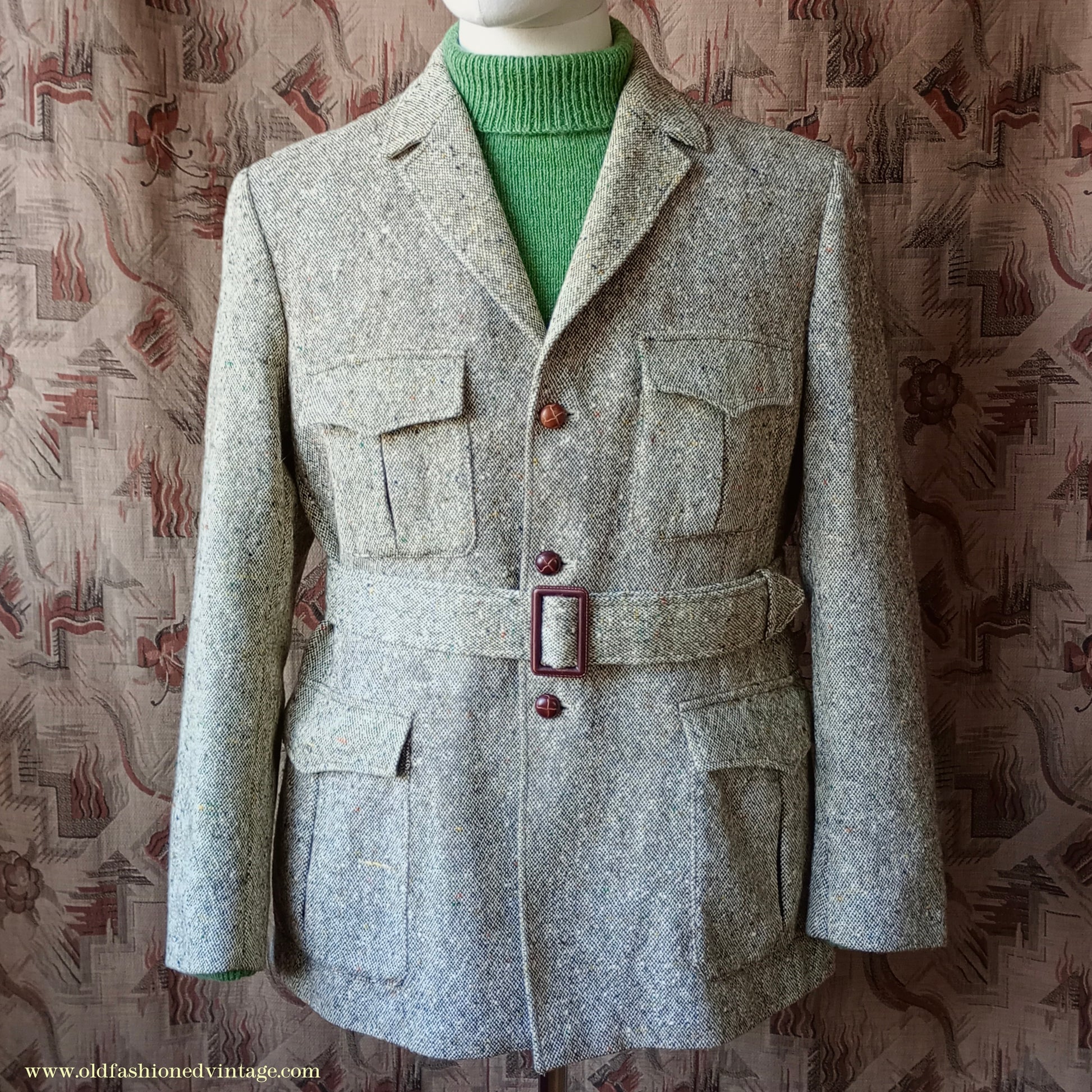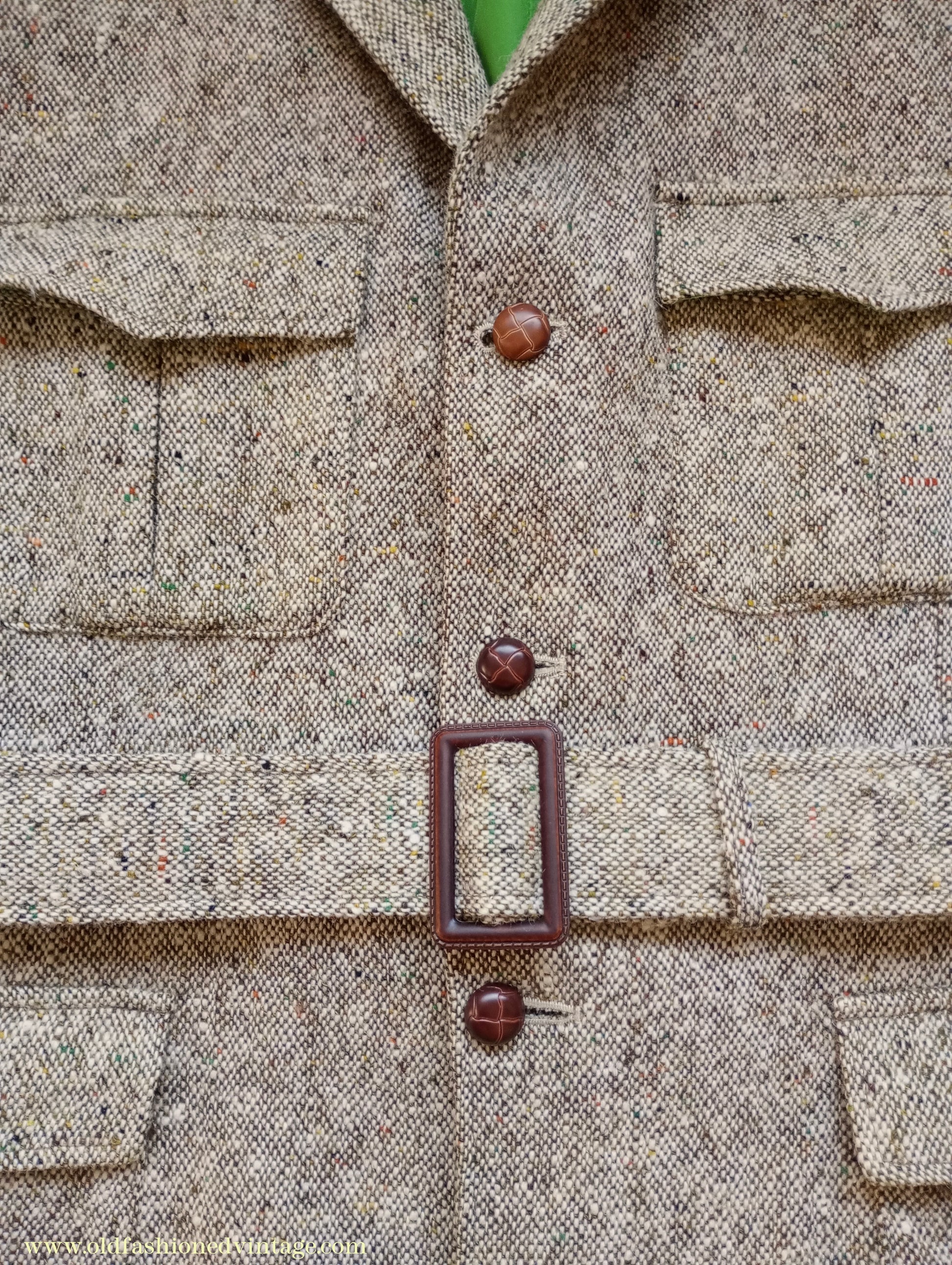 A great looking vintage 1970s country or sports jacket, made by the well-known mens outfitters 'Hornes' from a beautiful Donegal type Irish tweed fabric in shades of brown, natural & green with multicoloured flecks which is best shown in the close ups; my camera makes the colour look uneven in some photos but it is not in real life. Cut in a military or safari style, with single-breasted 3 button fastening, slim fish-mouth lapels, 4 pleated patch pockets with scalloped flaps, lightly padded shoulders, rear shoulder yoke & centre box-pleat running into a vent, matching full belt but no belt loops; fitted with plastic leather-effect football-type buttons & buckle, fully lined in vibrant green acetate fabric, 1 inside pocket.