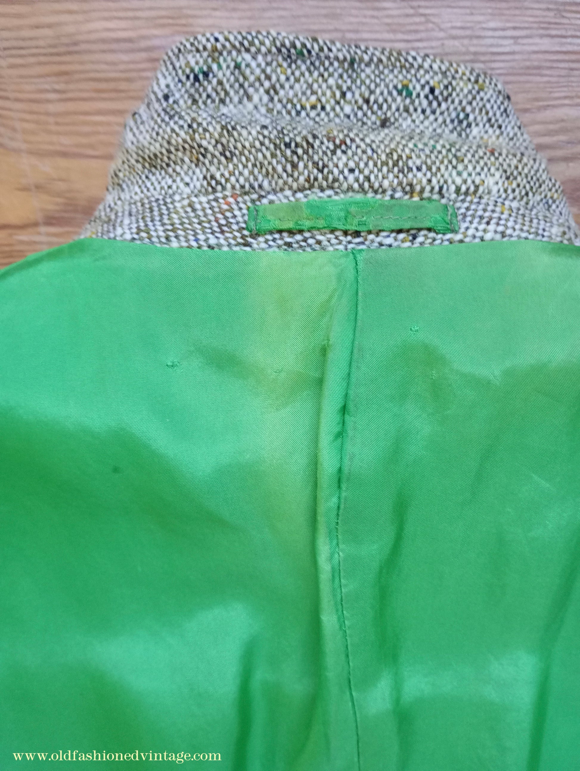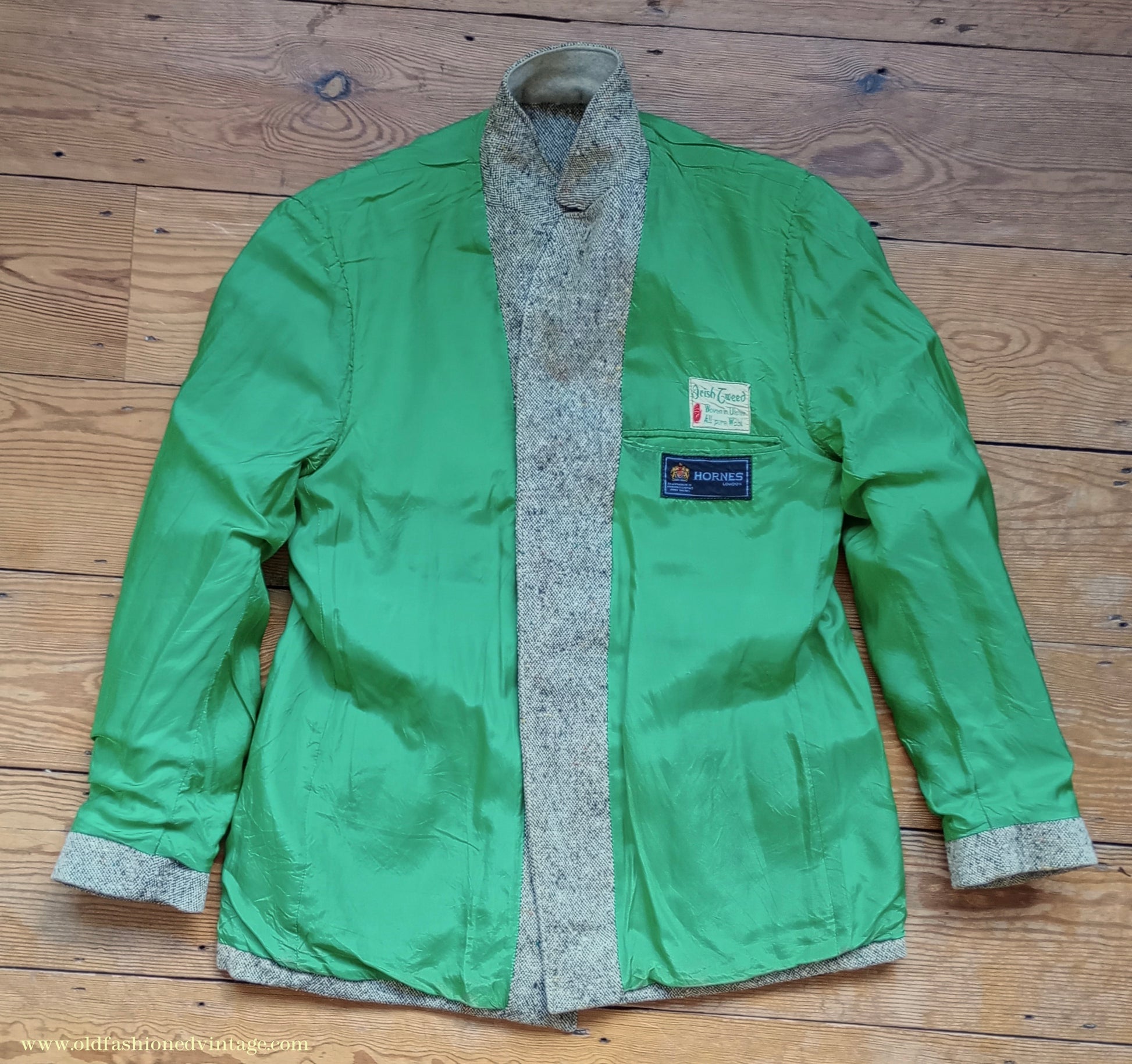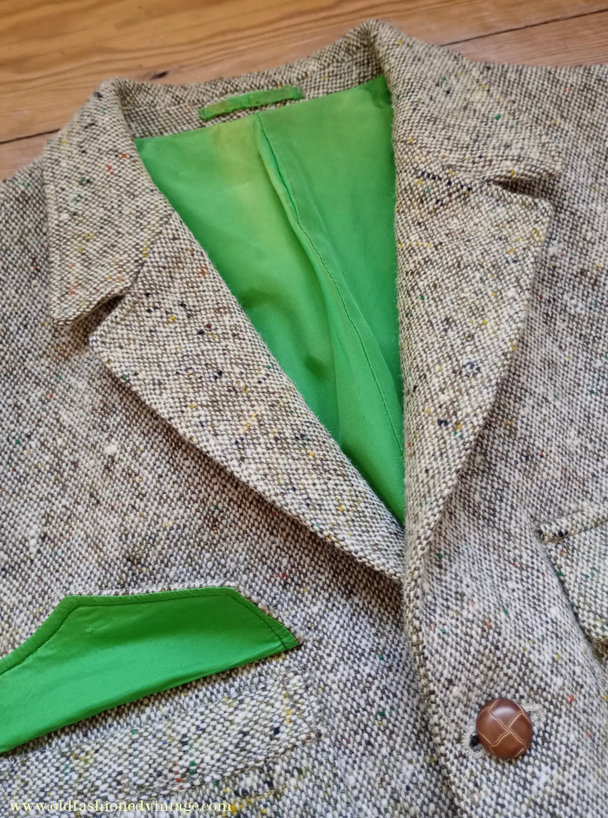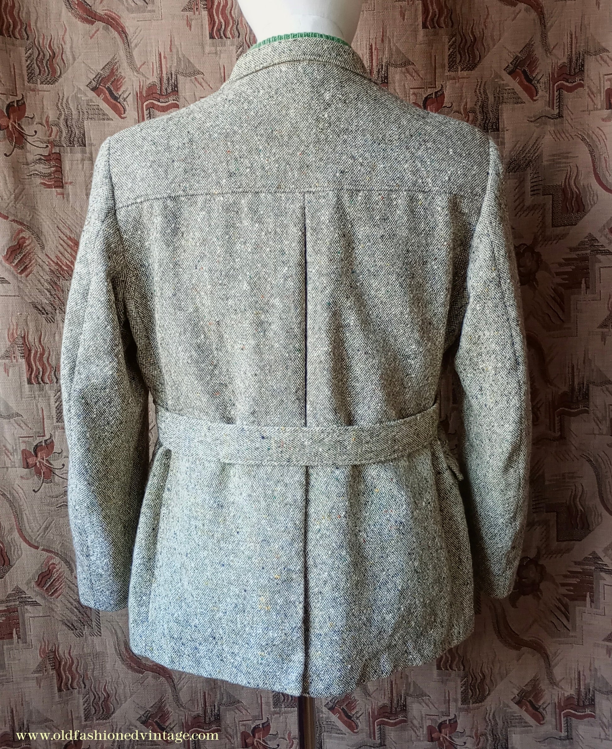 A great looking vintage 1970s country or sports jacket, made by the well-known mens outfitters 'Hornes' from a beautiful Donegal type Irish tweed fabric in shades of brown, natural & green with multicoloured flecks which is best shown in the close ups; my camera makes the colour look uneven in some photos but it is not in real life. Cut in a military or safari style, with single-breasted 3 button fastening, slim fish-mouth lapels, 4 pleated patch pockets with scalloped flaps, lightly padded shoulders, rear shoulder yoke & centre box-pleat running into a vent, matching full belt but no belt loops; fitted with plastic leather-effect football-type buttons & buckle, fully lined in vibrant green acetate fabric, 1 inside pocket.