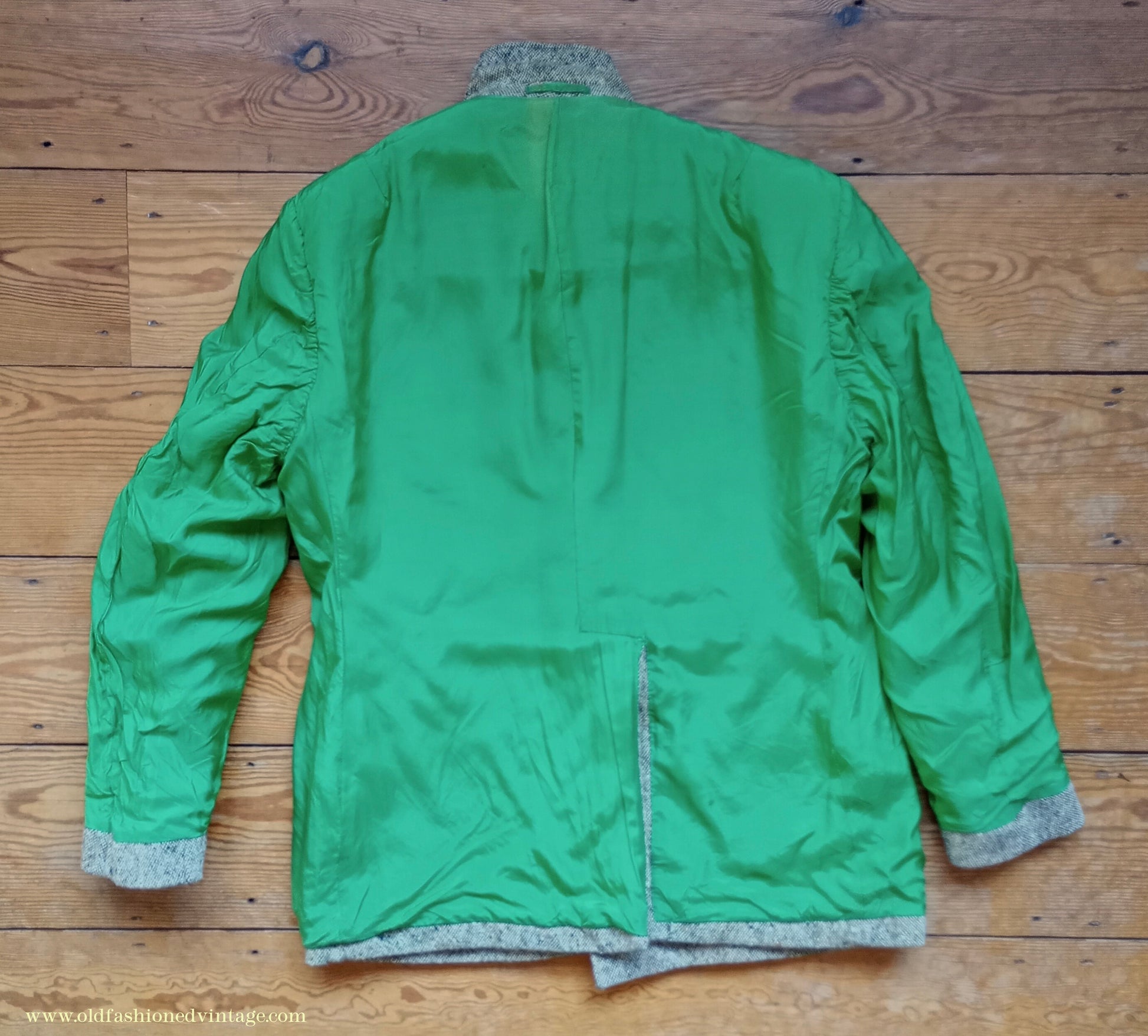 In very good to excellent condition overall - externally minor signs of use - the top button is slightly different to the others - I imagine there were originally belt loops but they are absent; it would be quite simple to make some from the end of the belt if desired - internally the lining has some fading, scuffs, small holes & marks, some wear around the pocket top, a small fray at the top of the vent. Has been thoroughly steamed & brushed prior to listing but not cleaned; the jacket has a Febreze or perfumed smell.