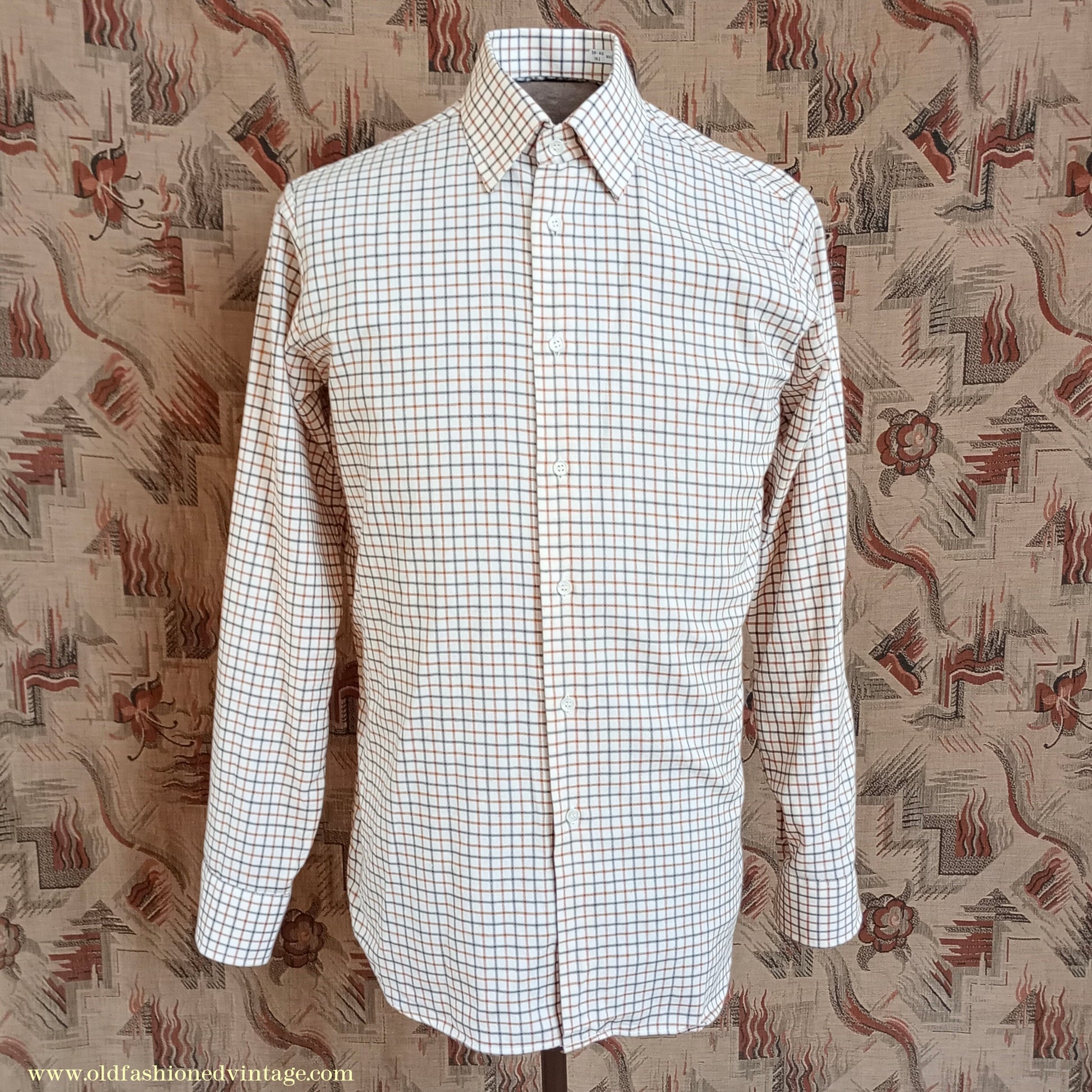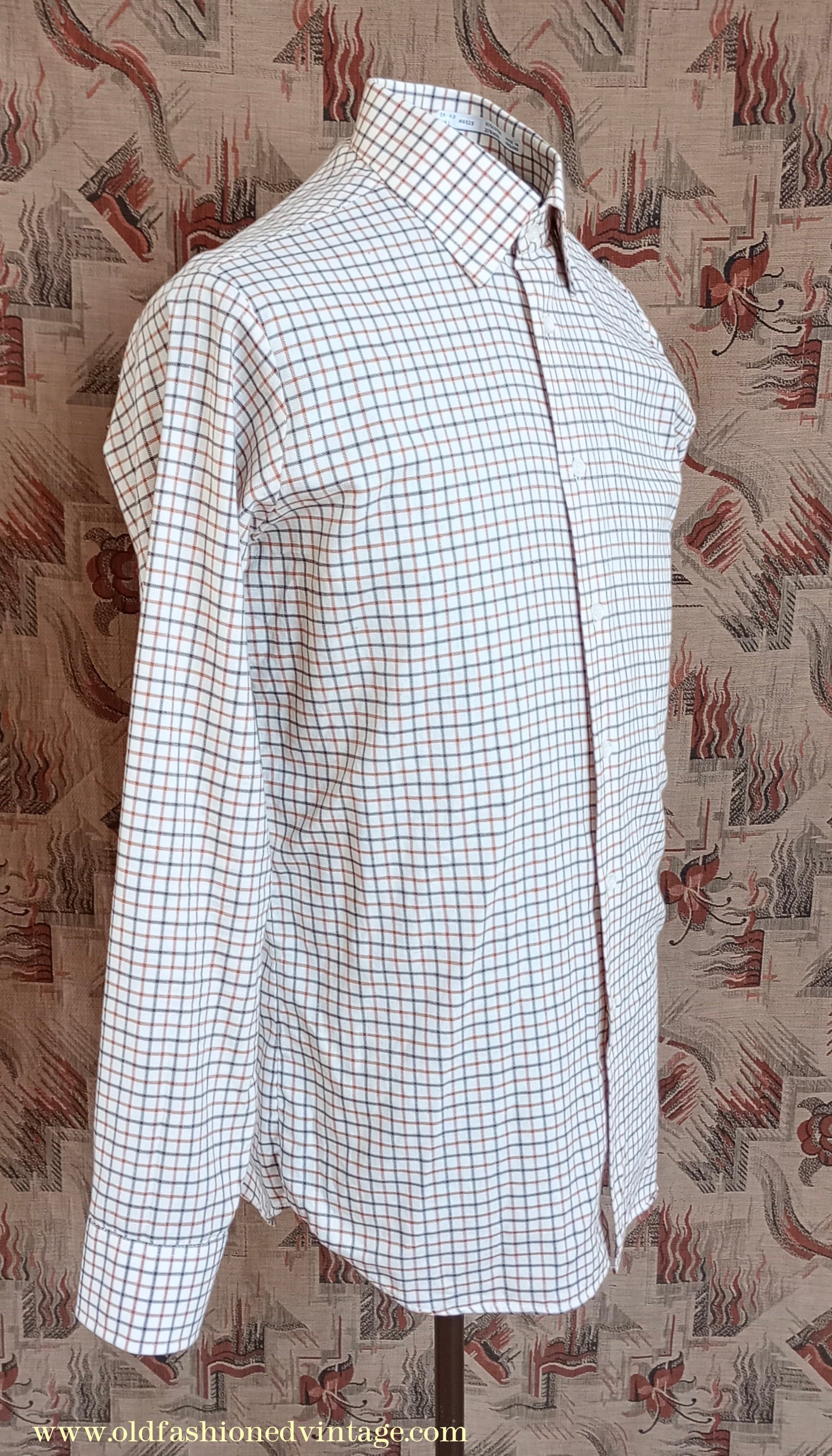 An unworn vintage circa 1980s 'Clydella' shirt, made from 20% wool/80% cotton fabric in cream with brown Tattersall checks. It has quite a trim cut, with a fairly tall, squarish collar, full front opening, curved tails, & long sleeves pleated into buttoned cuffs with two buttonholes so that cufflinks can be worn.
