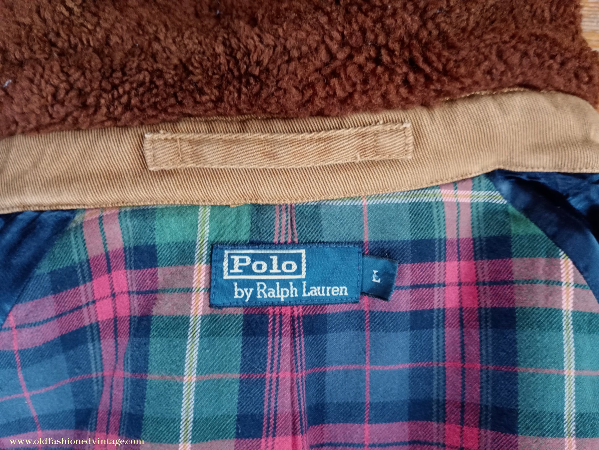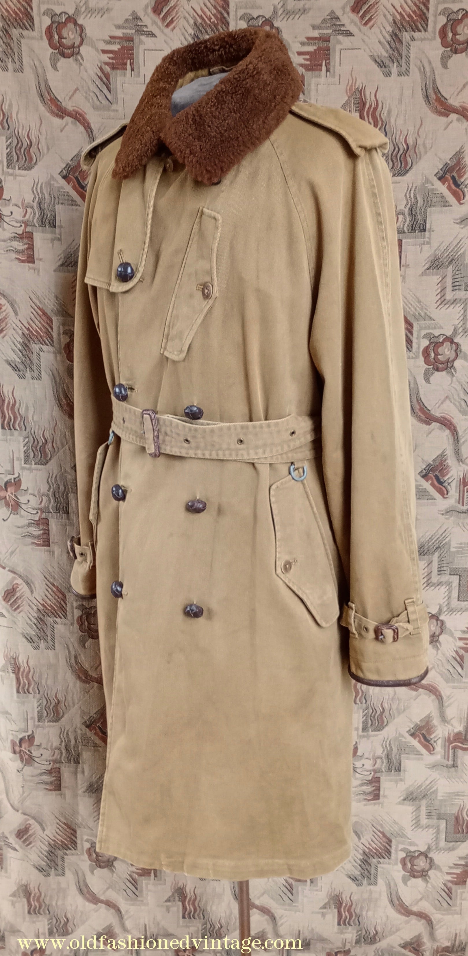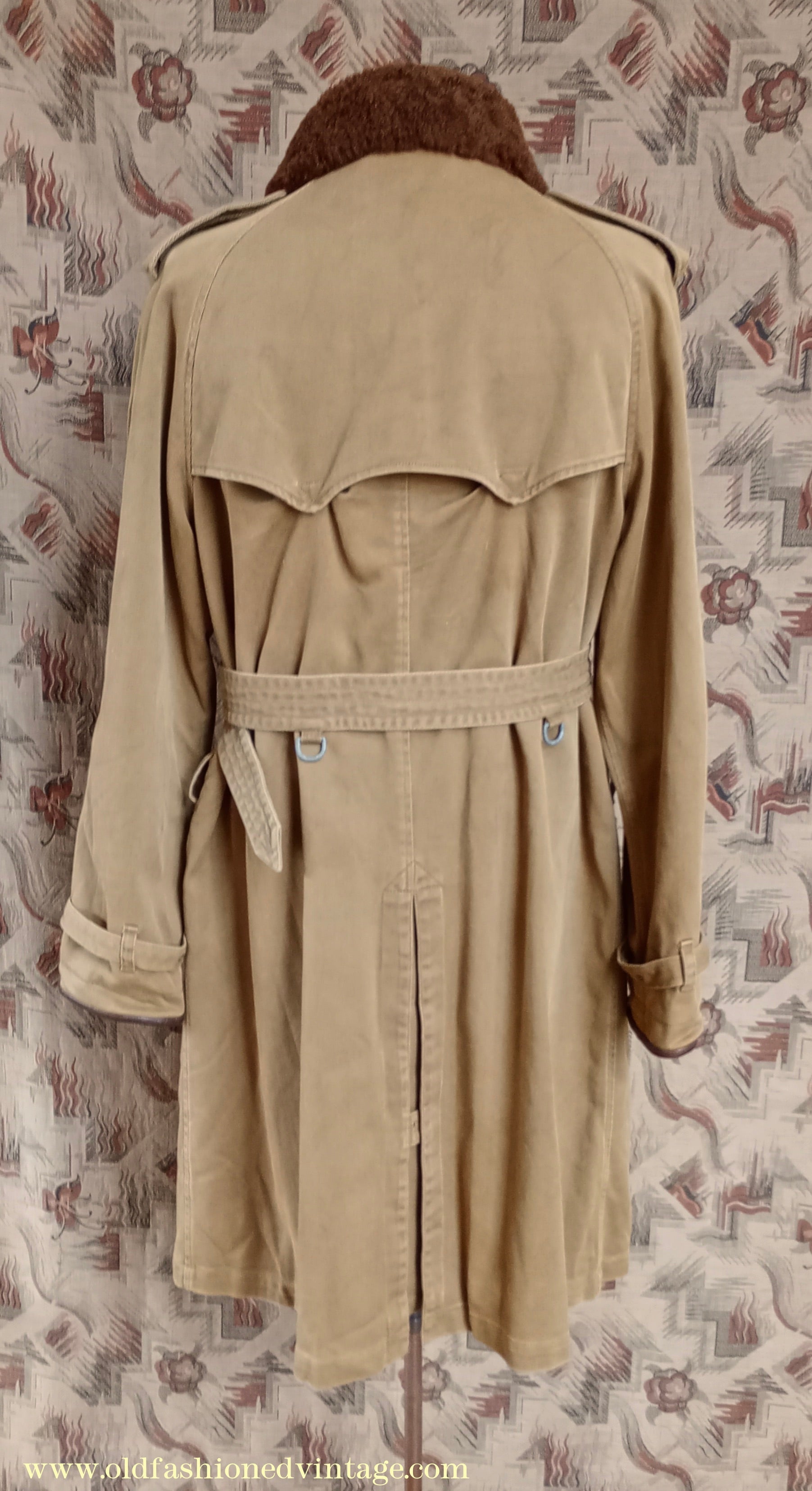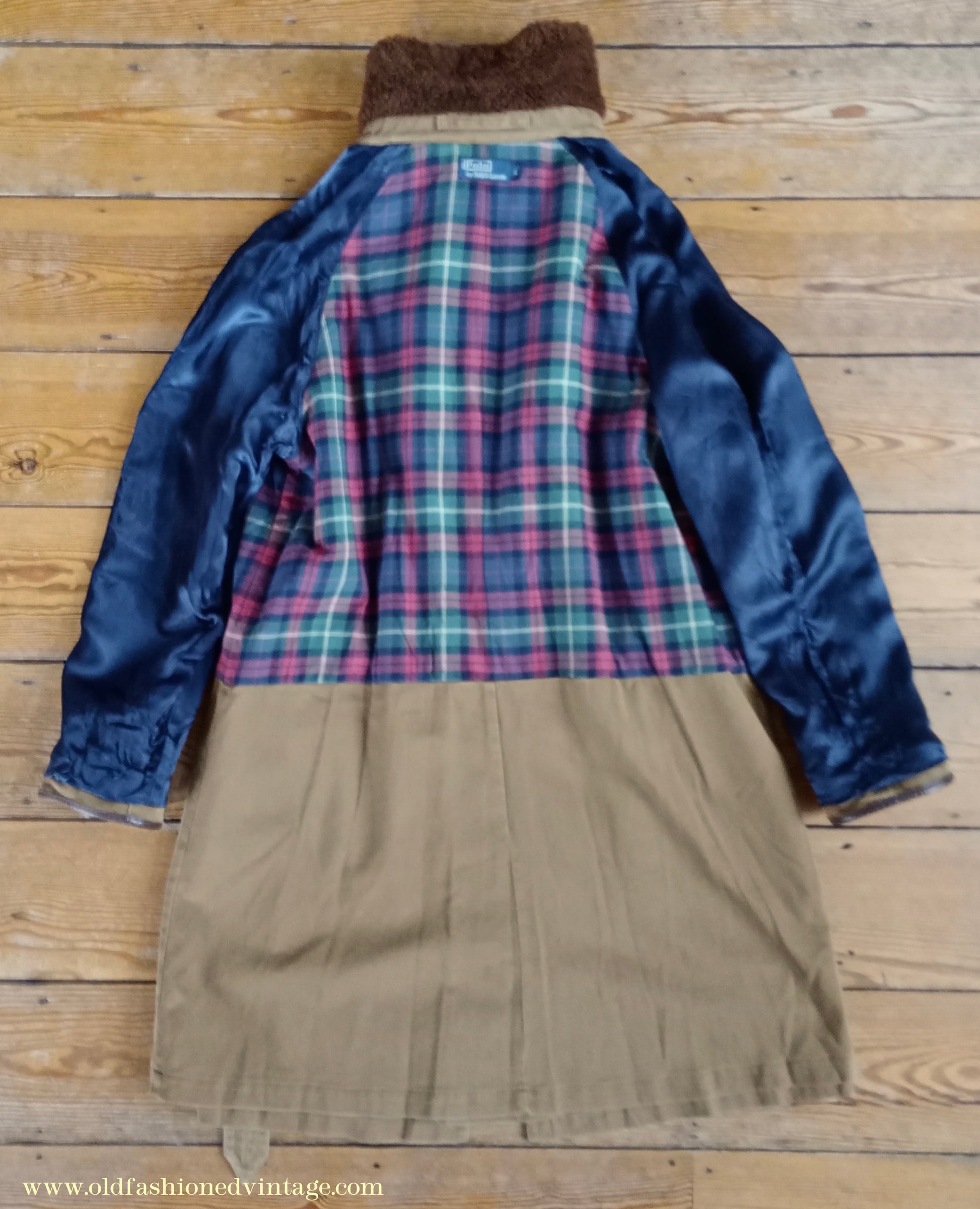 A great-looking vintage Polo Ralph Lauren raglan sleeve trench coat with mouton fur collar, exact age unknown but maybe circa 2000s, made from thick cotton twill fabric in a sandy brown khaki colour, lined with plaid cotton flannel in the upper body & blue acetate in the sleeves. Clearly inspired by WW1 / 1920s / 1930s aviator & motoring coats, it has a wealth of super details, including generous storm tab at the throat which folds for stowage under the collar, chest map pocket, removable epaulettes, leather cuff trim, leather 'football' buttons, belt & wrist straps with leather-covered buckles, rear kick pleat, external hand warmer pockets & internal patch pockets. In my opinion the coat was designed/made with the belt loops set rather low, so in the main photos the belt is positioned higher up to enhance the period look; additionally the belt is made over-long to allowing for tie-fastening & would be easier to buckle up if shortened.