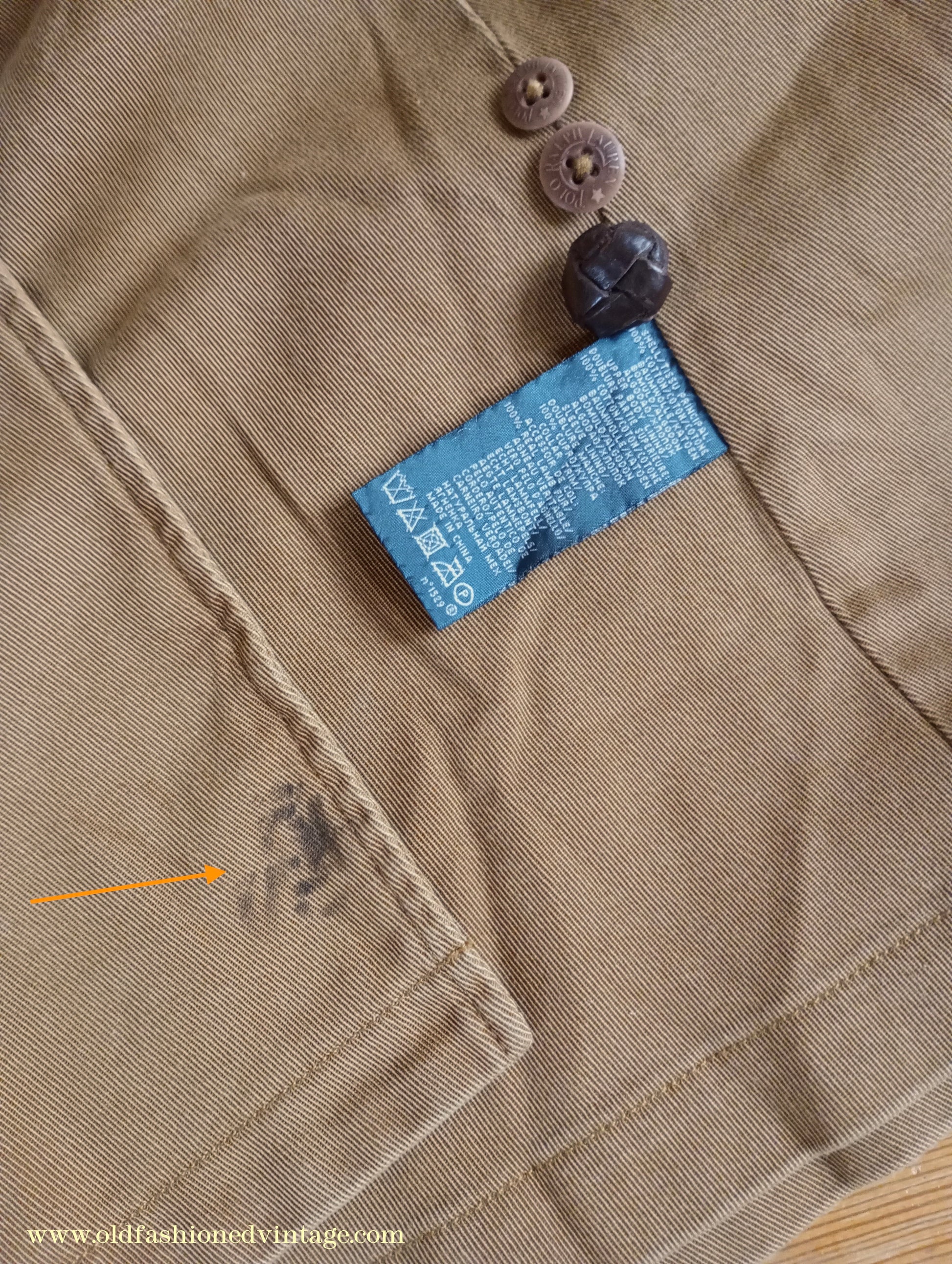 In very good condition overall with some signs of wear & use - there is a slight patina & scattered faint brownish marks - a small hole on the left sleeve - a patch of dark marks on the lower right front corner (hidden when fastened). Has been thoroughly steamed & brushed prior to listing but not cleaned.